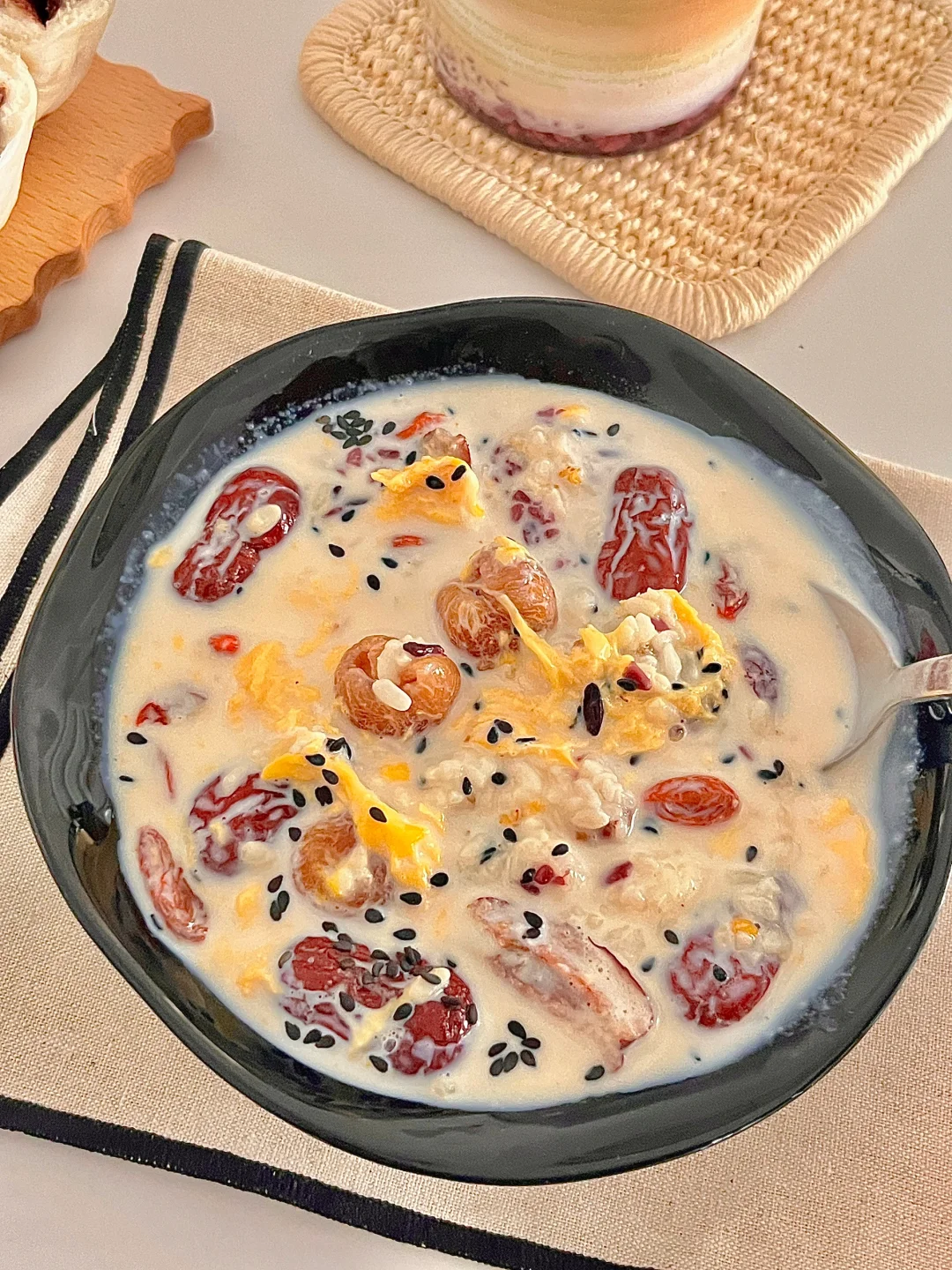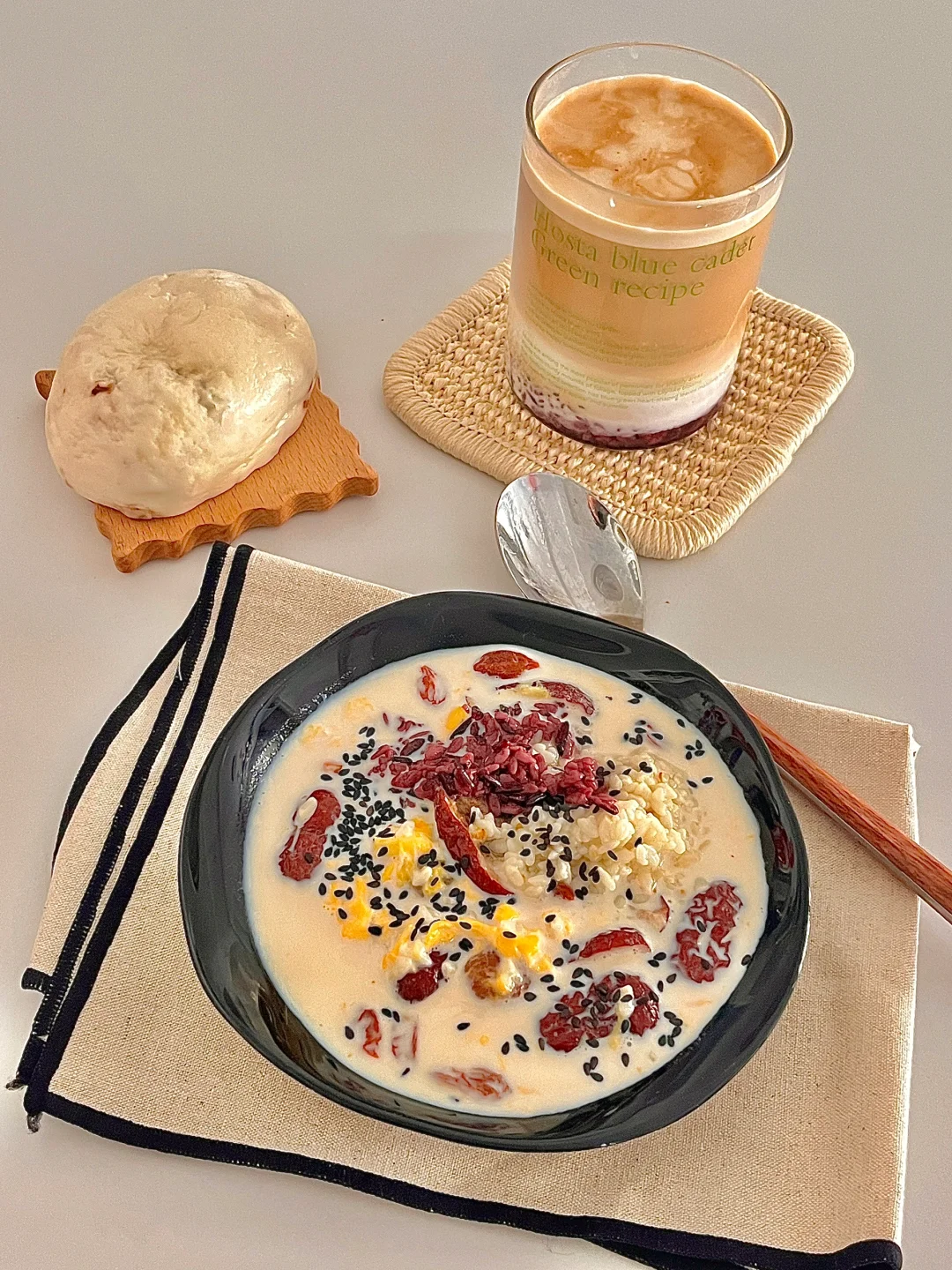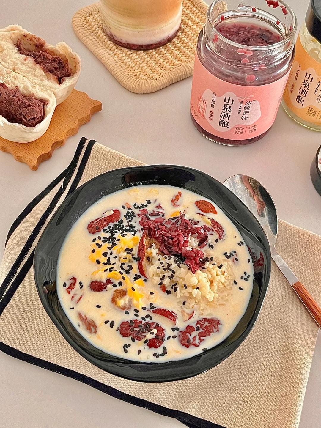 减脂不减气血,今天吃牛奶醪糟鸡蛋➕玫瑰豆沙馒头,还有一杯血糯米酒酿拿铁~香甜爽口,巨好喝, 生理期喝一碗酒酿鸡蛋 暖暖的太舒服啦!酒酿女生吃还是很好滴!也是我减脂期很爱喝的养生低卡小甜品啦~详细做法在图上⬆️ 用的沐酿造物山泉酒酿,一个血糯米和桂花糯米的,无醇有机 0蔗糖,没有乱七八糟的添加~减脂期适量吃可以~