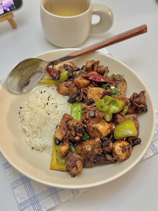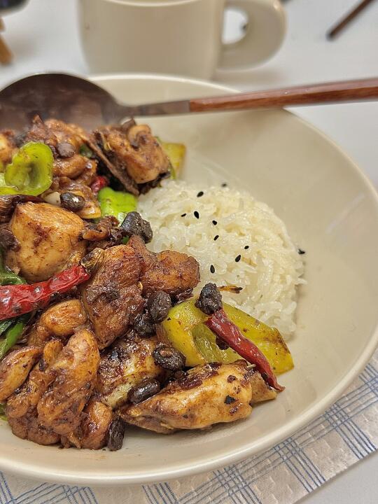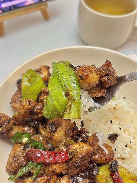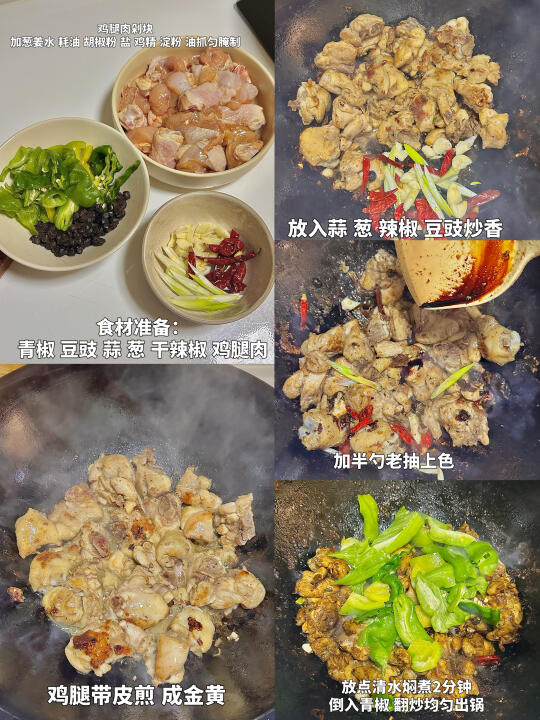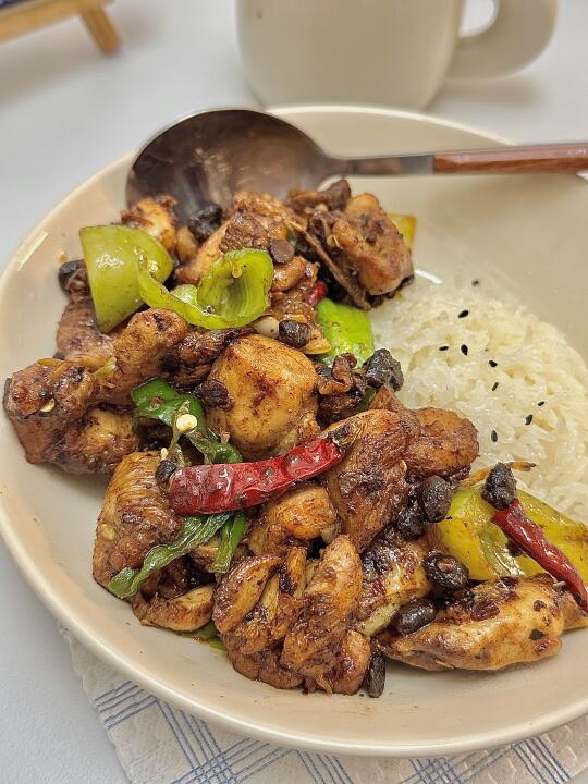 年味从这一口开始 没想到豆豉➕鸡肉那么香,豆豉的咸香和鸡肉的鲜美搭配巨下饭,香香辣辣的泰好吃啦!生活化减脂太快乐了,还没这样吃的姐妹快去试试呀~ 🥬食材:鸡肉,豆豉,青椒,葱蒜 ,干辣椒 👩🏻🍳做法: 1️⃣鸡腿肉去骨切块 加葱姜水,耗油,鸡精,盐,橄榄油,胡椒粉,淀粉抓匀腌制 2️⃣油热放鸡腿肉 煎焦黄 ,放蒜葱干辣椒,豆豉炒香 3️⃣加半勺老抽上色 倒入清水焖煮2分钟 放青椒翻炒均匀出锅