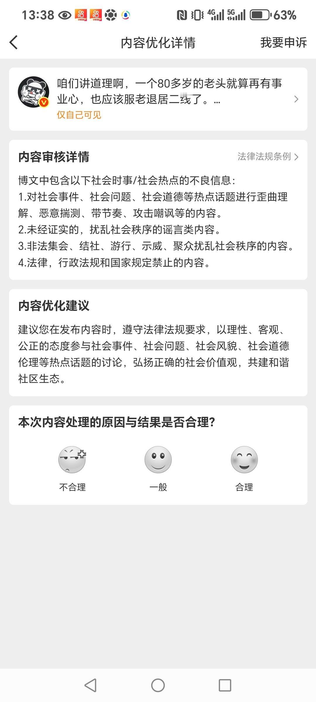 80岁老头背景确实不一般啊不能批评80岁老头理念落伍,批评他理念落伍,就有人出手了我很好奇批评80岁老头理念落伍到底符合下列哪一条违规标准?博文中包含以下社会时事/社会热点的不良信息:1.对社会事件、社会问题、社会道德等热点话题进行歪曲理解、恶意揣测、带节奏、攻击嘲讽等的内容。2.未经证实的,扰乱社会秩序的谣言类内容。3.非法集会、结社、游行、示威、聚众扰乱社会秩序的内容。4.法律,行政法规和国家规定禁止的内容。