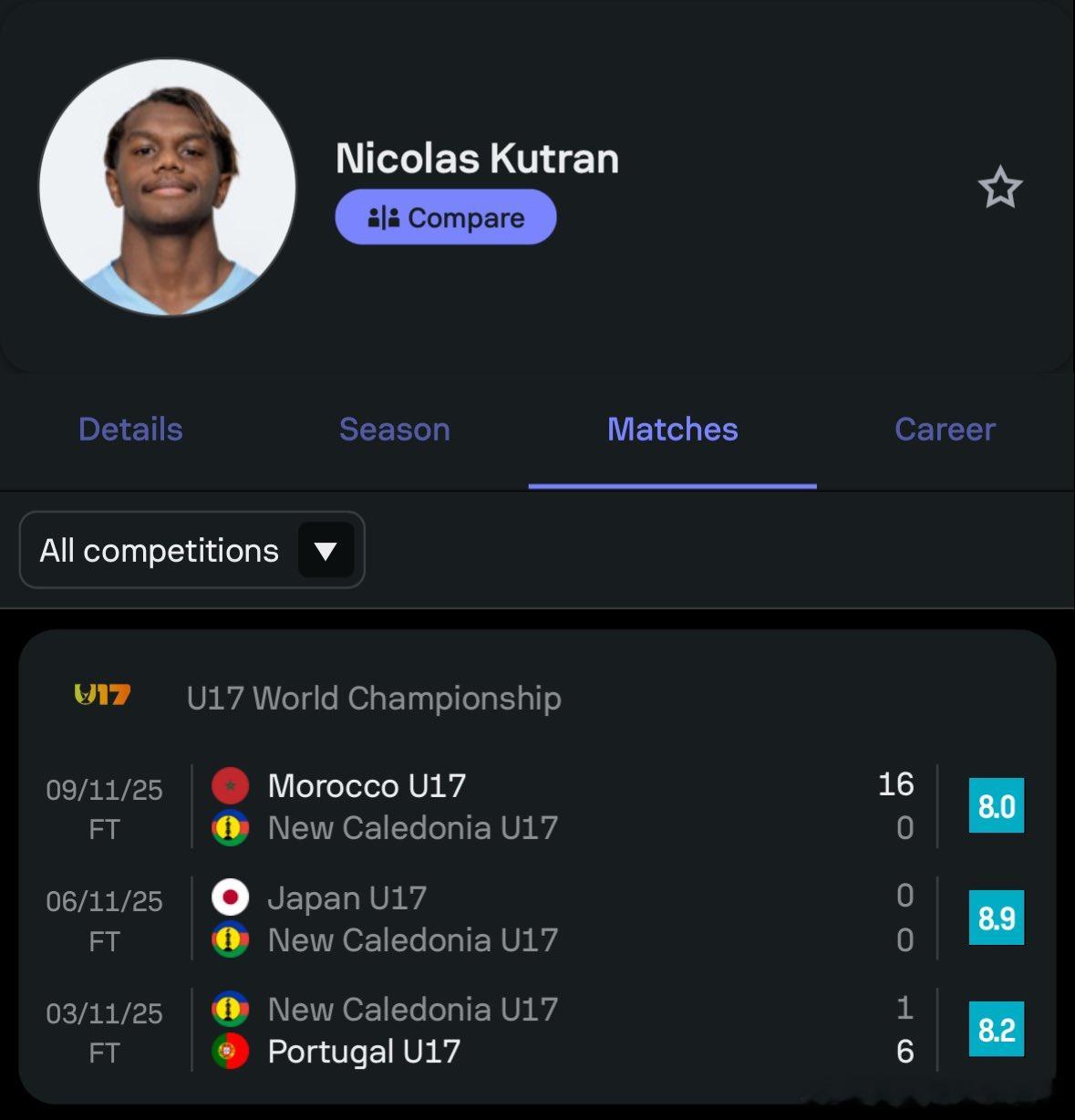 【挨最毒的打拿最高的分】新喀里多尼亚U17门将库特兰(Nicolas Kutran)在U17世界杯三场小组赛被射了166次,射正54次,被进22球……场均贡献10.3次扑救,评分8.37分,三场都是队内最佳