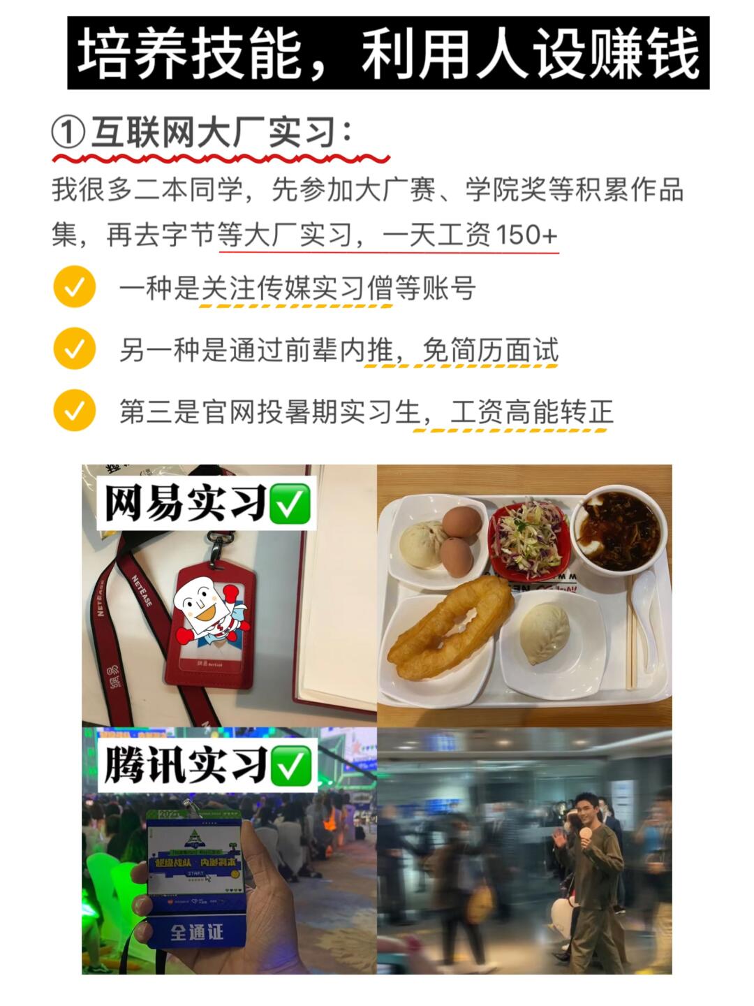 ▪️我很多二本同学,先参加大广赛等积累作品集,再去大厂实习;1是关注实习类账号;2是前辈内推,免简历面试;3是官网投暑期实习生,工资高能转正