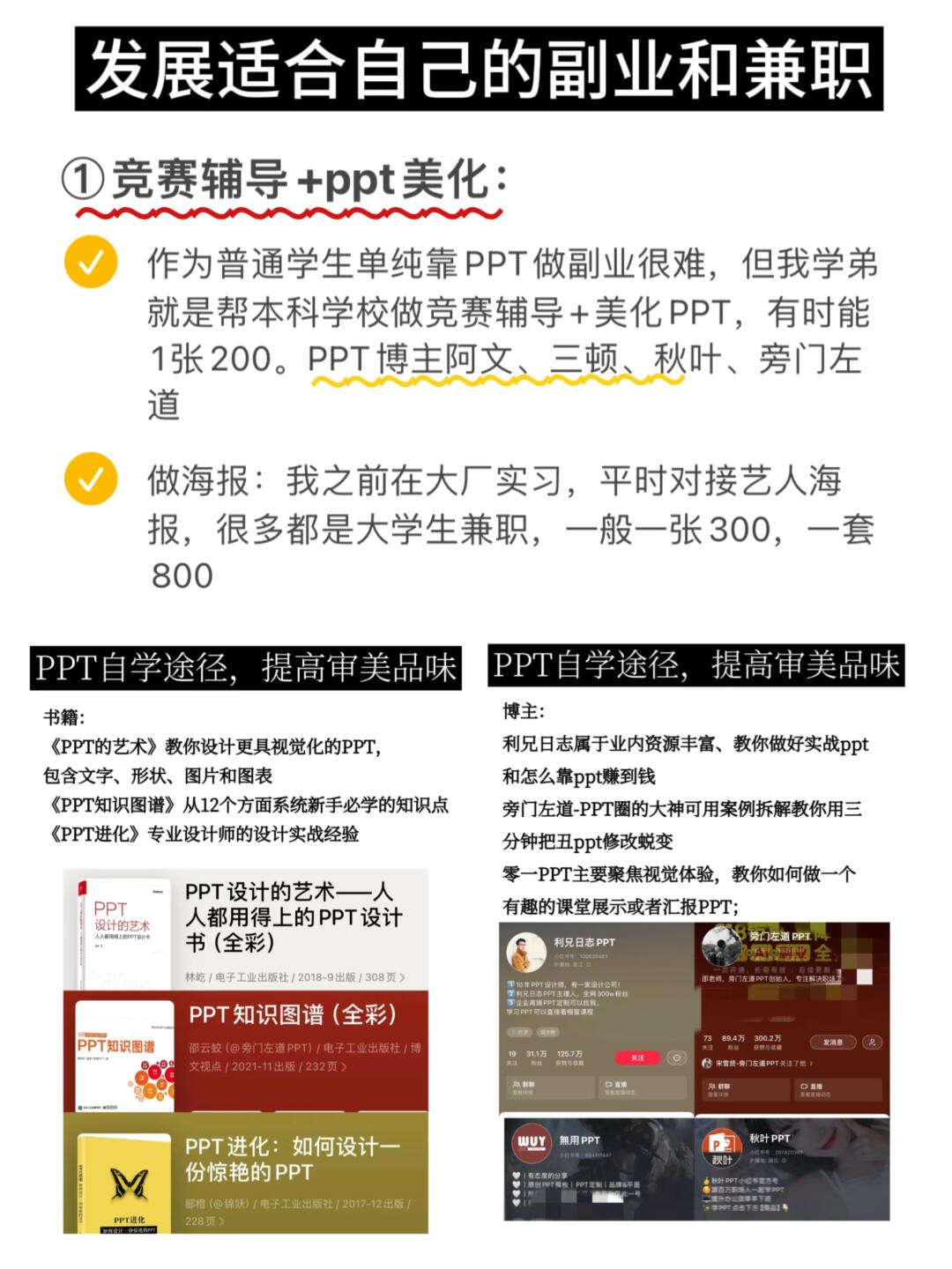 ▪️学生单靠PPT做副业很难,但我学弟帮学校做竞赛辅导+美化PPT,比做自媒体赚得多,大家可以参考一下。建议看博主阿文、三顿、秋叶、旁门左道