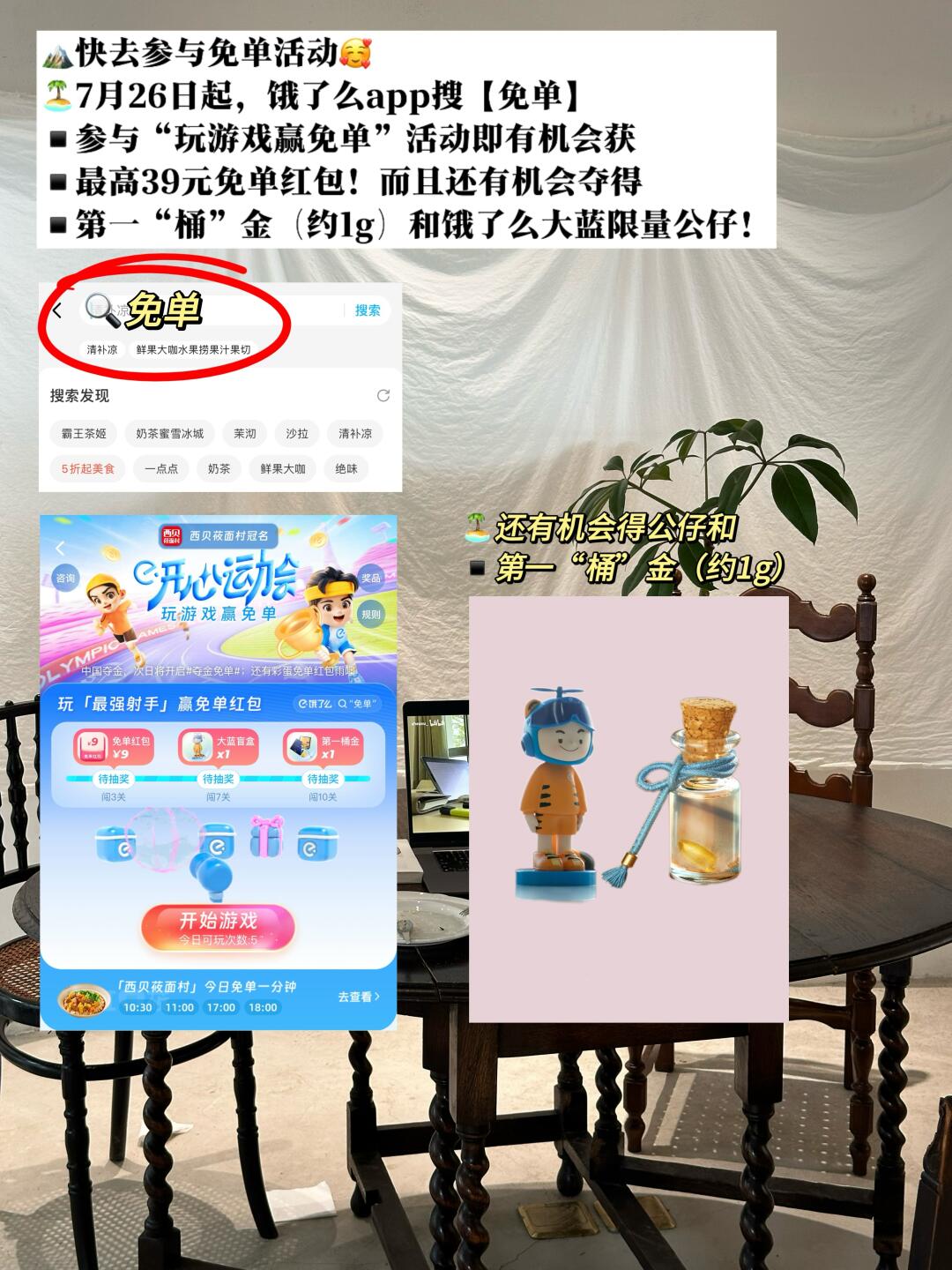 ③步骤:饿了么app搜【免单】,参与“玩游戏赢免单”,即有机会获最高39元免单红包,还有机会夺第一“桶”金(约1g)和饿了么大蓝限量公仔