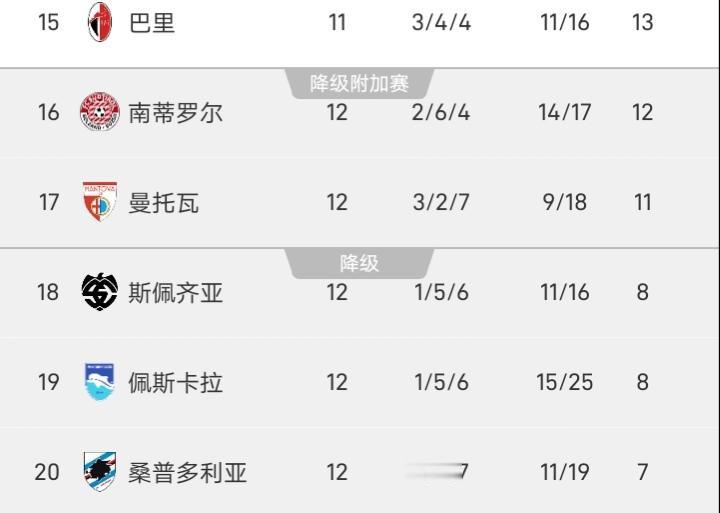 看了下意乙,这桑普多利亚竟然还在最后一名,看样子下赛季多半要去意丙了。 桑普多利亚在10月19更换了主教练,格雷古奇上任,但这位主教练上来后带了四场也是一胜难求,桑普多利亚如今惨淡的场面,还得源于频繁的换帅,皮尔洛离开后,一年多的时间里换了5个主教练,有意思的是,说索蒂尔带的不好,人家现在在摩德纳执教,把球队带到了意乙第二,要是摩德纳最终升级成功,只能说桑普多利亚真的是太作了。 另外按意乙的赛制,最后三名降级,倒数第四、第五参加附加赛决定一个降级名额,桑普多利亚还可以力争回到倒数第四,它目前差倒数第四4分,按过往赛季的保级分数,至少要积41分才安全,目前仅有7分的桑普多利亚,要实现这一目标难度还是挺大的。