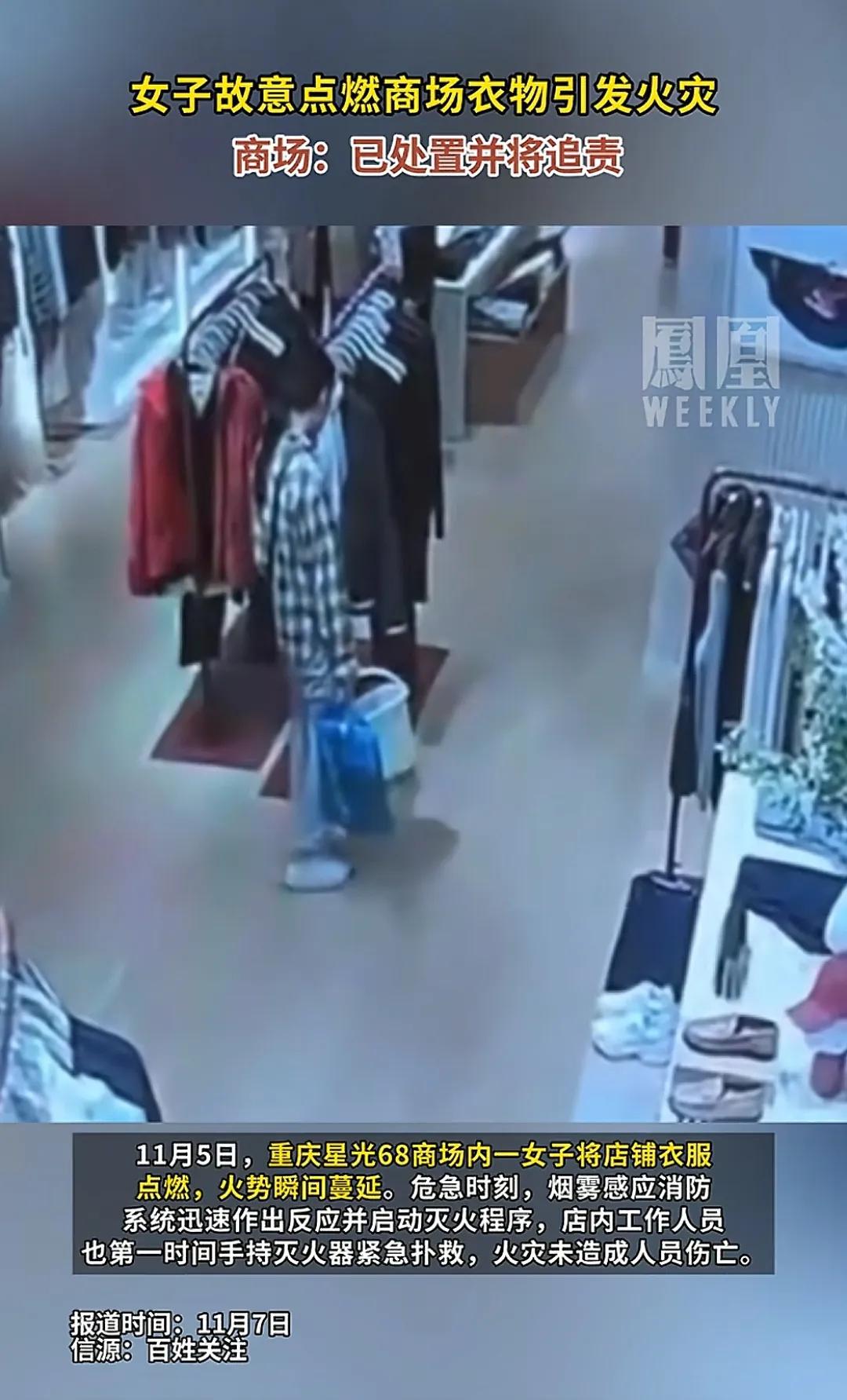 细思极恐!重庆一商场内一女子在门口徘徊,她看到店内没人后就悄悄来到一件衣服前,把衣服点燃了,她并没有第一时间离开,而是等待起火后才慢慢离开,可背后的细节让人感到细思极恐。 事情发生在重庆的一家商场内,一个女子背着一个斜挎包,手拿着一袋东西,在一家服装店门口徘徊。 她首先现在在店外环顾了一下四周,看到店里面没人后就悄悄进入,然后他来到一件纯棉的衣服,钱从口袋里面掏出一个打火机。 然后打火机将衣服点燃,她把衣服点着后,却没有急匆匆的离开,而是向外走去,又回头等待了好几秒,看到火燃烧起来了她才离开。 很快衣服燃烧的烟雾触发了店内的烟雾报警器,工作人员听到声音后,赶忙出来查看,又用灭火器对火源进行灭火,幸好店员及时出现,将火扑灭了,不然后果不堪设想。 女子为什么会将店铺衣服点燃呢,背后的细节让人细思极恐。 第一,难道不知道店里有监控吗,她的行为全部都被拍了下来,难道她不害怕被捉到吗? 第二,女子点燃衣服却没有急着离开,而是看到火势逐渐蔓延,才慢慢离开,难道她心理是有问题的吗,还是这是她的一种特殊癖好? 第三,难道女子跟商场这家服装店有过节?还是她心情不好找发泄点,才会采取这样极端的方式来报复? 其中原因不得而知,不过商场工作人员表示将会追究女子的责任到底。 女子随意纵火已经是犯罪了,要是造成其他情况,后果不堪设想。 对此,你觉得女子会受到怎样的惩罚?