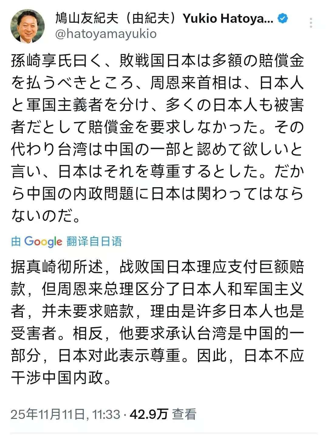 11月11日,鸠山由纪夫(日本前首相)发文:“据孫崎享所述,战败国日本理应支付巨额赔款,但周恩来总理区分了日本人和军国主义者,并未要求赔款,理由是许多日本人也是受害者,相反,他要求承认台湾是中国的一部分,日本对此表示尊重,因此,日本不应干涉中国内政。” [机智]恩义当记,背德必惩!鸠山由纪夫的陈述,既是对历史的清醒回望,更是对高市之流的尖锐打脸,周总理当年免赔款,是出于对日本普通民众的悲悯,而非对侵略者的纵容,条件早已明确——承认台湾是中国一部分,这份天大恩情,却成了日本右翼挑衅的底气,他们选择性遗忘善意,借台海问题炒作存亡危机,实质是为扩军找借口,鸠山的发声在右翼当道的日本政坛格外孤独,却戳破了关键:中方的宽容从不是软弱! 有评论表示,日本若连最基本的承诺都背弃,执意干涉中方内政,终将让当年的豁免之恩化为泡影,届时等待它的,绝不会是温情,而是触碰红线的惨痛代价!
