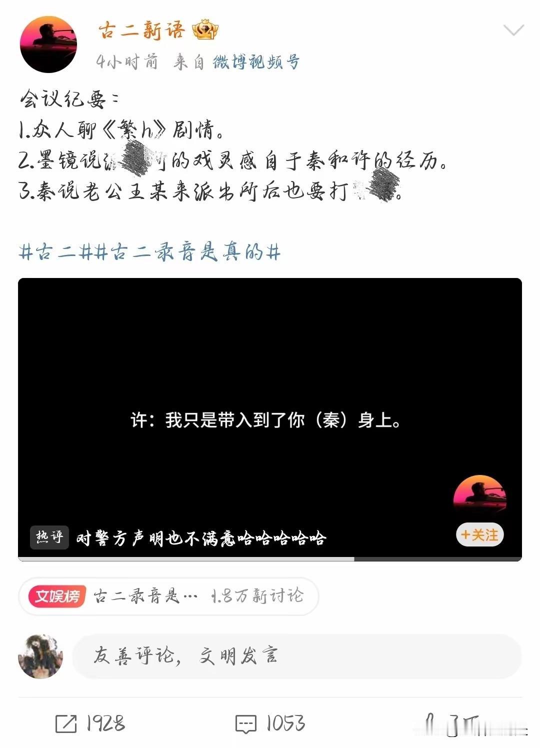问:怎么看古二一波接一波的录音抖出? 答:还能怎么看,打开手机头条就可以看。 同事:[捂脸] 答:难不成也点评一番,然后被你录音发到网上呀 自从《繁花》录音事件刷屏网络后,似乎办公室同事间也得到不少启示。 现在吃瓜人都在等古二的录音更新发布……估计秦编、王导等人,会绞尽脑汁回忆,自己还说过什么得罪人的话。 “闲谈莫论人非”,老祖宗早有警语。