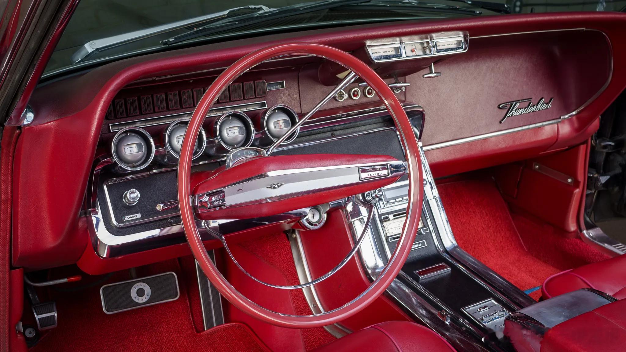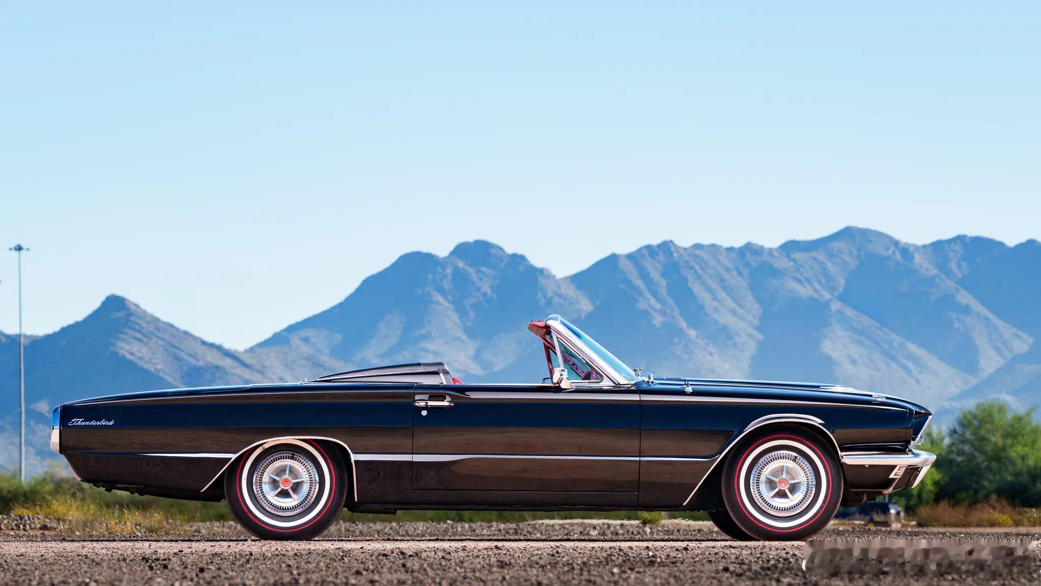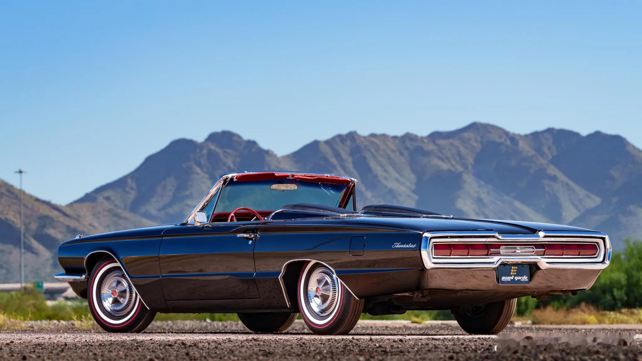 这是上世纪60年代中期的福特第四代雷鸟双门四座敞篷车,生产周期在1964-1966年。这代福特雷鸟摒弃了之前美式豪华的过度设计,只保留了经典的平直线条与夸张的外形尺寸。这一时期的福特雷鸟外观采用了全新的前格栅造型,以及前后硕大的雷鸟徽标。牵就于当时的法规,车头设计了四只头灯,尾部采用了更为简洁的造型设计,以及全幅尾灯。那时的美式豪华讲究全车闪耀的镀铬件,福特雷鸟也不例外,从头到脚都是精致的镀铬装饰。这辆后期款的福特雷鸟以黑色涂装配以纯白色软篷,修长的车身加上珠光宝气的电镀装饰,60年代中期美式奢华与格调的典范。第四代福特雷鸟标配6.4升V8发动机,最大功率315马力,而Landau版的福特雷鸟配备了排量更大的7.0升V8发动机,最大功率增加到345马力,搭配4-C6三速自动变速箱,0-100公里/小时加速时间9秒。车内采用了全红色内饰,仪表全部以水平横向指示,配合极简两辐方向盘。车上配备了电动车窗、门锁、外后视镜控制,以及定速巡航等功能。软质顶棚敞开后能够电动完全收折进后备箱,不留一丝痕迹。