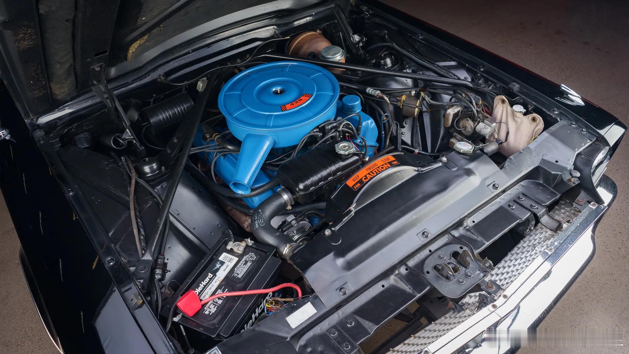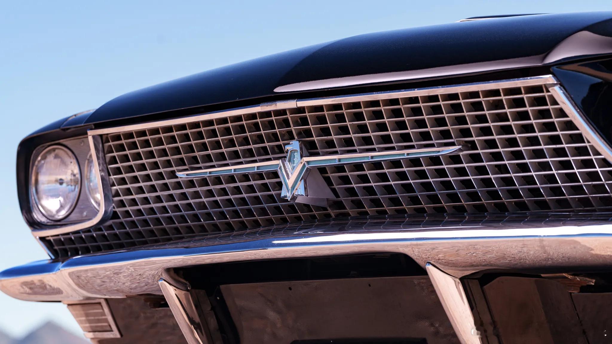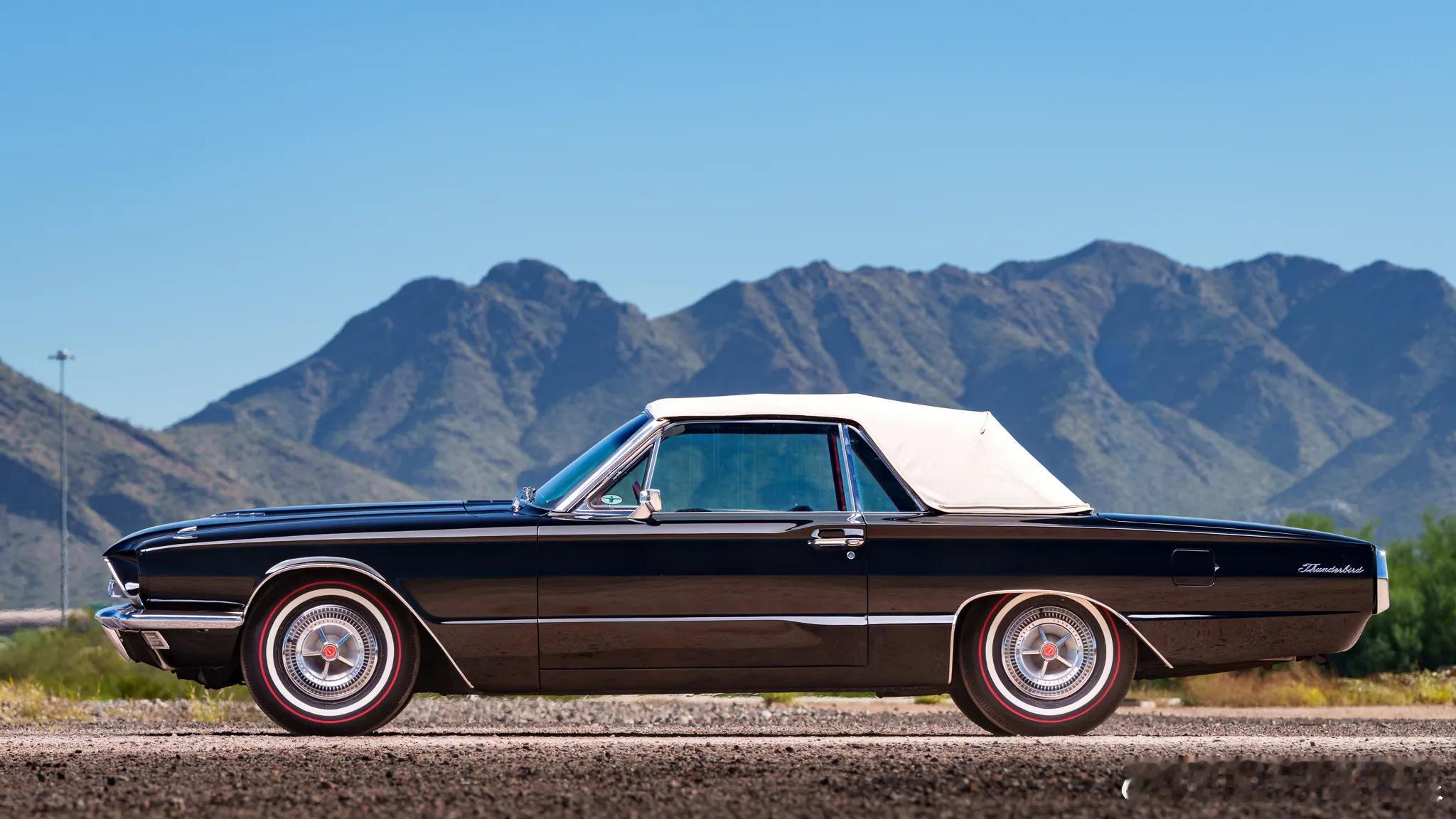 这是上世纪60年代中期的福特第四代雷鸟双门四座敞篷车,生产周期在1964-1966年。这代福特雷鸟摒弃了之前美式豪华的过度设计,只保留了经典的平直线条与夸张的外形尺寸。这一时期的福特雷鸟外观采用了全新的前格栅造型,以及前后硕大的雷鸟徽标。牵就于当时的法规,车头设计了四只头灯,尾部采用了更为简洁的造型设计,以及全幅尾灯。那时的美式豪华讲究全车闪耀的镀铬件,福特雷鸟也不例外,从头到脚都是精致的镀铬装饰。这辆后期款的福特雷鸟以黑色涂装配以纯白色软篷,修长的车身加上珠光宝气的电镀装饰,60年代中期美式奢华与格调的典范。第四代福特雷鸟标配6.4升V8发动机,最大功率315马力,而Landau版的福特雷鸟配备了排量更大的7.0升V8发动机,最大功率增加到345马力,搭配4-C6三速自动变速箱,0-100公里/小时加速时间9秒。车内采用了全红色内饰,仪表全部以水平横向指示,配合极简两辐方向盘。车上配备了电动车窗、门锁、外后视镜控制,以及定速巡航等功能。软质顶棚敞开后能够电动完全收折进后备箱,不留一丝痕迹。
