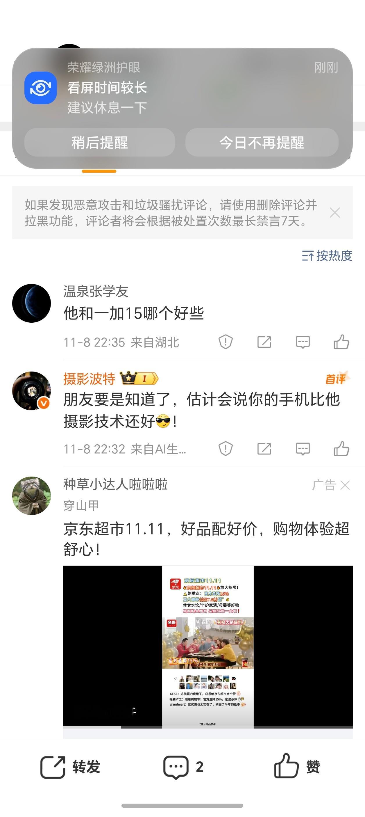 新手机拿到手,总是稀罕不够,每天手机不离手!好在荣耀Magic8 Pro总会随时提醒我,让我健康使用手机!环境光过暗,长时间低头看手机,环境色温异常,看屏幕时间过长…………只要是不健康的看手机方式,或者对眼睛不友好的光线,Magic8 Pro都会通过弹幕实时提醒,让我们养成健康使用手机的好习惯!