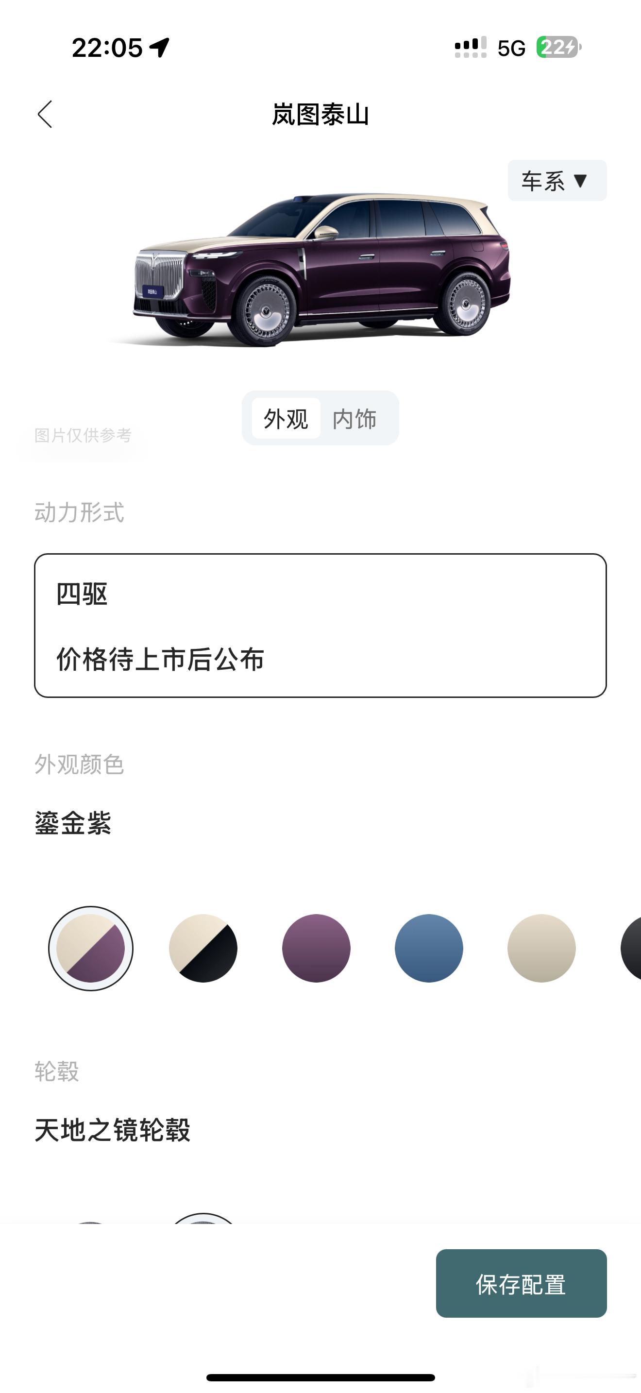 岚图泰山可以选配了就在岚图App里面,大家可以先看看有8种颜色,两套轮毂,三种内饰配色具体情况等我去试驾的时候给大家打探一下