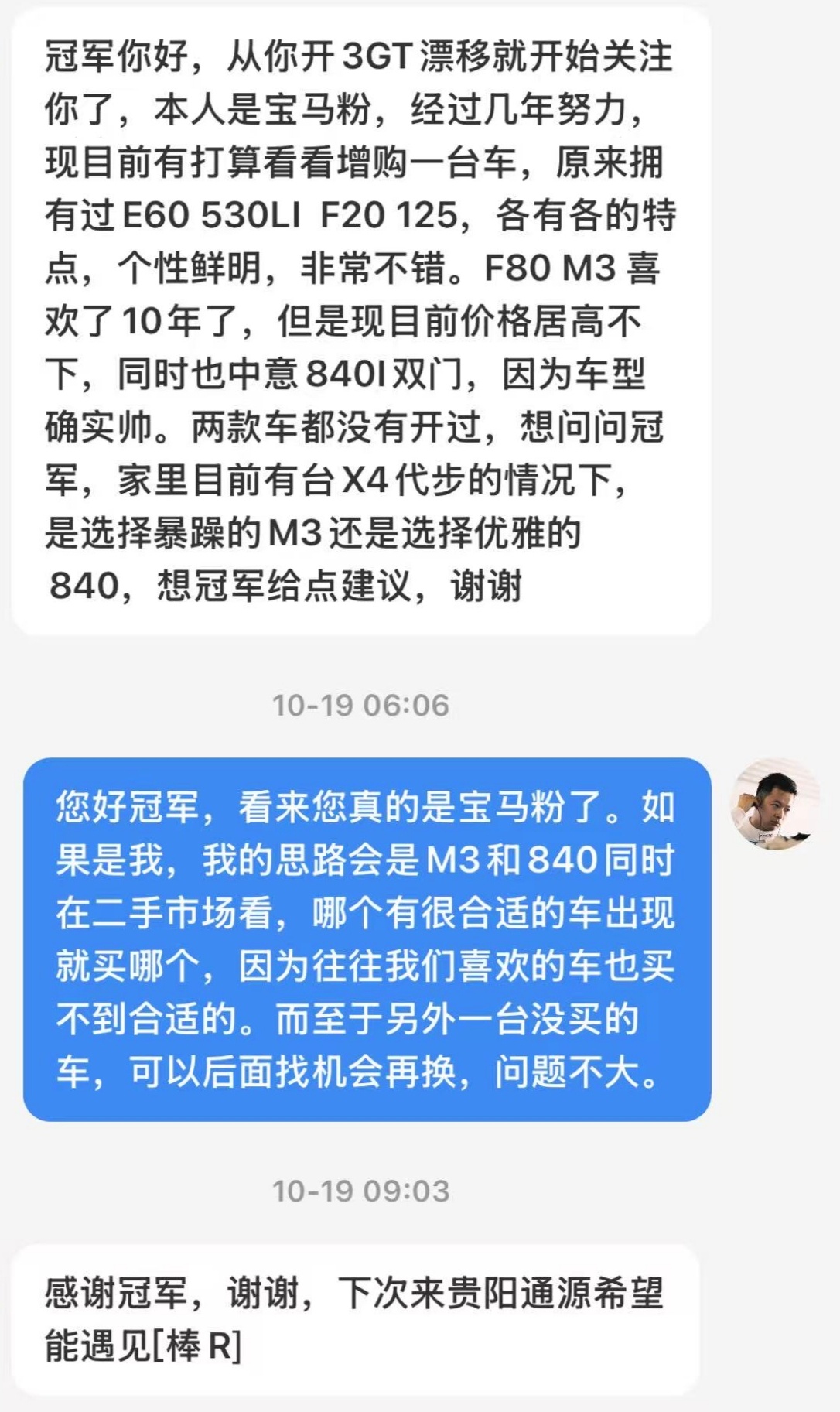 买车二手车 车型可以广撒网您好冠军,看来您真的是宝马粉了。如果是我,我的思路会是M3和840同时在二手市场看,哪个有很合适的车出现就买哪个,因为往往我们喜欢的车也买不到合适的。而至于另外一台没买的车,可以后面找机会再换,问题不大。