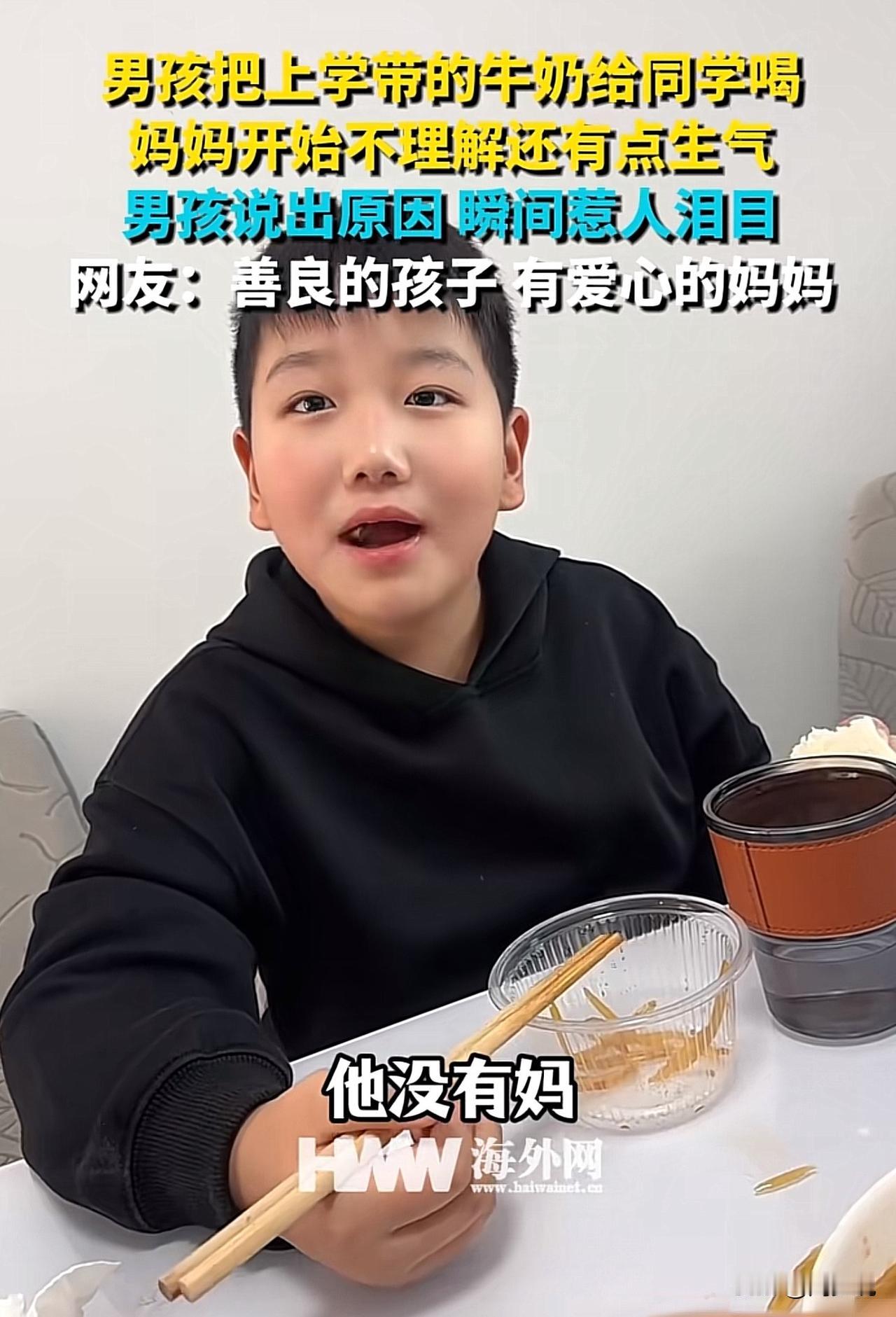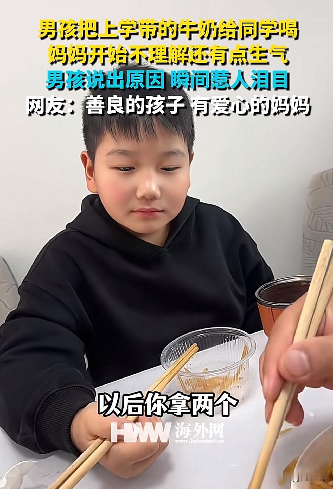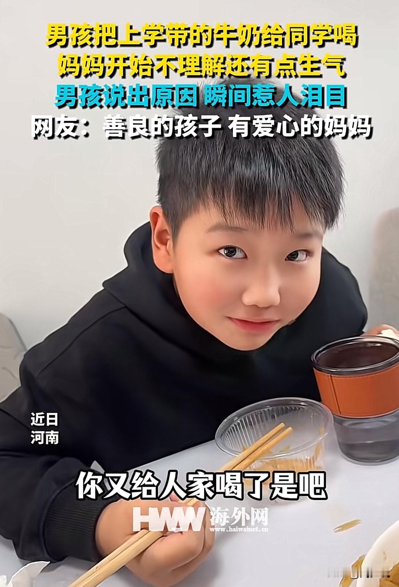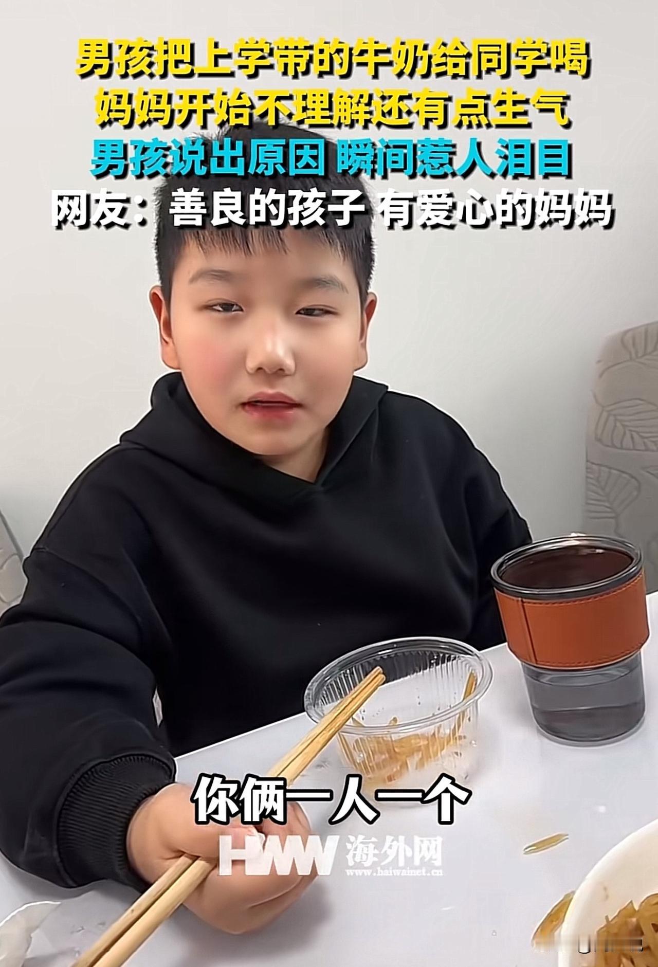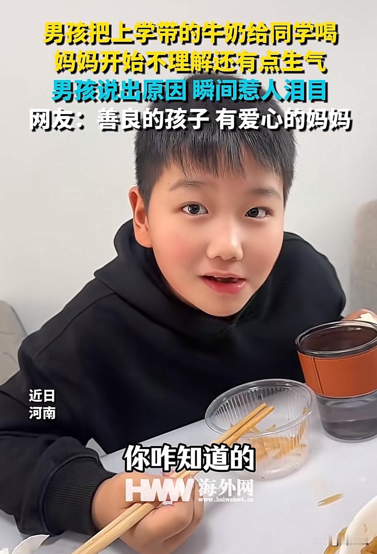 #男孩将牛奶送给同学喝 原因惹人泪目#男孩长期送同学牛奶,母亲追问后得知真相,网友:小小年纪有大爱! 近日,河南一男孩每天悄悄把自己的牛奶送给同班同学,母亲起初十分不解:自家孩子明明也爱喝,为何总“省”给别人喝?几番追问后,真相让她既感动又欣慰。 原来,接受牛奶的同学没有母亲照料,日常缺乏关爱。男孩看在眼里记在心里,便主动用送牛奶的方式,默默为同学传递温暖。 此事引发网友热议,有网友说:“小小年纪就懂得共情,这份纯粹的善意太珍贵了!” 也有网友称:“不用华丽的语言,只用行动温暖他人,这才是最好的成长教育”! 还有网友表示:“为男孩点赞,也为理解支持他的妈妈点赞!” 周少认为,男孩的举动虽小,却藏着最动人的善意。在快节奏的生活中,这份不图回报的关怀,如一股暖流直击人心。 它不仅让受助同学感受到温暖,更诠释了“善良”的本质。无需惊天动地,只需发自内心为他人着想。这样的童真与善意,值得被看见、被传颂,更能给成年人带来温暖与启发。#MCN双量进阶计划# #寻美三湘#