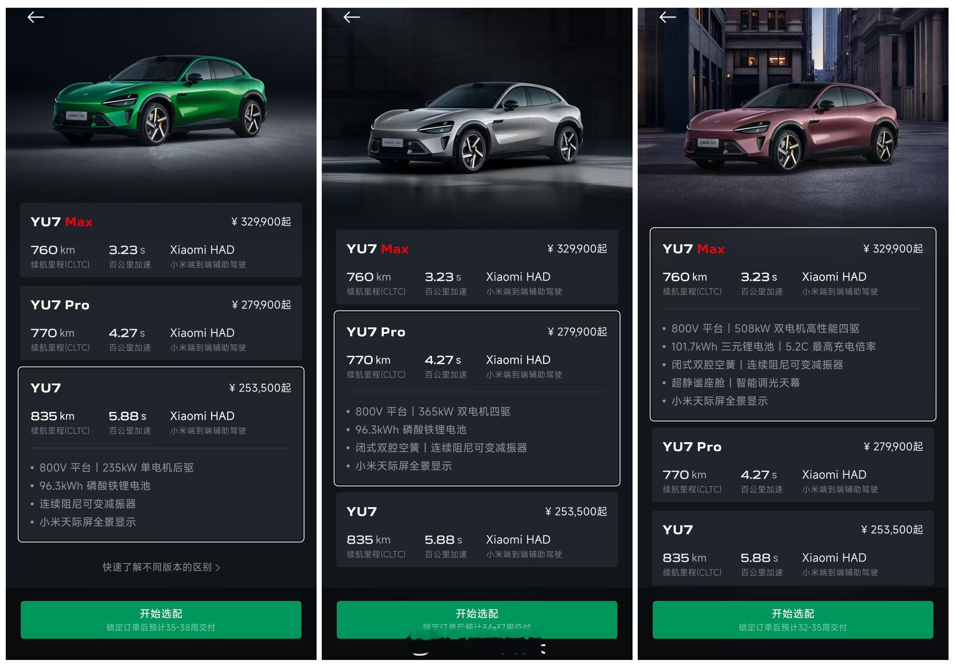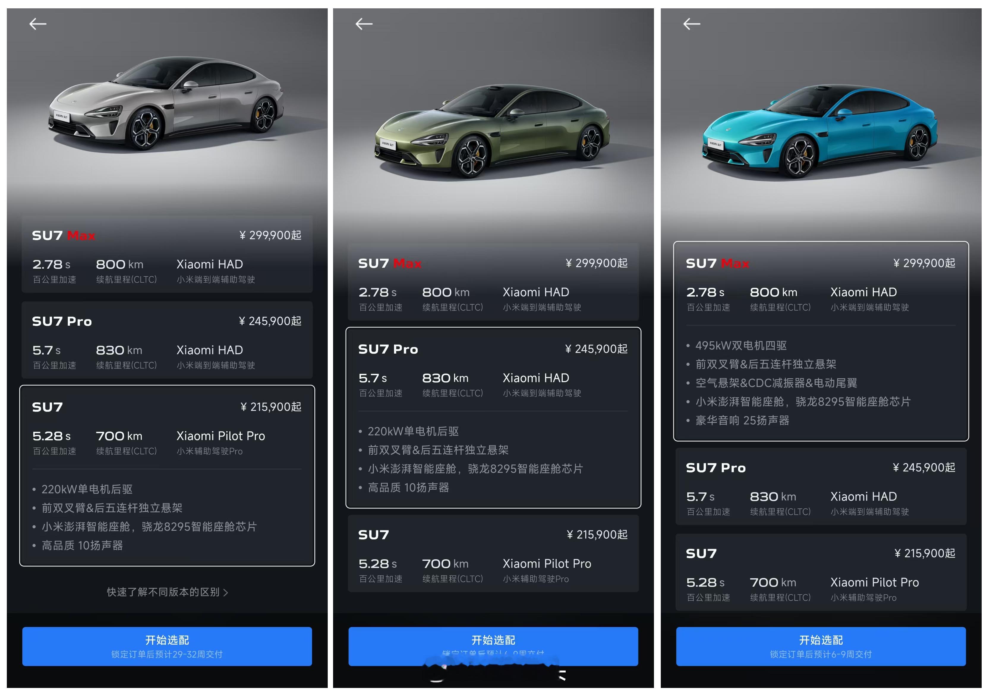 看了下,小米SU7锁单后,交付周期居然缩短到了6-9周。也就是说,你现在锁单,最快今年内就能提车。最快6-9周能提车的版本有SU7 Pro、SU7 Max和SU7 Ultra,可能你会好奇,为啥标准版要29-32周。你想要便宜几万,多等几个月不过分吧!小米YU7的话,周期变化不是很明显,32-38周,也就是最快明年年中能交付。这个周期变化,主要是产能提升了!小米汽车8月交付3.6万台,9月交付4.2万台,10月提升到了4.8万台。过去三个月每个月提升6000台,体现到交付周期上,差不多就是这两个月提升的产能,能够让交付周期缩短2-3个月。所以,小米汽车交付周期缩短,和小米新增订单量并没有多大关系,都散了吧!