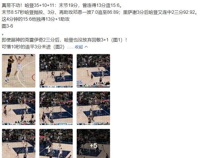 真带不动!哈登35+10+11:末节19分,曾连得13分造15:6。 末节8:57秒哈登抛投、3分、再助攻邓恩一波7:0追至86:89;里萨谢3分后哈登又连中2三分92:92。 这4分钟的15:6他独得13分+1助攻(图3-6)。 即使超神的克雷伊奇2三分后,哈登也没放弃回敬3+1(图1)! 可惜10秒的追平3分未进(图2)...... PS:gif图白做了