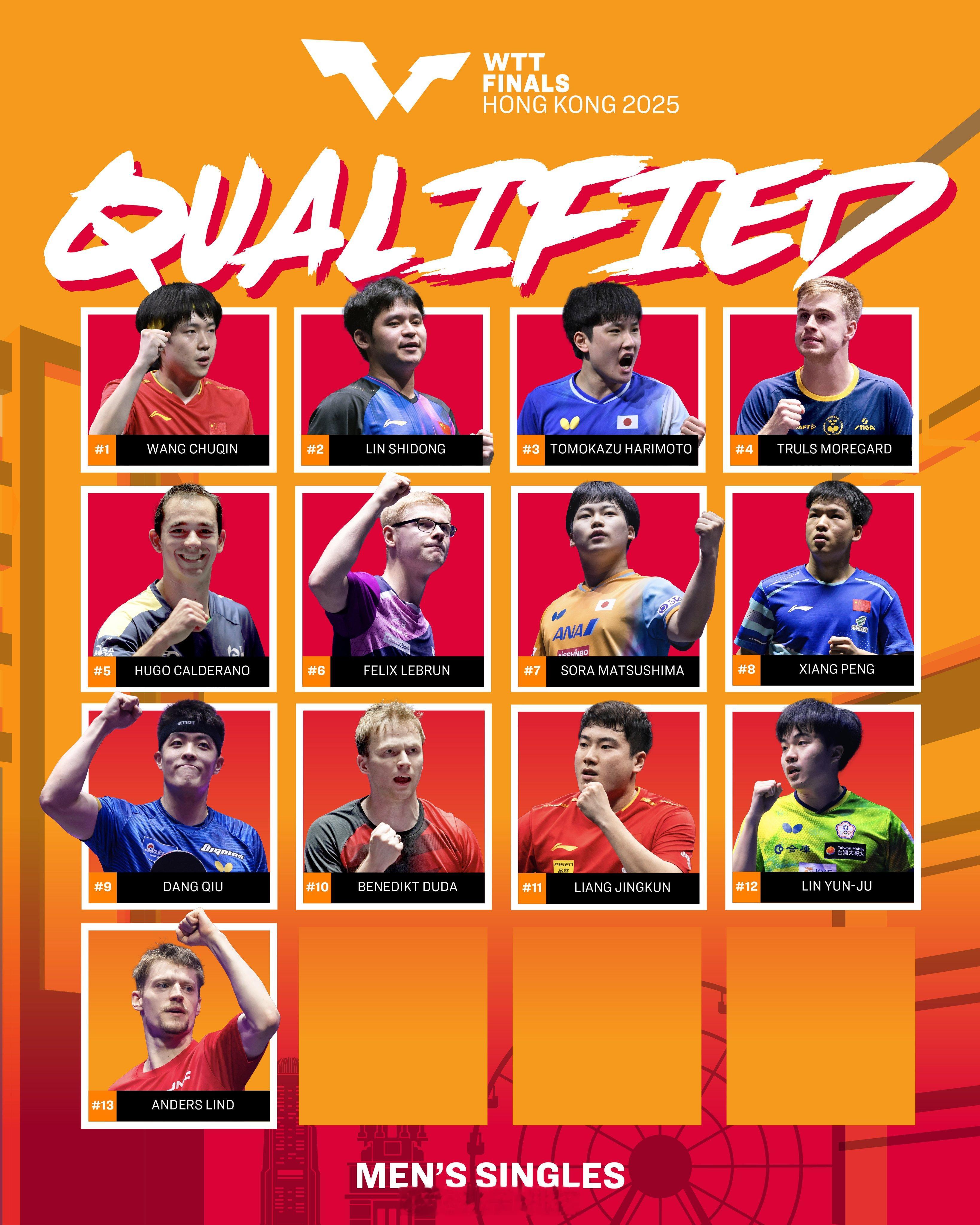 香港总决赛的参赛名单确定人数越来越多,女单只剩下最后一个席位,男单还有三席。女单已确定名单:孙颖莎、王曼昱、陈幸同、蒯曼、张本美和、王艺迪、朱雨玲、陈熠、早田希娜、桥本帆乃香、申裕斌、大藤沙月、石洵瑶、伊藤美诚、长崎美柚。男单已确定名单:王楚钦、林诗栋、张本智和、莫雷加德、雨果、F-勒布伦、松岛辉空、向鹏、邱党、杜达、梁靖崑、林昀儒、林德。