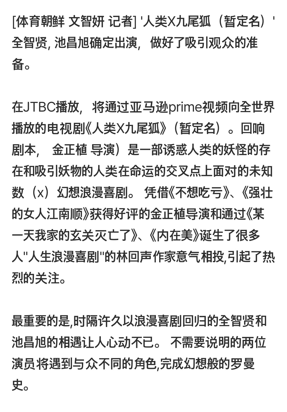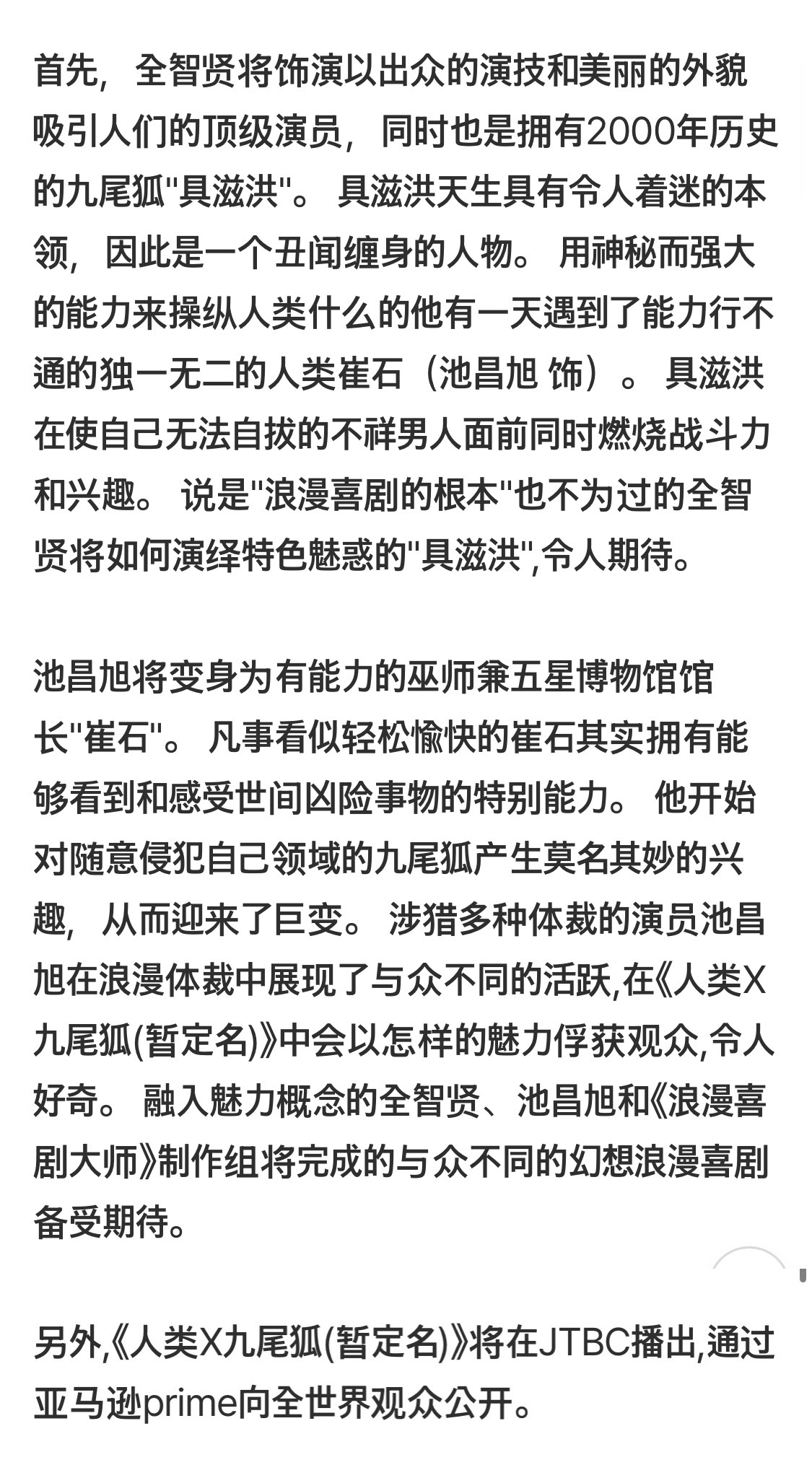 全智贤 X 池昌旭官宣了!!!全智贤明星九尾狐!池昌旭特殊能力者!播出平台:JTBC OTT:亚马逊Prime Video编剧林美音(《内在美》)导演金正植(《大力女子姜南顺》)是一部在命运的交叉点上,迷惑人类的妖娆存在与吸引妖怪的人类相遇的未知数(X)奇幻浪漫喜剧。全智贤:凭借卓越演技和美丽外貌迷倒众人的顶级演员,同时也是修炼千年的九尾狐具慈洪。具慈洪天生拥有迷惑人心的本事,也是个屡屡掀起巨大风波的人物。她凭借神秘而强大的能力,将人类玩弄于股掌之间本是易如反掌,某天却遇到了唯一一个对他能力免疫的人类——崔硕(池昌旭 饰)。在这个让自己能力失效的不祥男子面前,具慈洪的战斗力和兴趣被同时点燃。被誉为浪漫喜剧教科书的全智贤将如何演绎这个独特而迷人的"具慈洪",引发期待。池昌旭:神通广大的巫堂兼五星博物馆馆长崔硕。看似凡事都轻松愉快的崔硕,其实是位拥有能感知世间险恶的特殊能力者。他开始对随意侵犯自己领域的九尾狐产生了莫名的兴趣,并由此迎来人生的剧变。作为涉猎多种题材、且在爱情题材中展现出非凡魅力的演员,池昌旭将在《人类×九尾狐(暂定名)》中以何种魅力俘获观众,令人好奇。