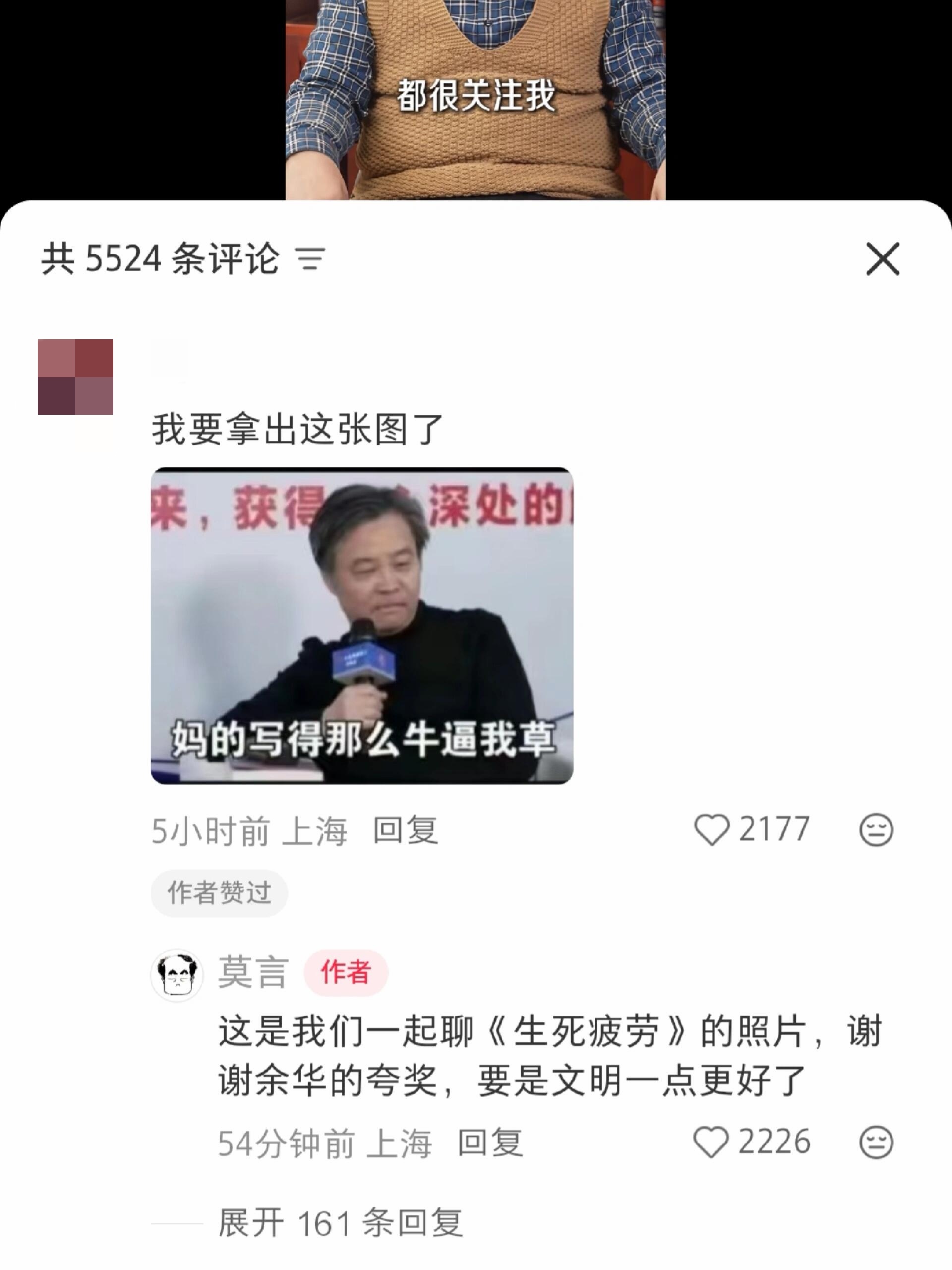 哈哈哈哈哈求你们都来看莫言老师的神回复!每条给小女子笑得亚比囧架架💅《但是我是莫言》《鲁迅比我穿的时髦》《我之前给冯巩起过(闭嘴)这个名字》《谢谢余华的夸奖要是再文明点就好了》太幽默太好笑了啊啊啊!莫言:幽默是一种天赋