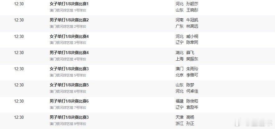 12:30 女单1/8 1号台 孙颖莎vs王晓彤 12:30 男单1/8 2号台 林高远vs牛冠凯 12:30 女单1/8 3号台 陈幸同vs臧小桐 12:30 男单1/8 4号台 樊振东VS薛飞12:30 女单1/8 5号台 朱雨玲VS李雅可12:30 女单1/8 6号台 陈梦vs何卓佳12:30 男单1/8 7号台 袁励岑VS陈俊菘12:30 男单1/8 9号台 孙正VS高杨20:30 男单1/8 王楚钦vs黄镇廷20:30 女单1/8 陈熠vs刘斐20:30 男单1/8 周恺vs于何一20:30 男单1/8 赵子豪vs马特20:30 男单1/8 林诗栋vs黄友政20:30 女单1/8 蒯曼vs胡丽梅20:30 女单1/8 王艺迪vs杨屹韵20:30 女单1/8 王曼昱vs钱天一