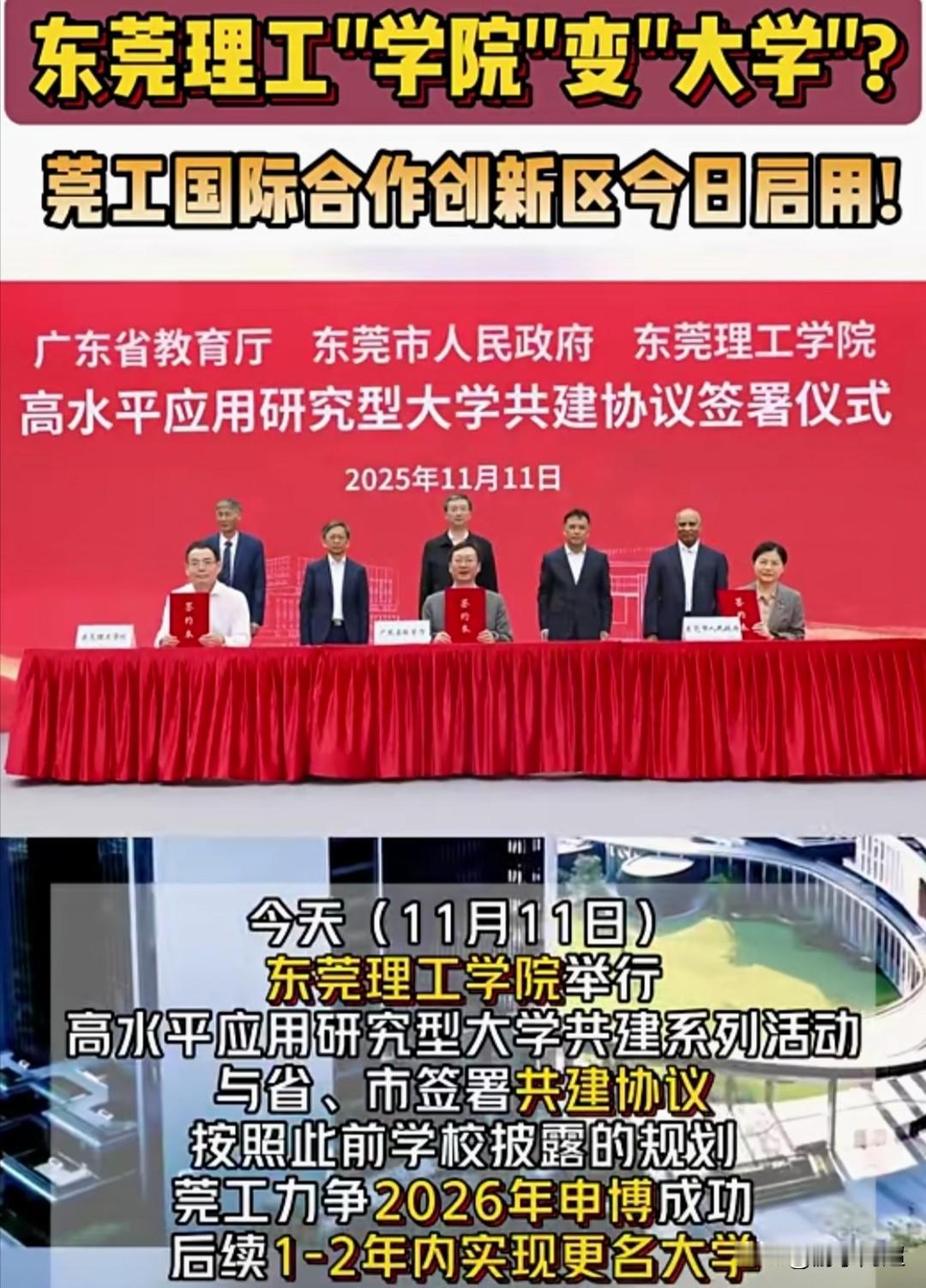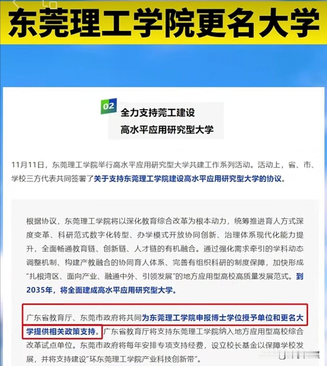 广东省即将新增一所大学,东莞理工学院将进行更名。 近日,东莞理工学院在高水平大学共建活动上,广东省教育厅与东莞市政府将共同为该校申报博士学位授权和更名大学提供政策支持。 学校力争在2026年成为博士学位授权单位,从而早日完成更名。 目前,学校选定集成电路、土木工程、资源与环境三大学科冲击博士授权点。