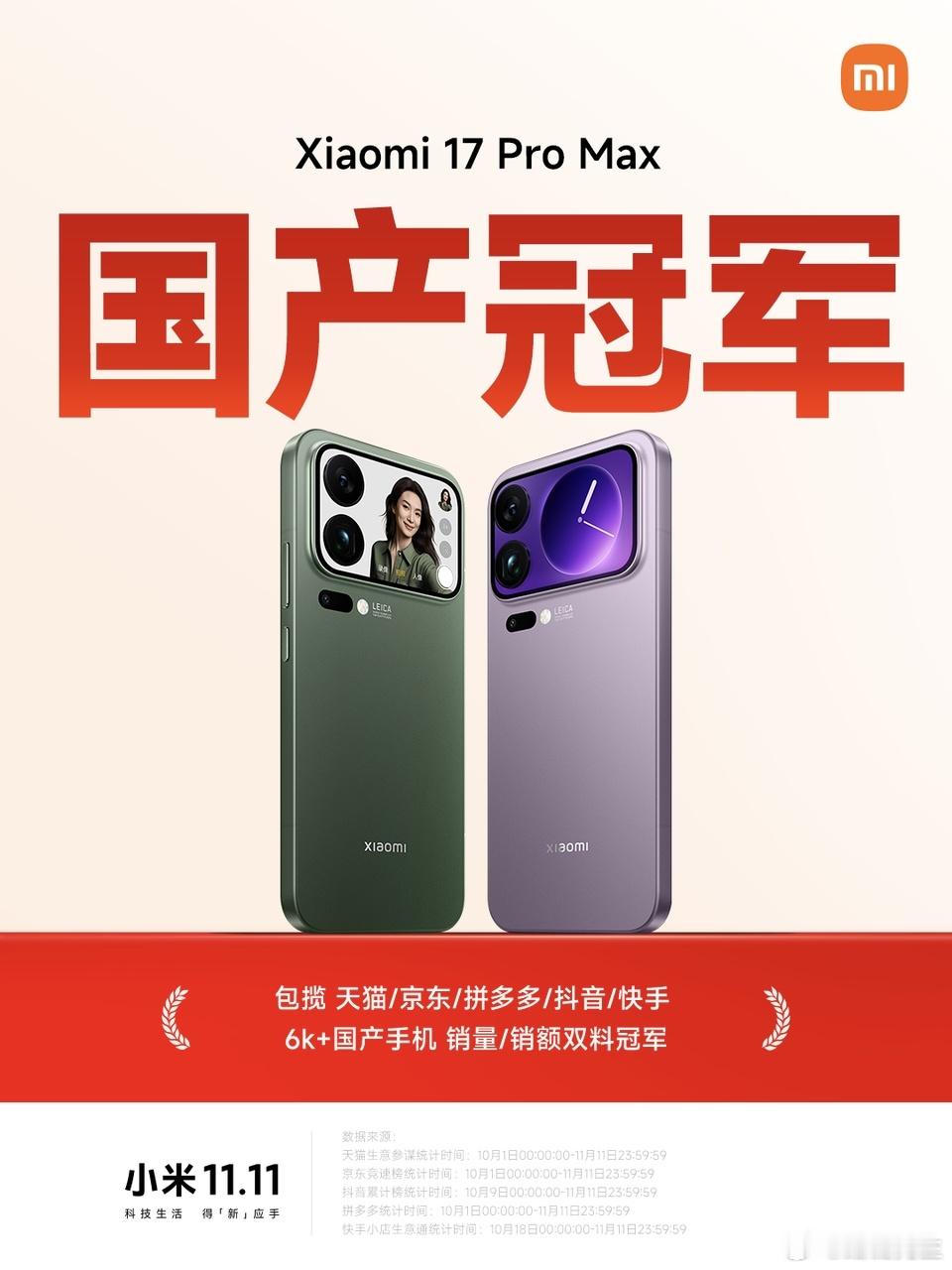 双11结束了,小米全渠道销售额突破290亿元,手机、家电、智能硬件……人车家生态全面开花。即使看完小字也成绩不俗,有的人都馋哭了。这波双11,万众瞩目的小米17系列凭借独一无二的创新和辨识度,果然不负众望,特别是17 Pro Max,做到了6K以上国产冠军,高端战略非常成功。双11虽然结束,好产品依然火爆,大家可以继续冲。