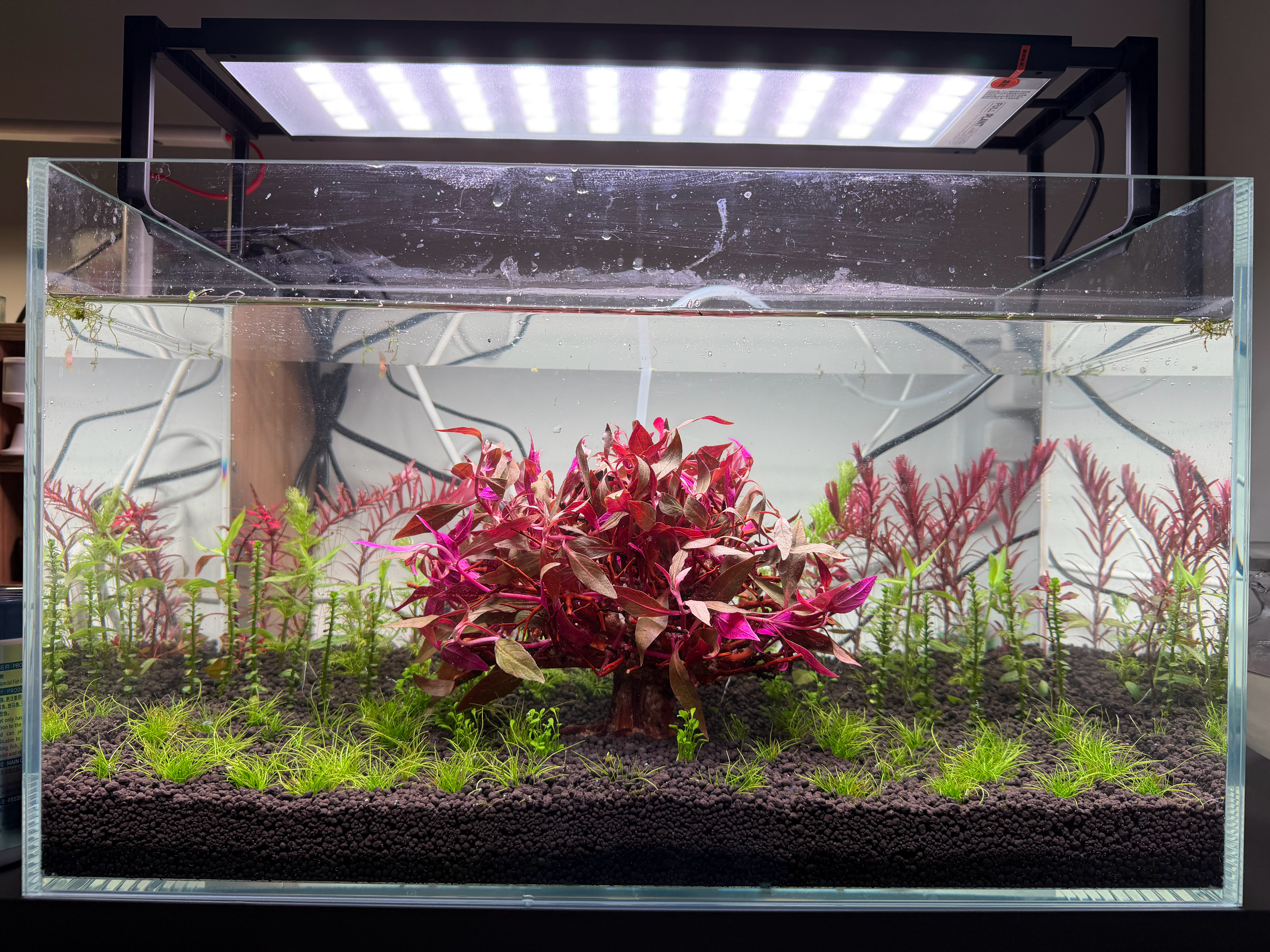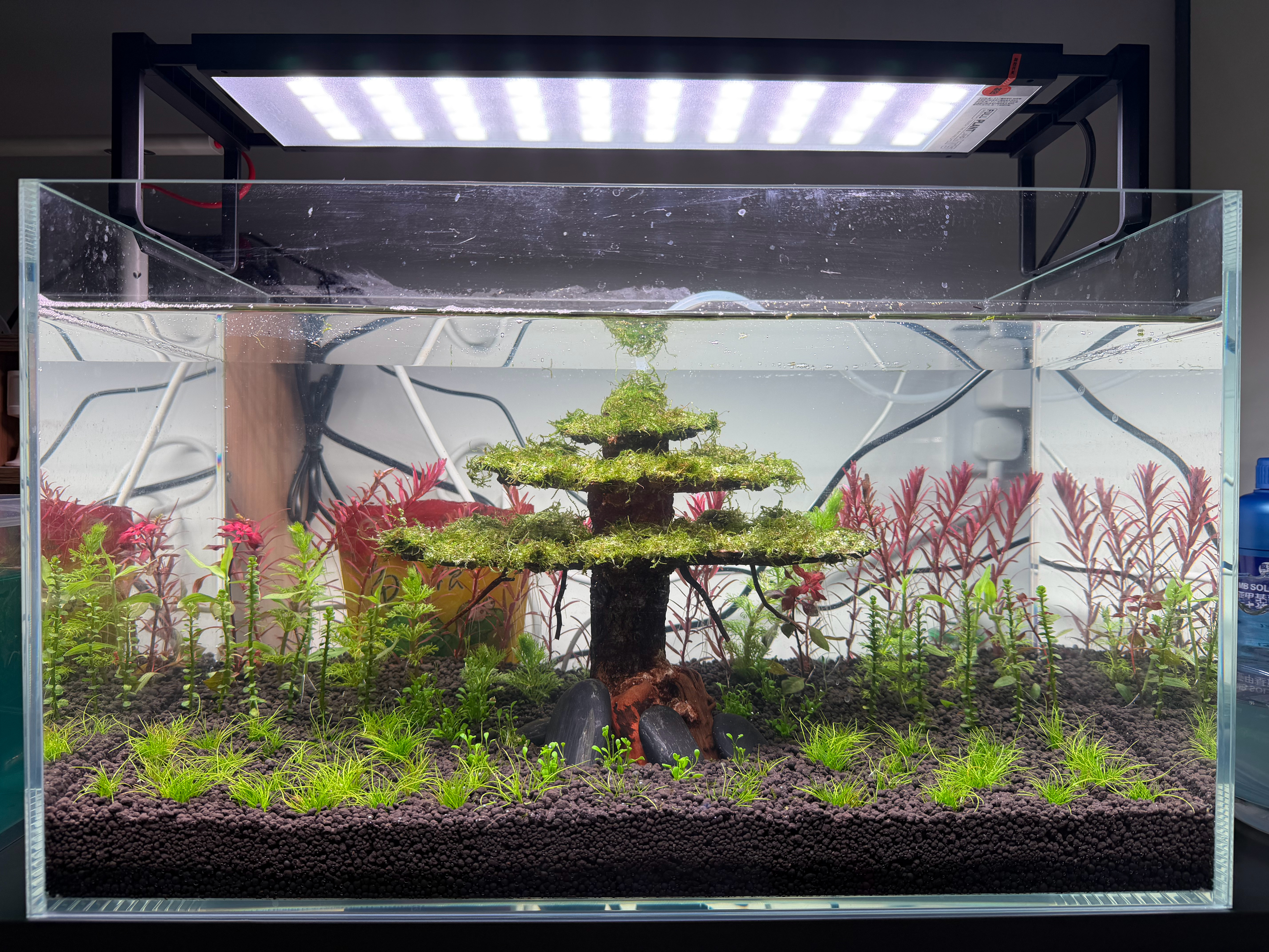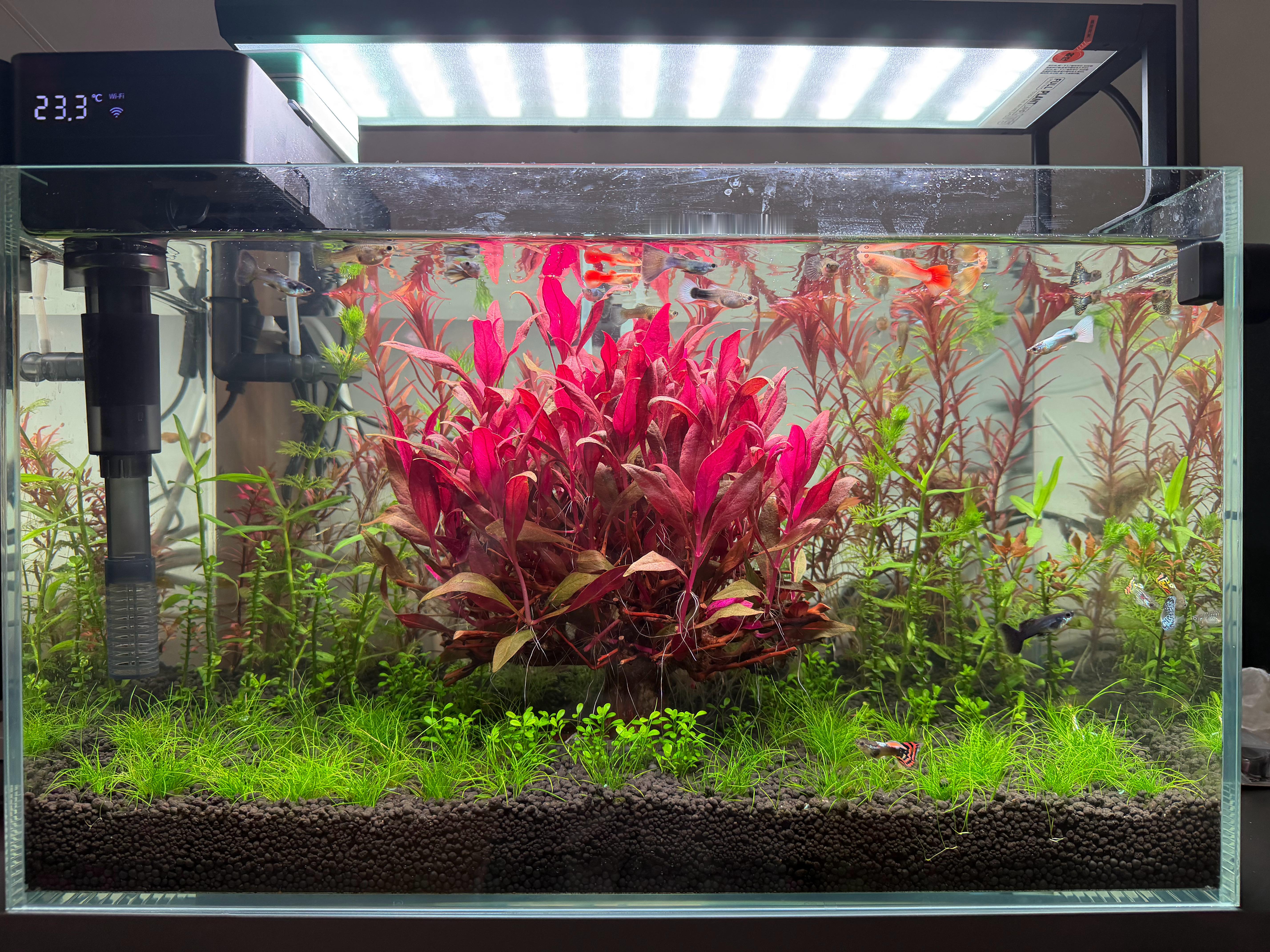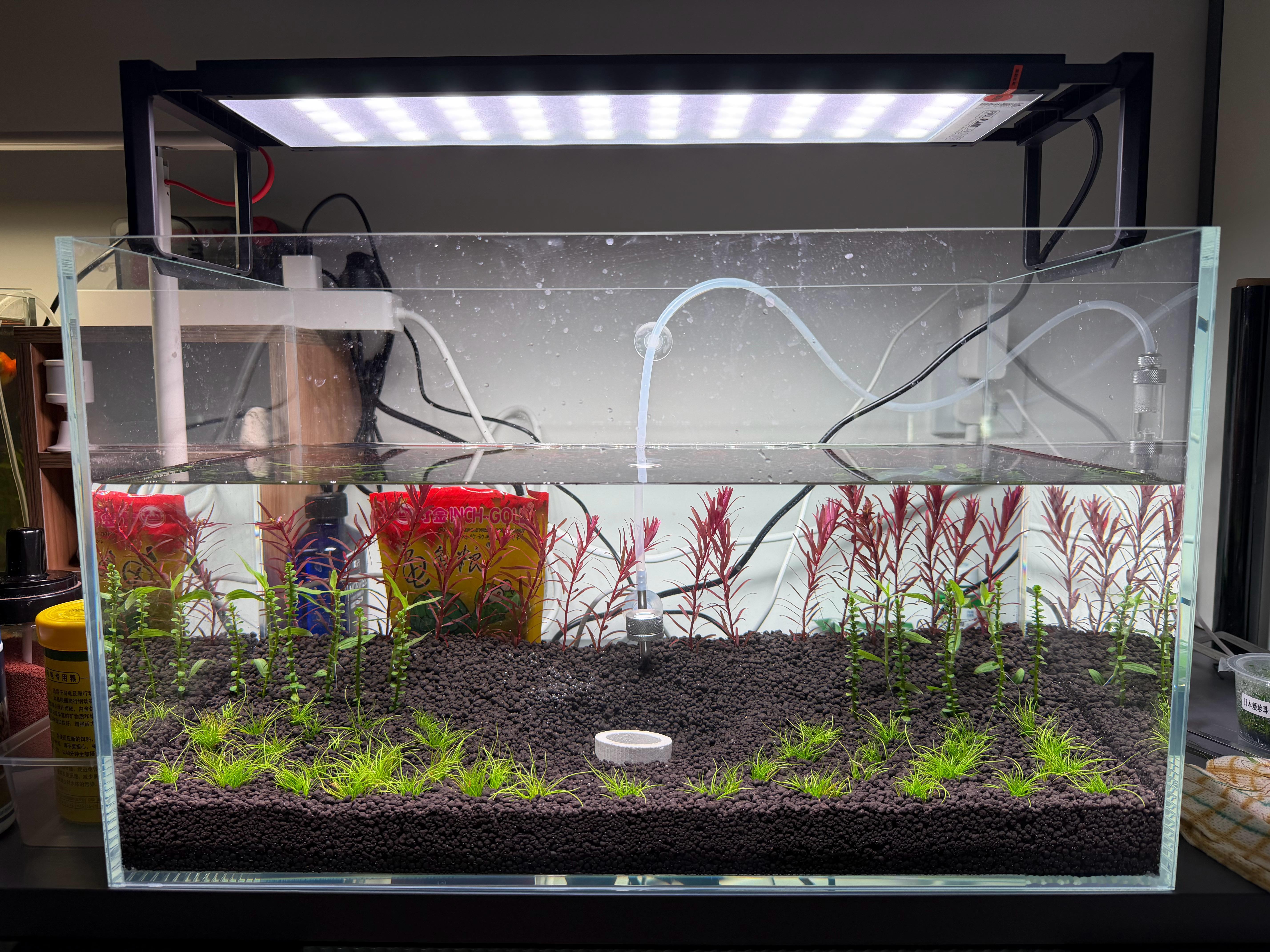不到一个月,草缸养成记,中间走了弯路,莫斯树养废了,换成丹麦红玫瑰,长太猛了……除了莫斯其它水草全疯长,没啥特别的技巧,就是给CO2。我另一个小米鱼缸是同样的水草和水草泥,只是没加CO2,草长得又细又矮又慢……