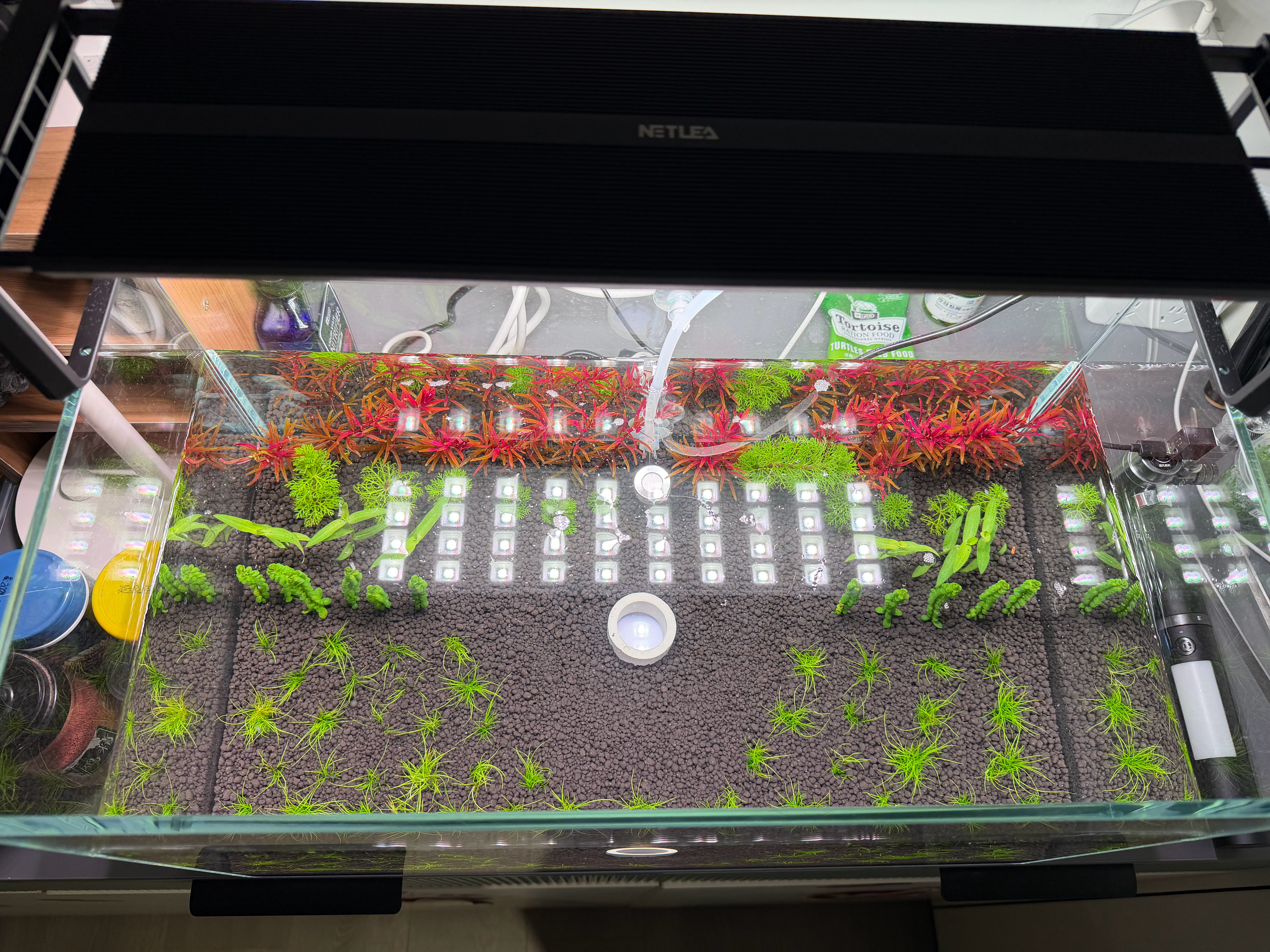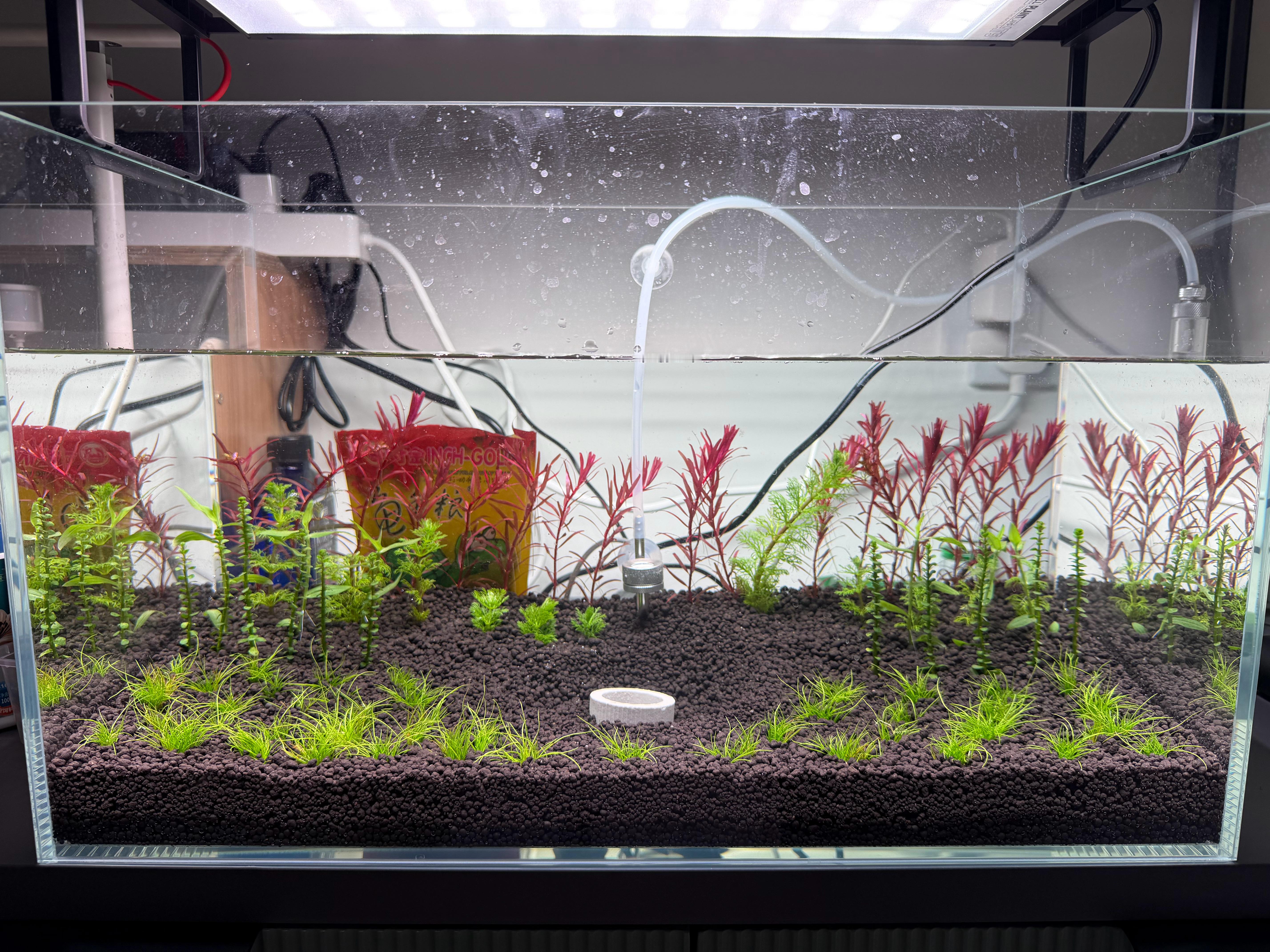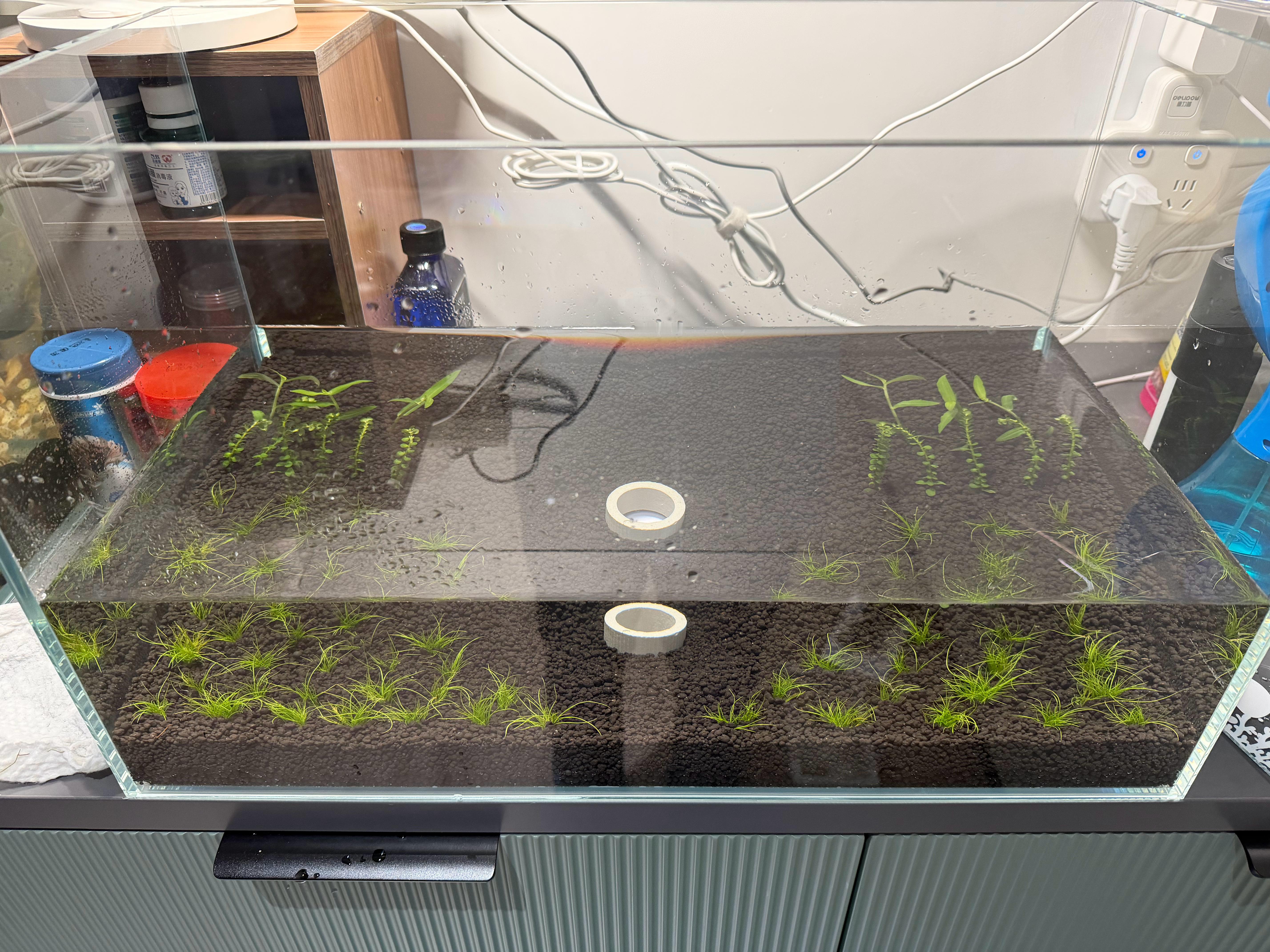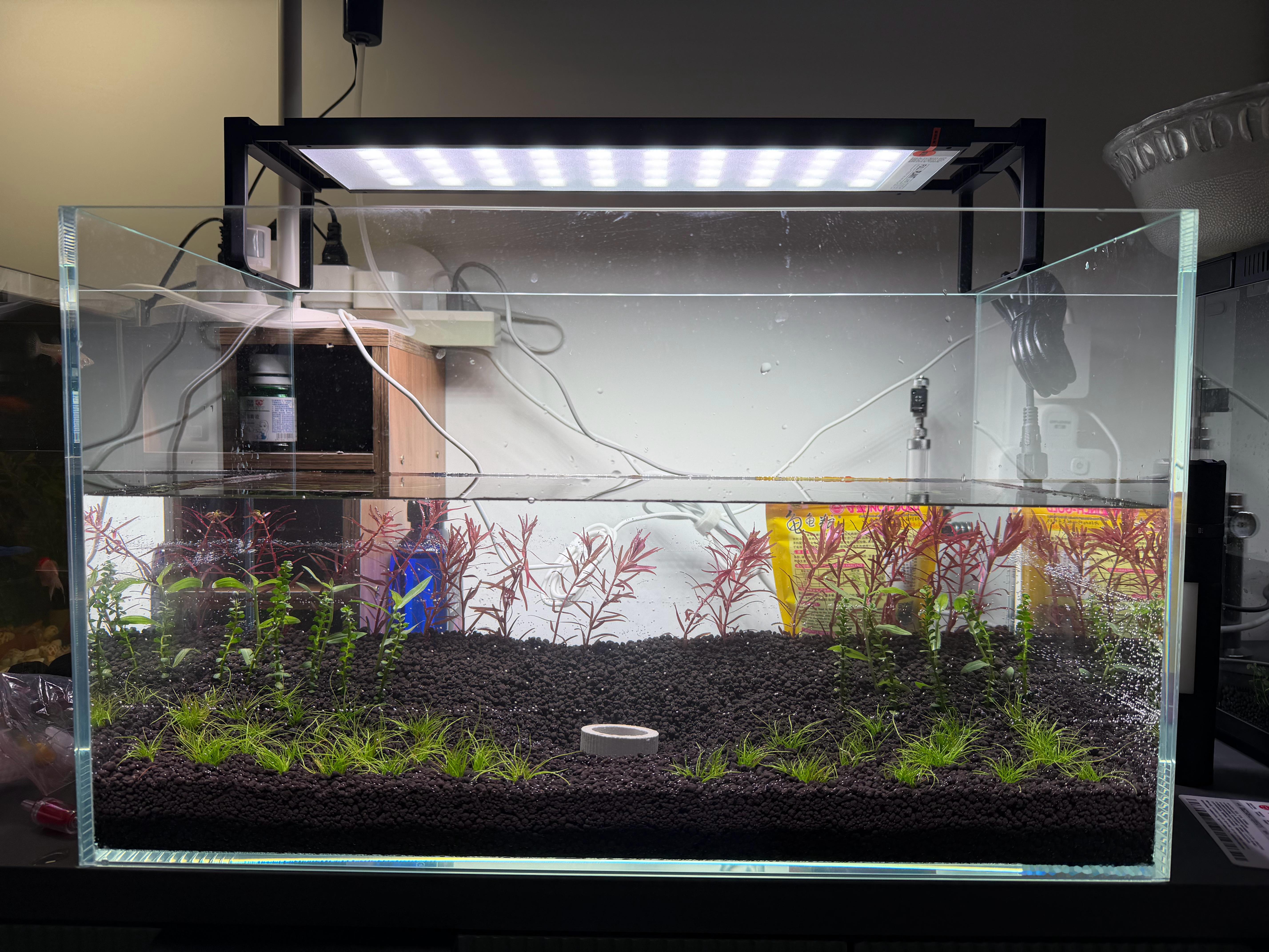 不到一个月,草缸养成记,中间走了弯路,莫斯树养废了,换成丹麦红玫瑰,长太猛了……除了莫斯其它水草全疯长,没啥特别的技巧,就是给CO2。我另一个小米鱼缸是同样的水草和水草泥,只是没加CO2,草长得又细又矮又慢……