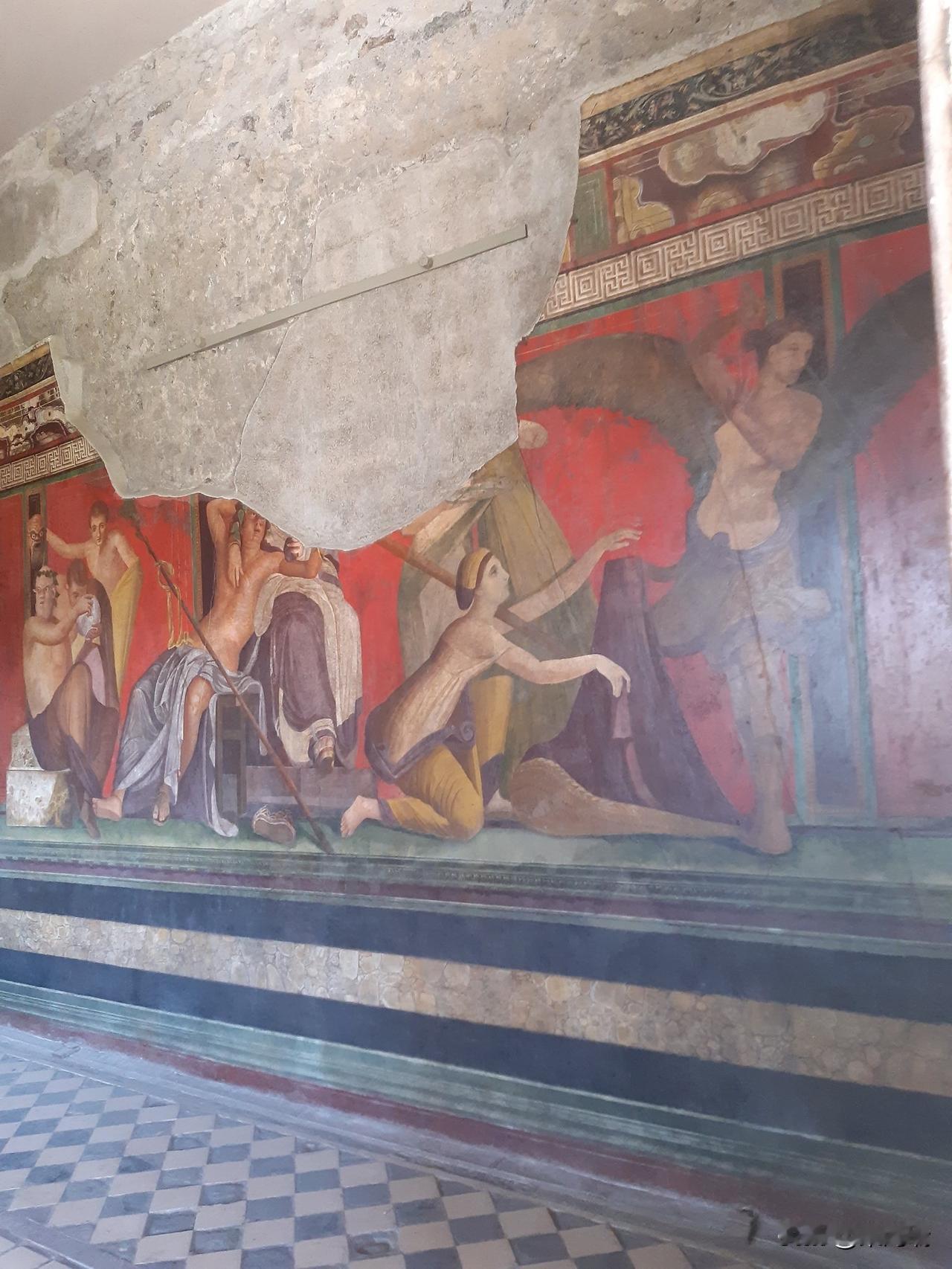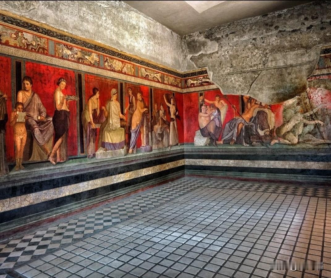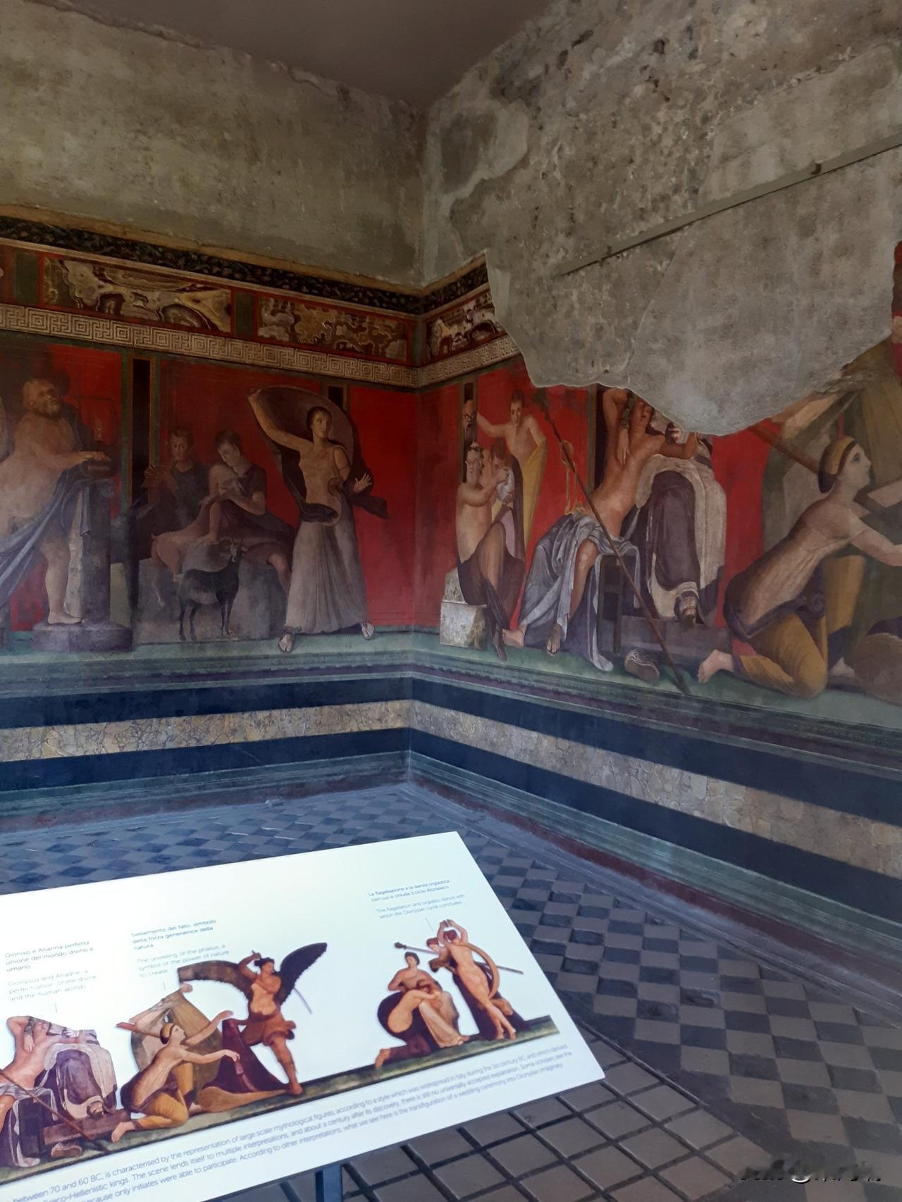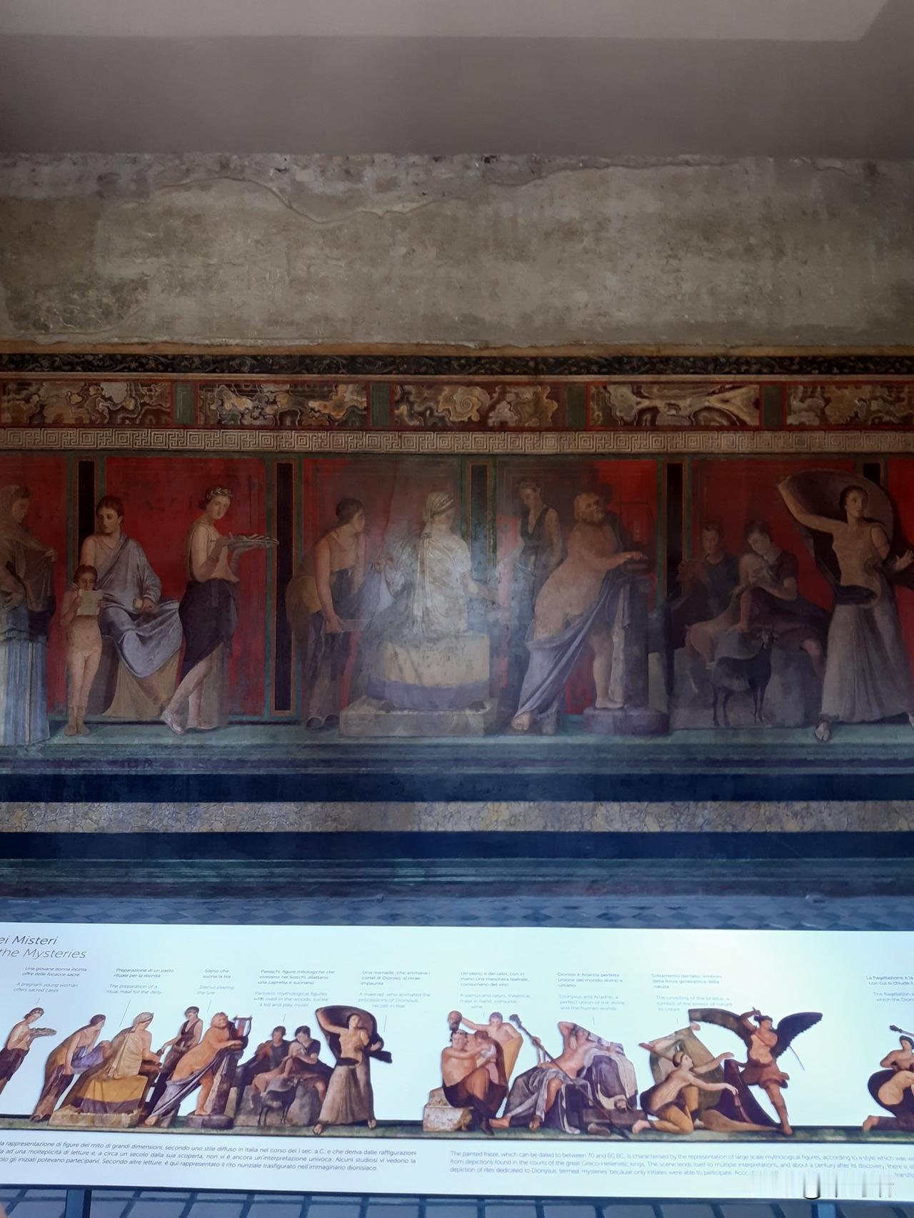 这幅照片展示了庞贝神秘别墅(Villa of the Mysteries)中最著名的壁画,描绘了戴欧尼修斯神秘仪式的场景。这些保存完好的古罗马壁画以其鲜艳的“庞贝红”背景和真人大小的人物形象而闻名。 壁画详情 地点: 意大利庞贝城郊的神秘别墅。 年代: 绘制于公元前 70-60 年左右,采用“庞贝第二风格”壁画技术。 主题: 最普遍的解释是描绘了一名女子(或新娘)加入戴欧尼修斯(罗马神话中的巴克斯,酒神)秘密教派的入会仪式。 保存状况: 公元 79 年维苏威火山喷发将别墅埋葬在火山灰下,意外地使这些壁画得以完好保存至今。 重要性: 这些壁画是现存最杰出的古罗马壁画之一,提供了了解古代神秘宗教和罗马精英生活的重要线索。 场景描绘 (从左到右) 壁画环绕整个房间,形成一个连续的叙事场景。 左侧: 一名坐着的贵妇人(可能是别墅女主人)和一名正在阅读神圣卷轴的裸体青年,一名女子手持托盘站在旁边。 中间: 描绘了戴欧尼修斯(半裸)和他的妻子阿里阿德涅,这是仪式的核心时刻——神的显现。 右侧: 包括一系列仪式场景,例如神女(maenads)和萨堤尔(satyrs)的描绘,以及一个描绘鞭打(可能象征精神上的死亡与重生)和一位新娘在准备的场景。