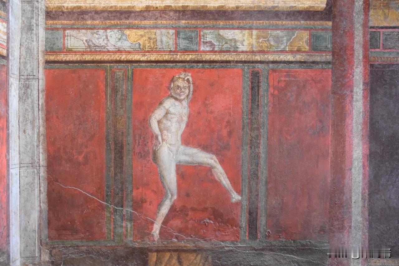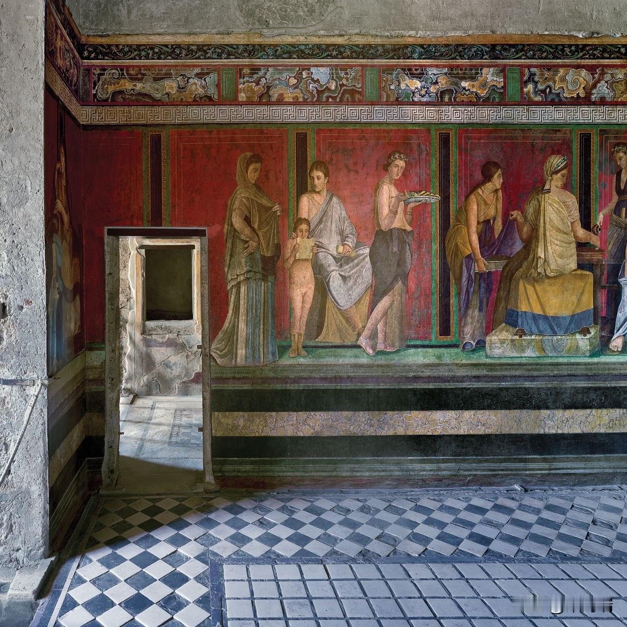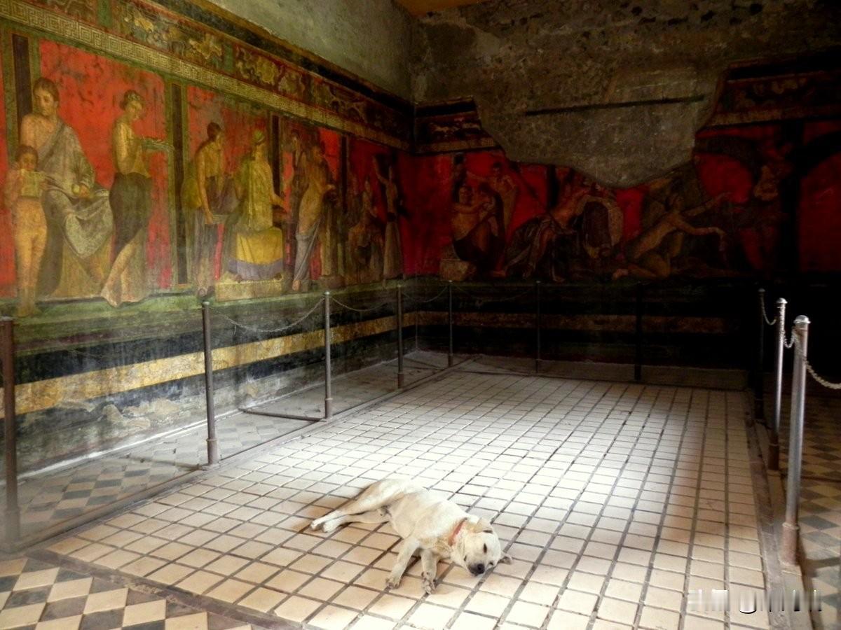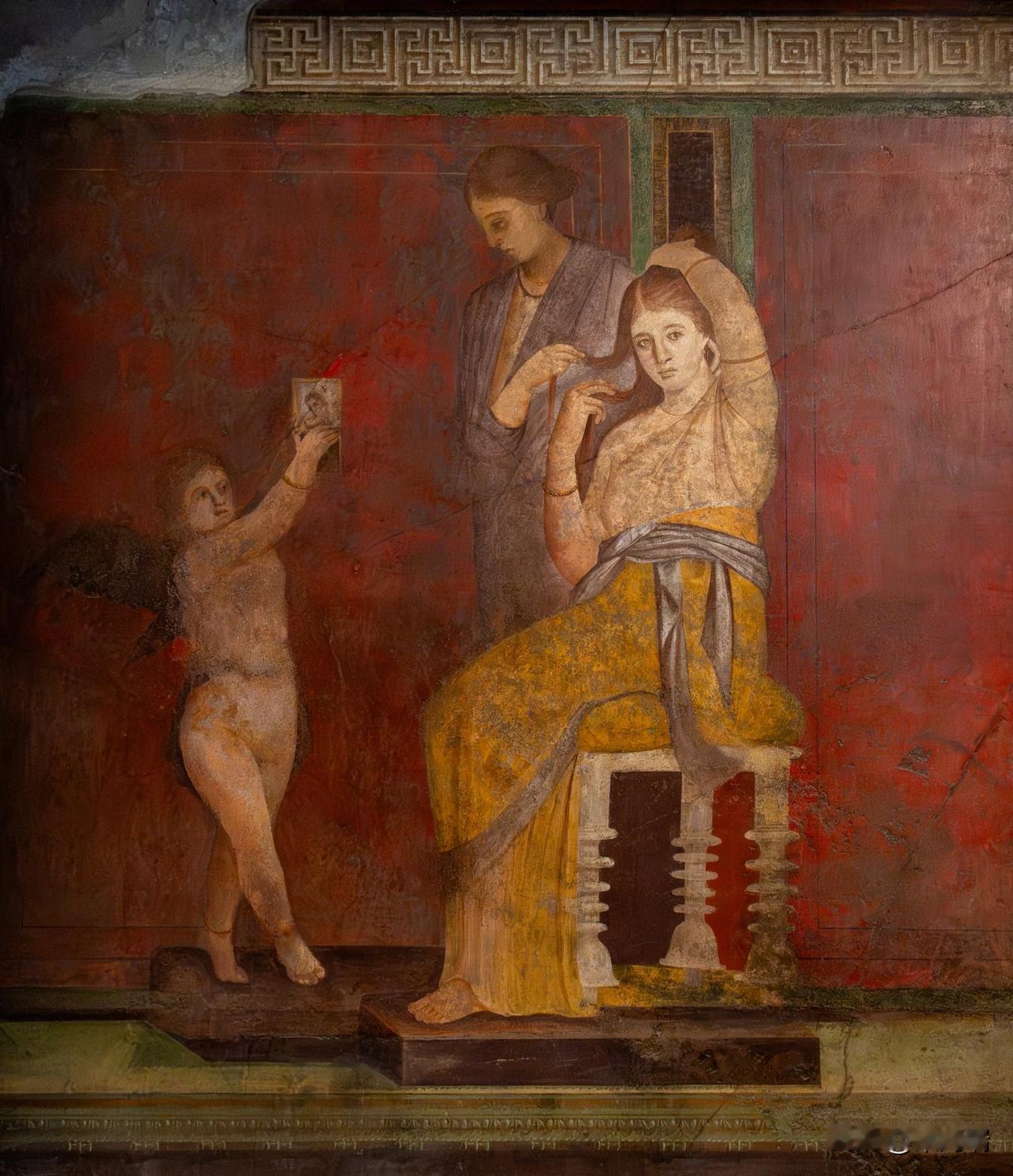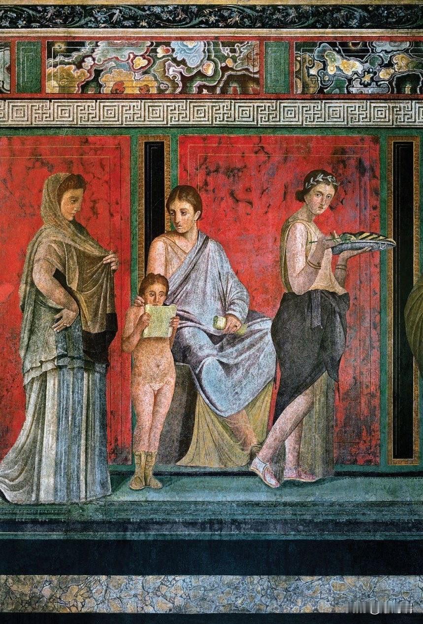 这幅照片展示了庞贝神秘别墅(Villa of the Mysteries)中最著名的壁画,描绘了戴欧尼修斯神秘仪式的场景。这些保存完好的古罗马壁画以其鲜艳的“庞贝红”背景和真人大小的人物形象而闻名。 壁画详情 地点: 意大利庞贝城郊的神秘别墅。 年代: 绘制于公元前 70-60 年左右,采用“庞贝第二风格”壁画技术。 主题: 最普遍的解释是描绘了一名女子(或新娘)加入戴欧尼修斯(罗马神话中的巴克斯,酒神)秘密教派的入会仪式。 保存状况: 公元 79 年维苏威火山喷发将别墅埋葬在火山灰下,意外地使这些壁画得以完好保存至今。 重要性: 这些壁画是现存最杰出的古罗马壁画之一,提供了了解古代神秘宗教和罗马精英生活的重要线索。 场景描绘 (从左到右) 壁画环绕整个房间,形成一个连续的叙事场景。 左侧: 一名坐着的贵妇人(可能是别墅女主人)和一名正在阅读神圣卷轴的裸体青年,一名女子手持托盘站在旁边。 中间: 描绘了戴欧尼修斯(半裸)和他的妻子阿里阿德涅,这是仪式的核心时刻——神的显现。 右侧: 包括一系列仪式场景,例如神女(maenads)和萨堤尔(satyrs)的描绘,以及一个描绘鞭打(可能象征精神上的死亡与重生)和一位新娘在准备的场景。