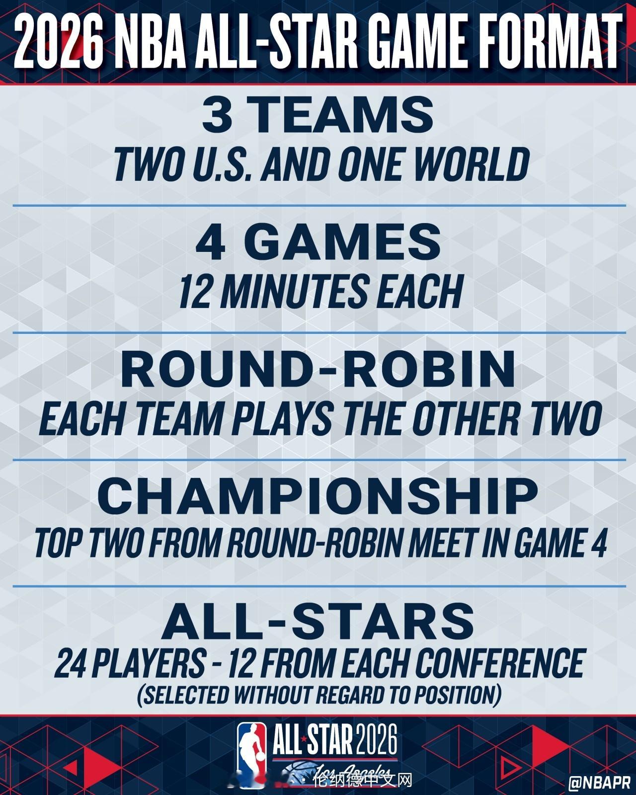 NBA官方今日官宣,2026年全明星将开启美国队VS世界队的全新赛制!2支美国队和1支世界队(每队8名全明星)将参加组内循环赛,合计进行4场比赛,每场12分钟。组内循环赛的前2名队伍将进入决赛争夺冠军。