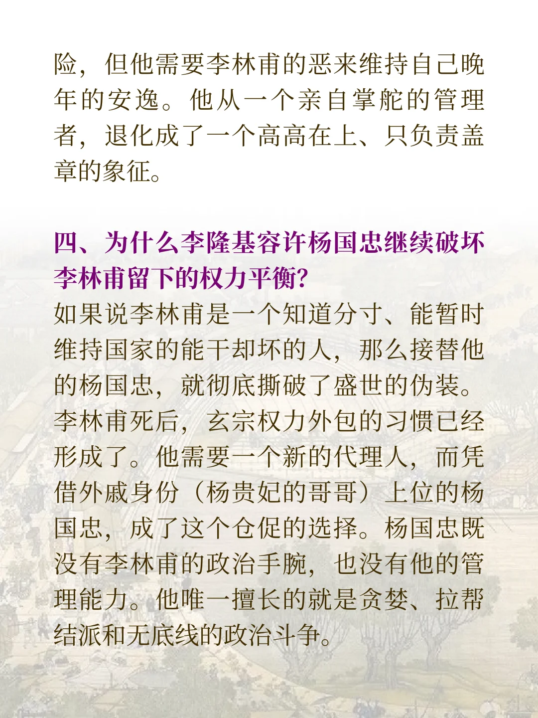 这种心理转变,引来了李林甫和杨国忠这些人的登场。他不是不知道这些人的坏,只是他更需要他们提供安逸和舒适区,帮他挡掉所有不中听的意见。一个曾经英明神武的君主,就这样在盛世的惯性和自满中,亲手把自己变成了听不到真话的孤家寡人。今天这篇文章,带大家深入剖析李隆基的 双面人生,看看他是如何一步步从盛世缔造者沦为悲剧推手的。这不仅仅是一个人的故事,更是一个帝国崩塌的必然逻辑。