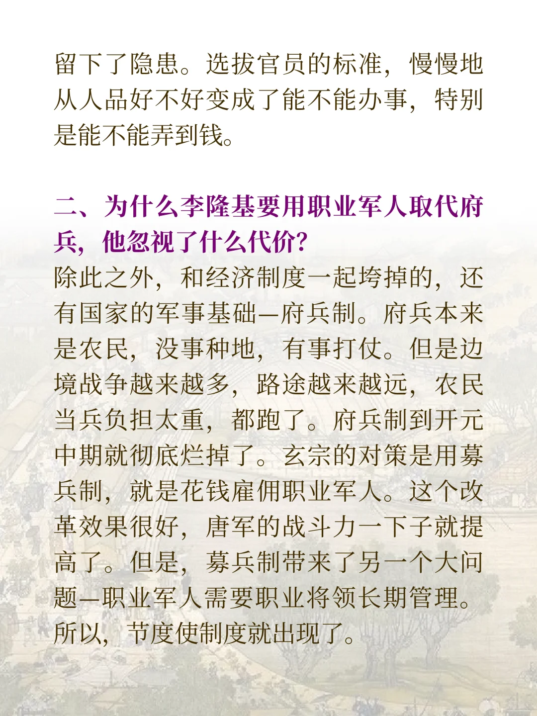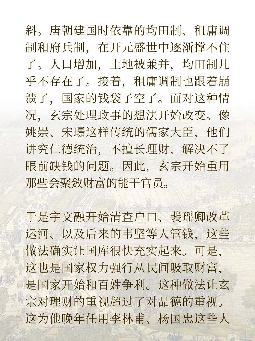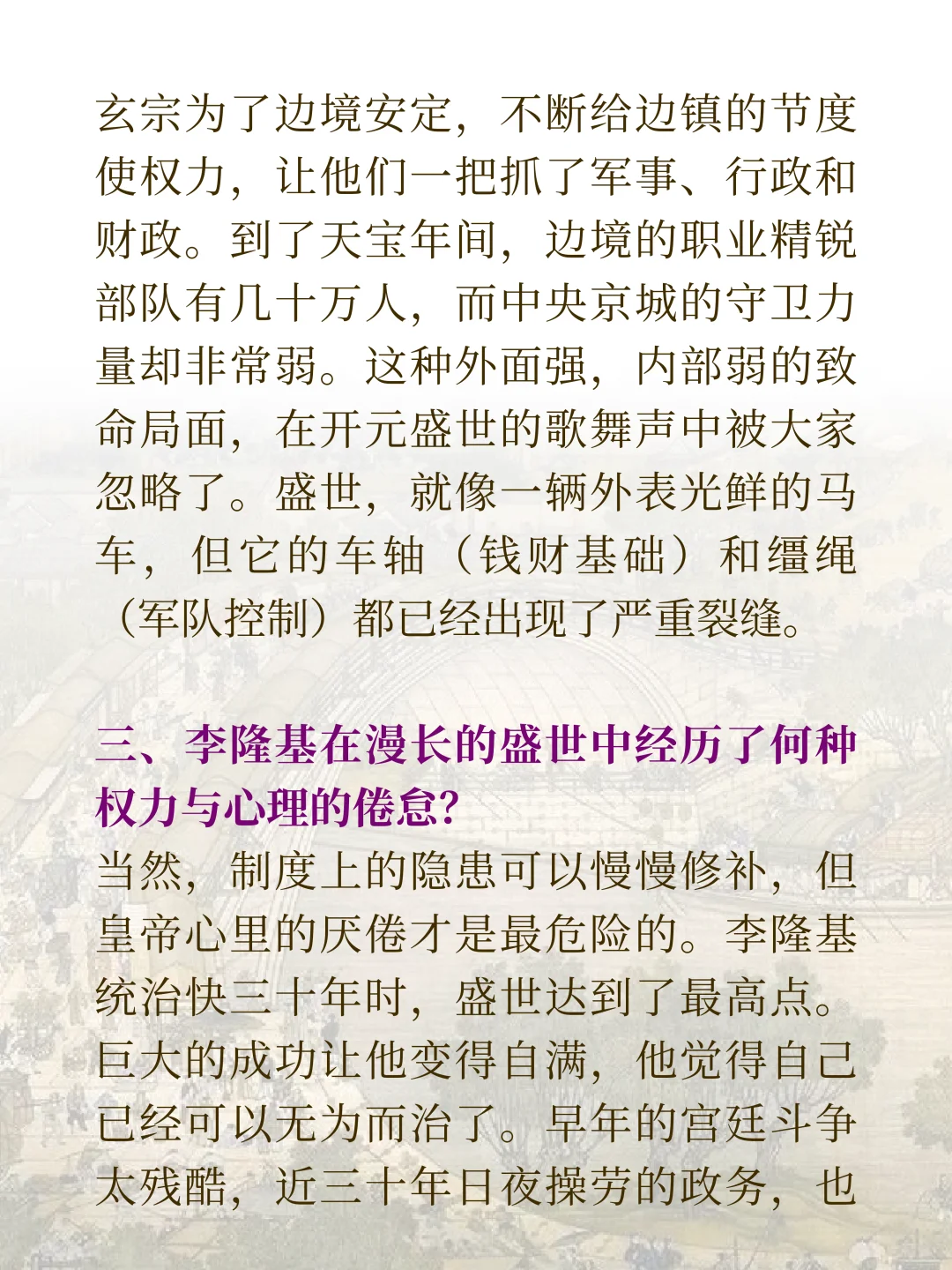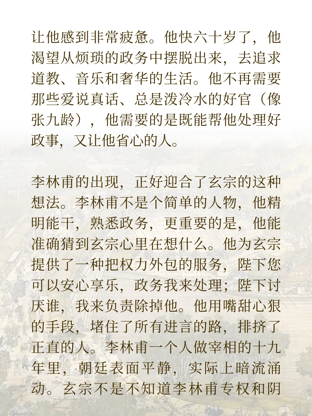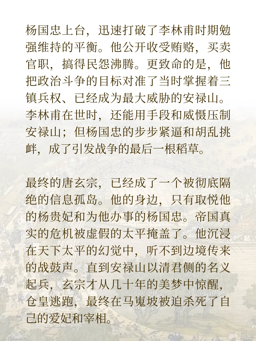 其实,早在繁荣的顶峰,李隆基就已经为后来的崩溃埋下了定时炸弹。他为了解决国家的财政困难,开始重用那些会搞钱的人,慢慢忽视了官员的品德。同时,他把边境军队的大权全给了节度使,造成了中央权力空虚、外面兵力太强的致命格局。他以为国家已经牢不可破,所以他累了,开始厌倦每天处理政务,渴望有人替他操心。