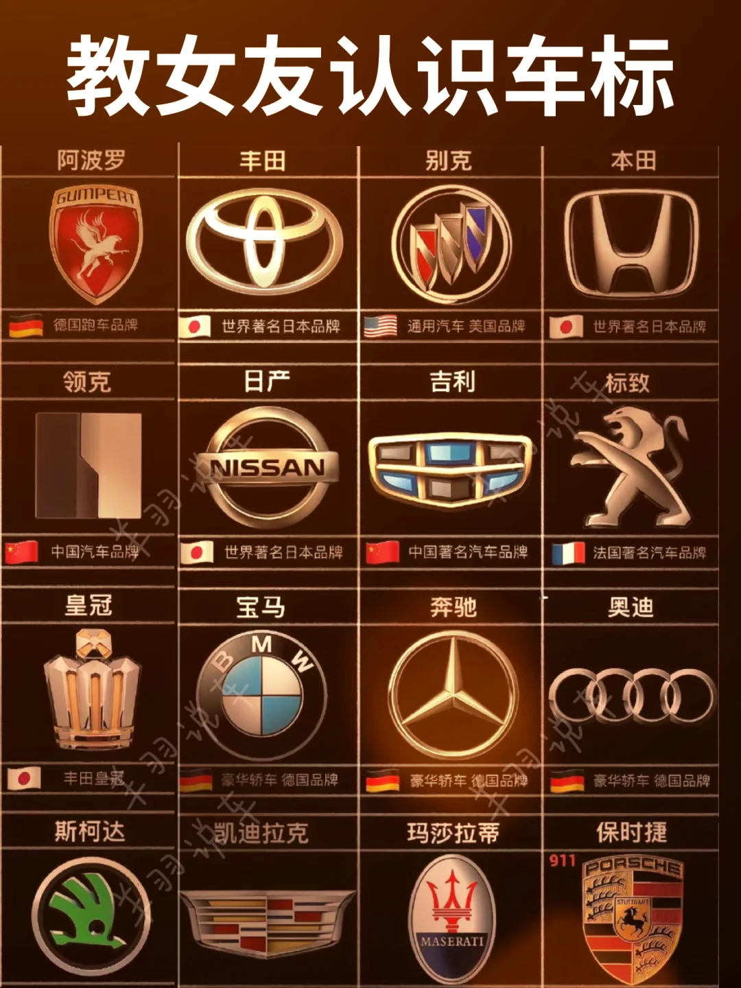 🇩🇪德国:知名的有奥迪、奔驰、宝马、大众、保时捷等。奥迪科技感十足,很多前沿科技率先应用;奔驰以豪华舒适闻名,内饰设计和工艺精湛;宝马操控性能卓越;大众产品线丰富,品质稳定;保时捷专注高性能跑车。