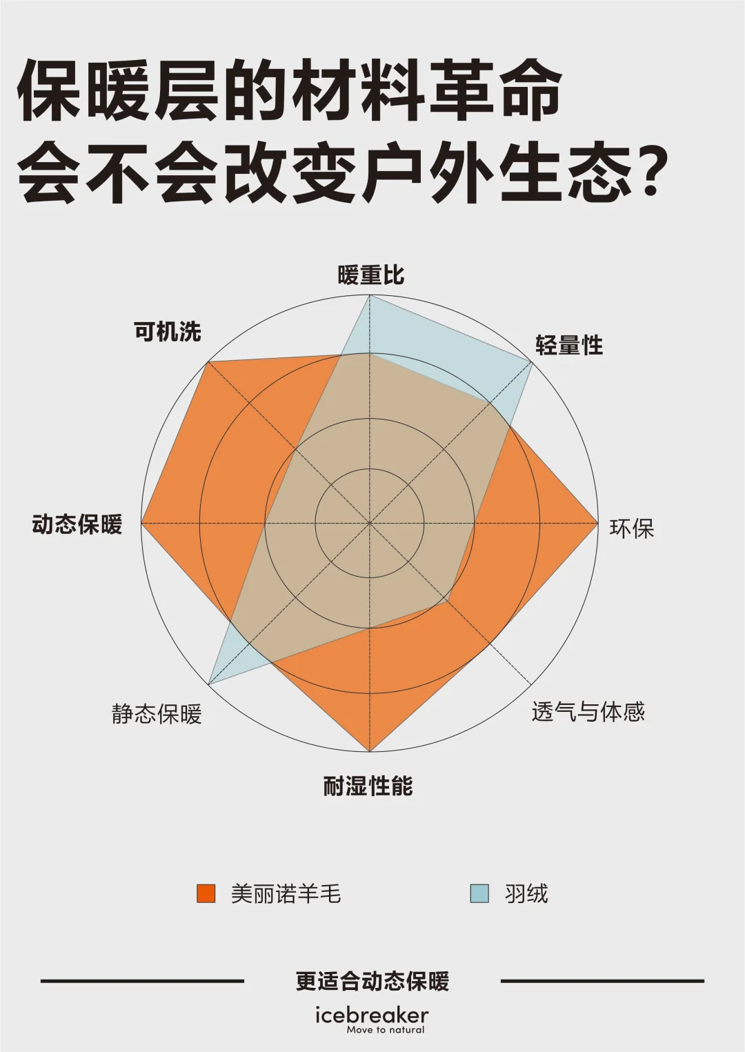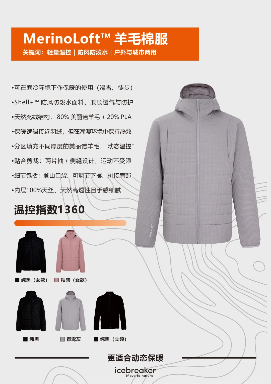 这几年,真正的“保暖材料革命”其实在悄悄发生。不是更复杂的科技,而是更聪明的自然。看完整个户外系统,也只有icebreaker在思考替代羽绒的保暖材料如何能做到更天然,且更平衡。1360温控指数这个系列就挺有代表性:采用美丽诺羊毛 + PLA 生物基纤维,把天然纤维变成了高性能保暖层