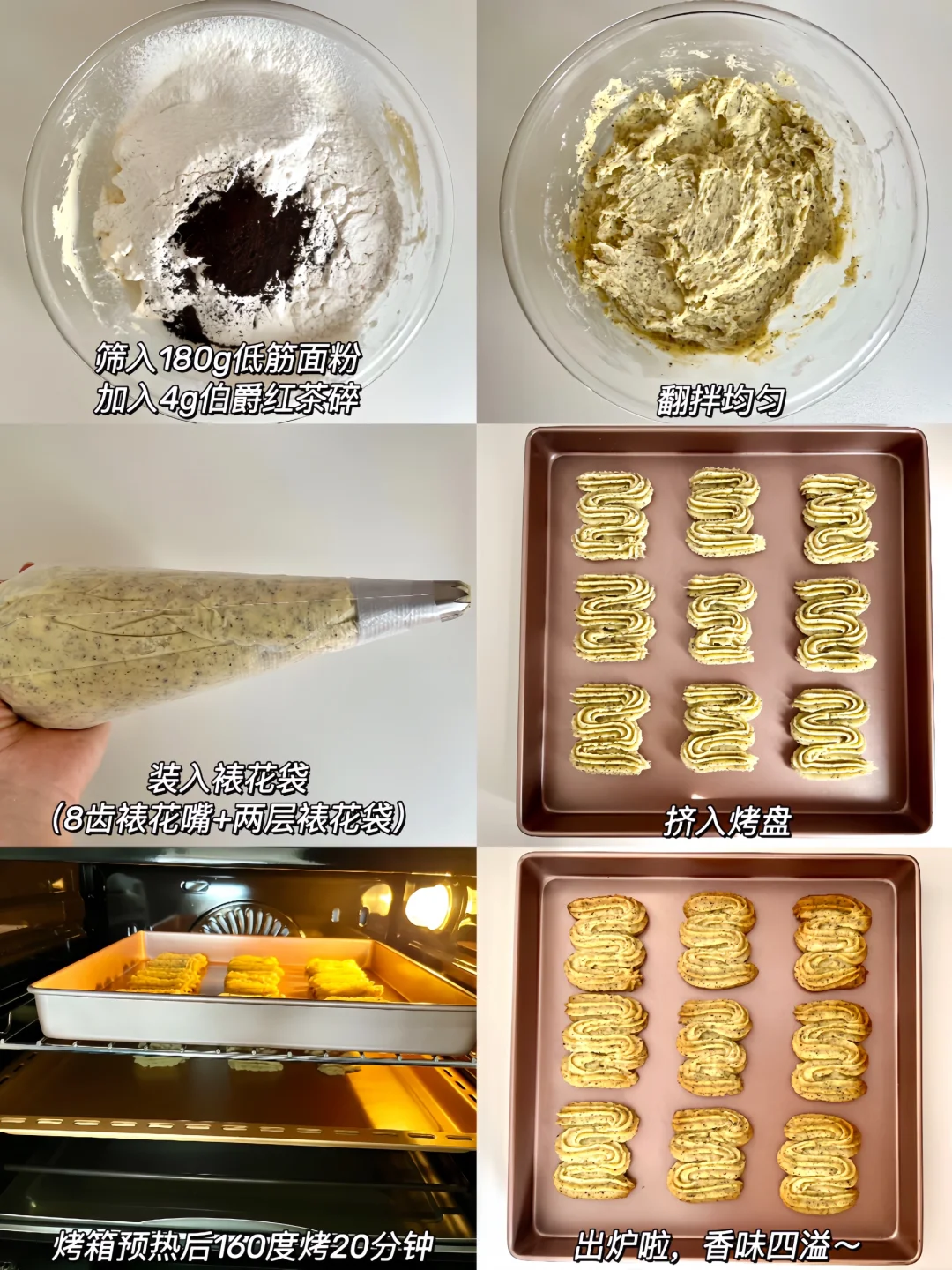 今天给大家分享我新发现的宝藏小零食——伯爵红茶维也纳曲奇,一口下去,满满的伯爵红茶香,饼干酥脆可口、甜度适中,真的会让人一口就爱上! 材料:黄油150g、糖粉60g、蛋清25g、低筋面粉180g、伯爵红茶碎4g 🔎具体做法见图