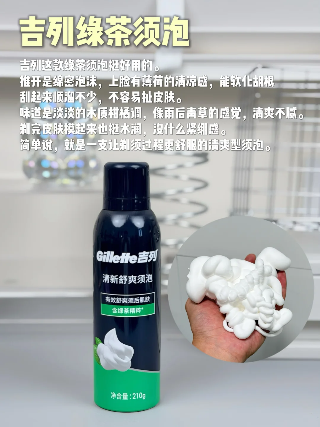 搭配它家剃须刀体验感加分。泡沫细腻,带点清凉薄荷感,软化胡根后刮起来更顺。淡淡绿茶柑橘香,剃完脸上清爽不黏腻