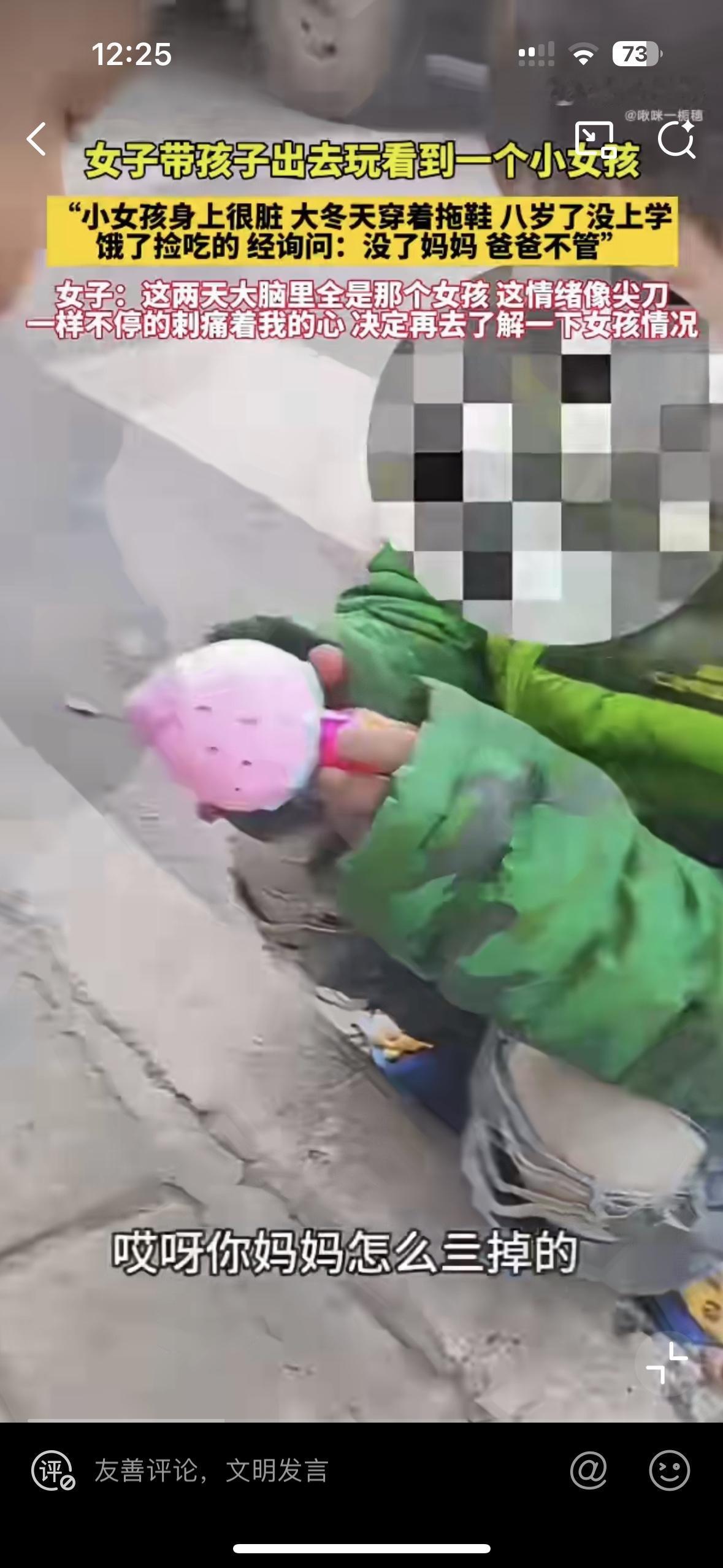 这真是太可怜了! 妈妈肺癌死了,爸爸也不管 一女子带着儿子去买衣服,看到大冬天的8岁的女孩在街上流浪!还穿着夏天的拖鞋 浑身上下脏兮兮的,正在地上捡吃的。一问才知道她妈妈癌症去世,爸爸不管她,家里还有一个哥哥和一个妹妹 孩子被迫辍学捡食,说句难听的话,如果不是被曝光,这女孩到什么时候才会被照顾上呢?看着实在令人心酸!