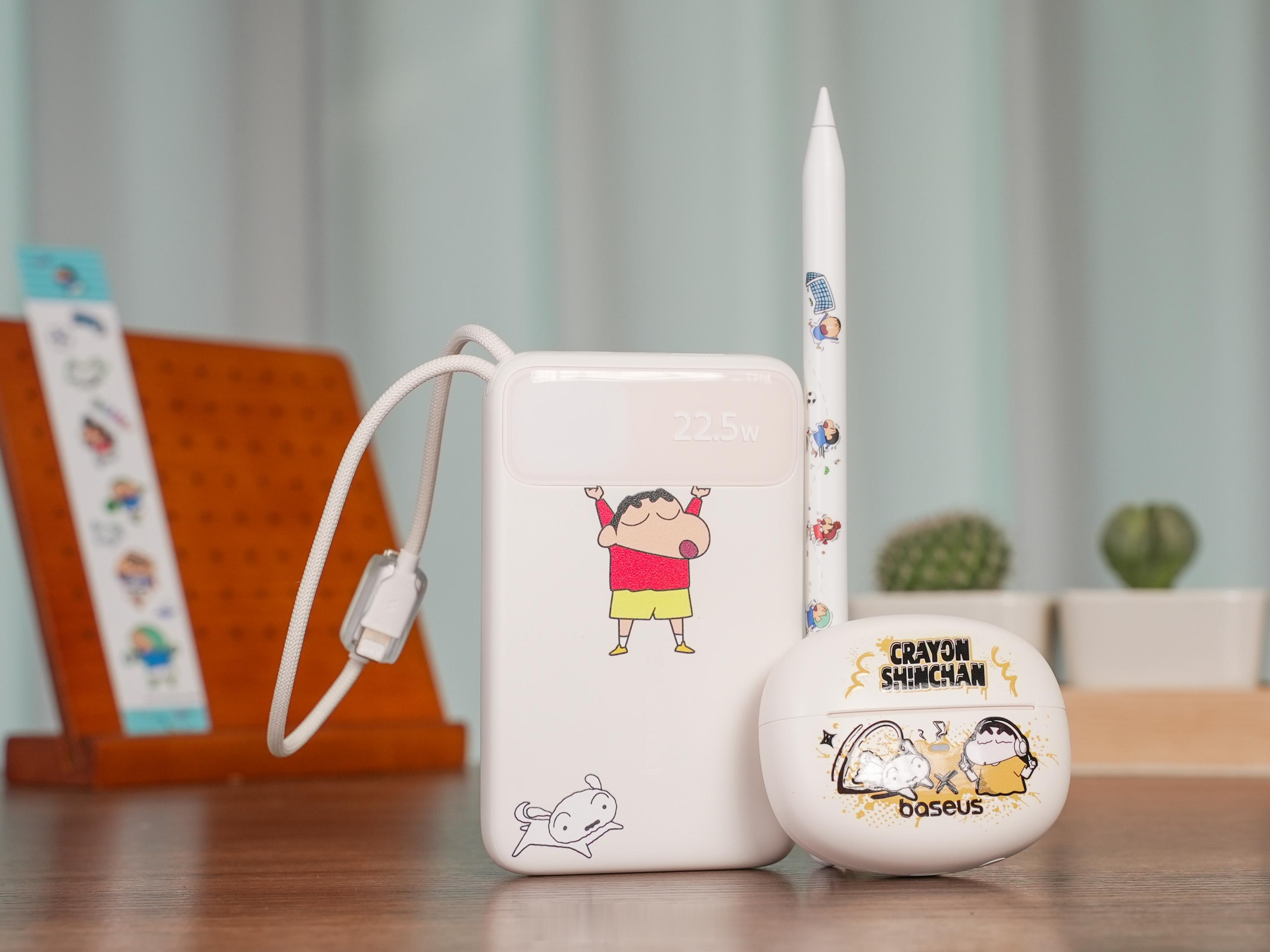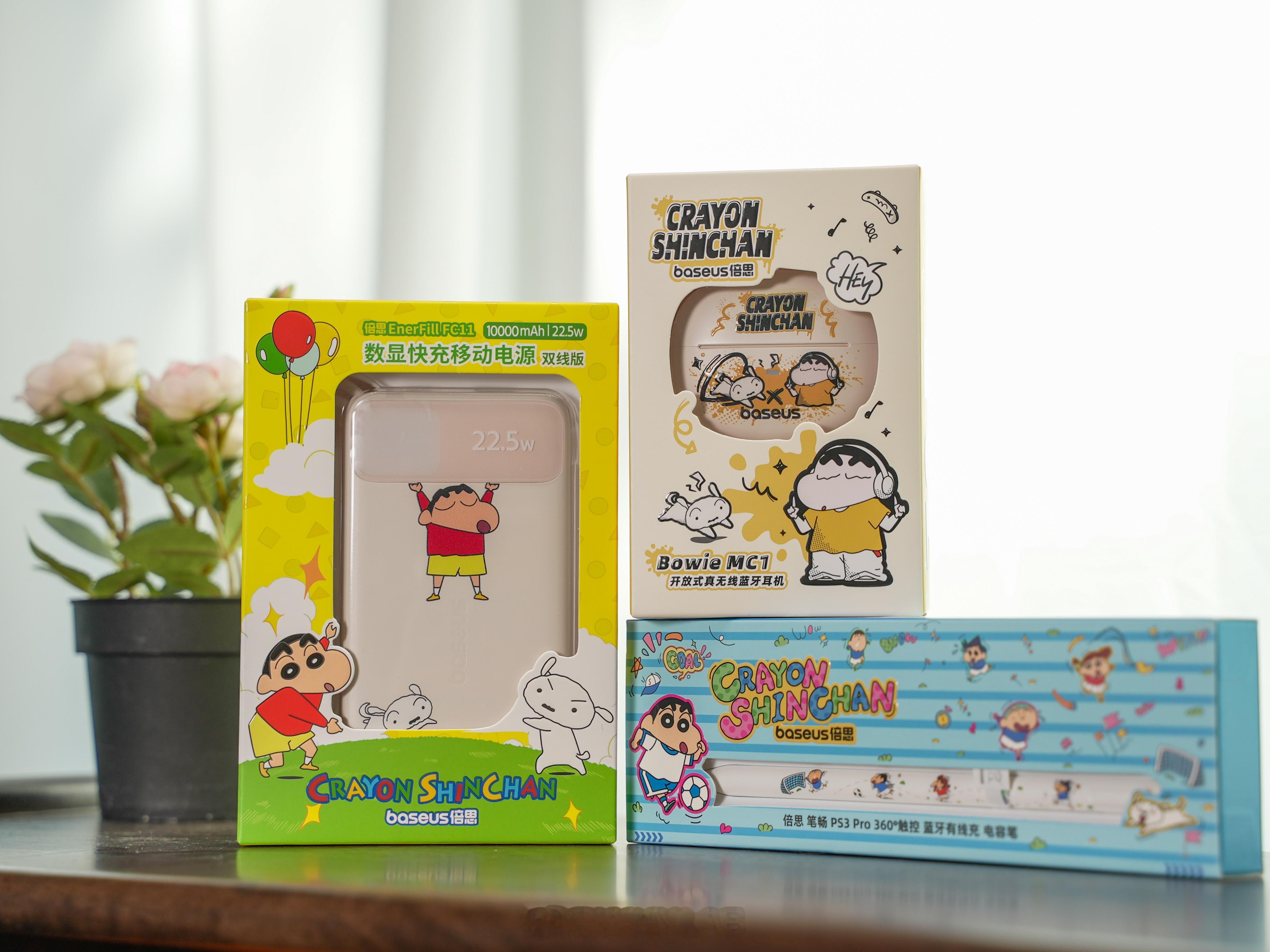 刚上手倍思和蜡笔小新的三款联名新品,笔畅 PS3 Pro 电容笔、MC1 耳夹式蓝牙耳机和 FC11 掌心充,不得不说倍思这次真的用心了!整体都是小新和小白的元素,搭配得特别舒服,完全不杂乱,而且每个产品上的图案动作都不一样,真的萌到我了~再说说实际用着的感受:电容笔能 10 米内隔空翻页,不用碰屏幕还挺方便,笔身轻点两下就能撤销写画,笔芯是 LDS 镀金的,写画的时候不会断触。耳夹耳机整体星光白的配色,单耳才 5.3 克,戴在耳朵上几乎没感觉,续航能到 40 小时,还支持 IPX7 防水。移动电源是 10000 毫安的,支持 22.5W 快充,自带 USB-C 和 Lightning 双接口的线,常见的快充协议都兼容,出门不用额外带线。