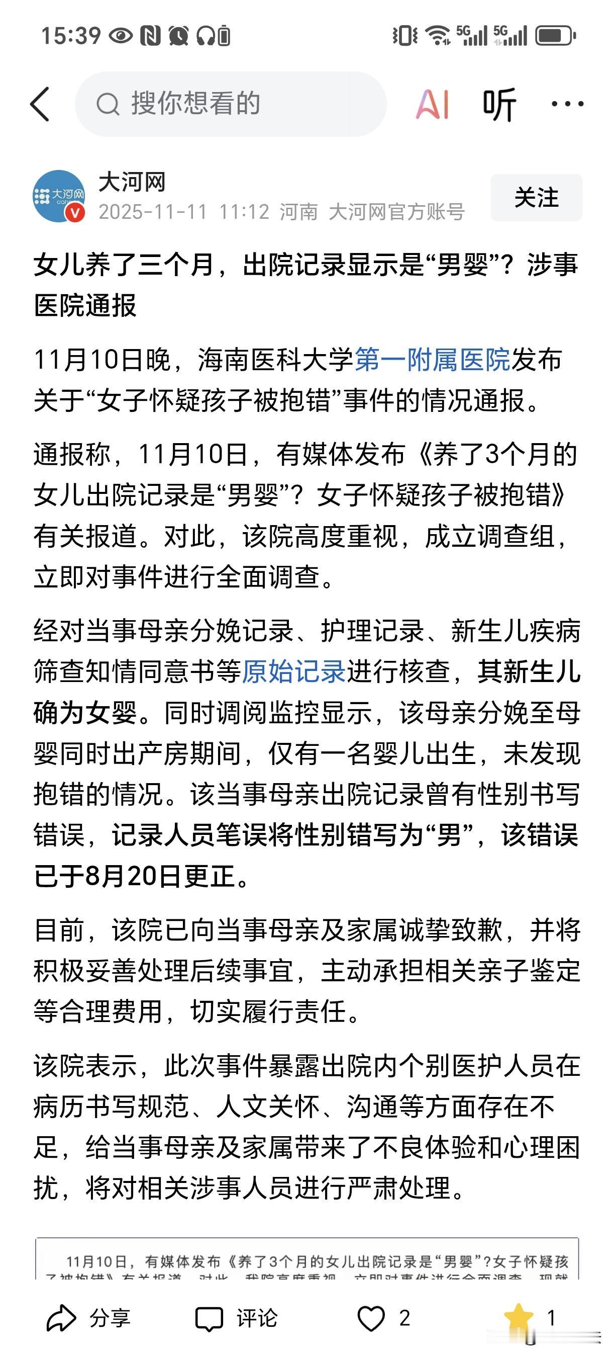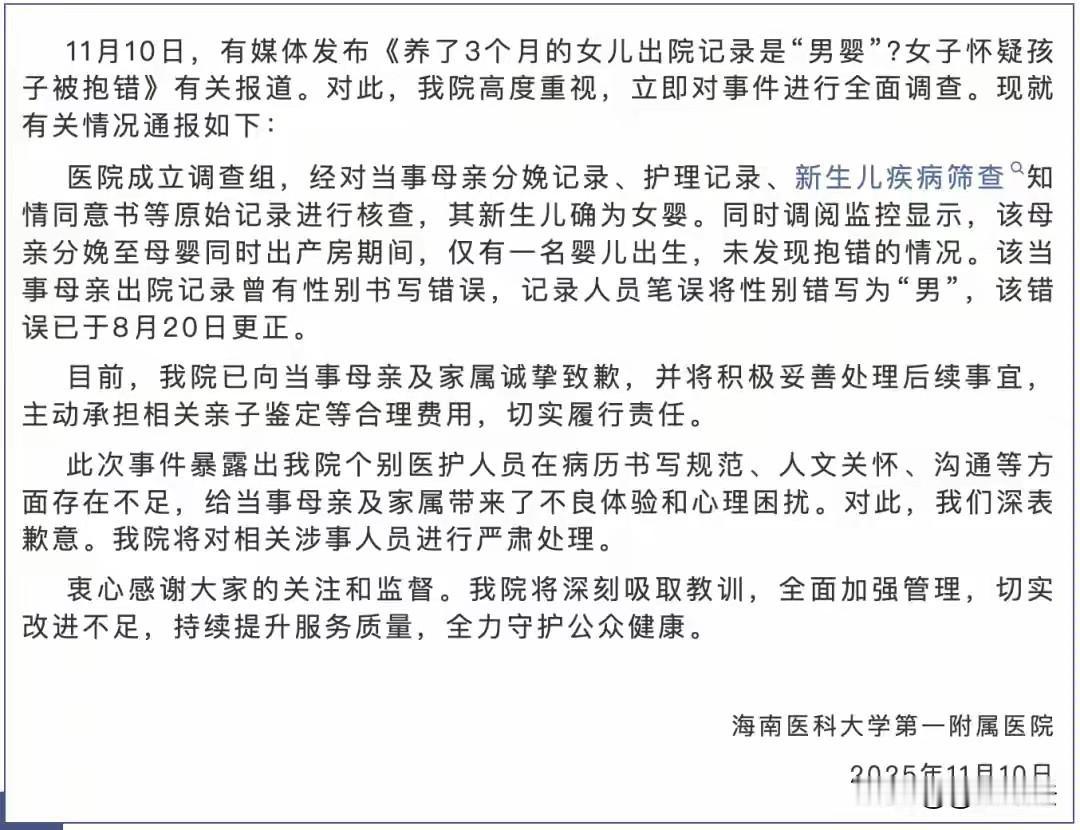 “太荒唐了!”海南,一女子生了个孩子,医院抱过来的是个女孩,悉心照顾了三个月。不料,女子整理出院材料时,发现出院小结写着“分娩一活男婴”,而她怀里抱着的分明是女儿。女子开始疯狂回忆产房细节,特别是隔壁产妇那句“我生了男孩”,怀疑孩子是否抱错,陷入了深深的不安与焦虑。面对质疑,医院最初的回应仅是“可以改正”,反而加剧了她的恐惧。事后,医院针对此事专门做了通报,但难以打消网友们的疑虑。 2025年11月9日,李女士正照顾着她三个月大的女儿,得空后,就开始整理一些文件,无意中翻出了三个月前在医院生孩子的出院记录。 出院记录是一张简单的纸张,上面罗列着李女士的分娩情况和出院指导。 李女士的目光扫过一行行文字,突然停在了“分娩一活男婴”这几个字上,她愣住了,反复读了几遍,心里咯噔一下:“男婴?我生的明明是女儿啊!” 那一刻,李女士的脑子一片空白。三个月来,李女士每天抱着、喂着、呵护着的女儿,难道不是亲生的? 李女士赶紧翻出手机,拍下出院记录的照片,并发布了一段视频到网上。 视频里,李女士标注文字说:“今天拿出院小结一看,发现上面记录分娩一男婴,那我养了三个月的闺女是抱错了?” 李女士的视频很快引发了网友们的广泛关注,在社交媒体上,这条视频被大量转发和评论,许多人表达了对她的同情和支持。 有网友留言说:“赶紧去做亲子鉴定吧,别耽误了!”还有网友分享了自己的类似经历,提醒她医院抱错孩子虽罕见,但并非不可能。 李女士看到这些评论,想起分娩那天,产房里还有另一位产妇,当时那人回产房时说生了男孩。 此刻,李女士更加不安,心想“是不是护士忙中出错,把我们的孩子调换了?”。 11月10日一早,李女士就匆匆赶到医院,带着出院记录和满腹疑问,想找医生问个明白。 医院的接待人员起初只是轻描淡写地说:“可能是打错了,改一下就好。” 李女士因医生没有其他解释,到底生的是男婴还是女婴,她已经有点不确定了。 同一天,记者联系到了医院,医院工作人员回应称,产妇在该院生孩子有严格的流程,不可能抱错孩子;生产后,医护人员会第一时间告知婴儿性别,以确保信息准确。 对于记录错误,他们解释说:“病历、出院小结等文书上,性别出现错误是有可能的,这是可以找医生改的。” 工作人员还表示,如果患者有疑问,可以自行做亲子鉴定,如果确实错了,产生的任何费用以及相关责任医院都会承担。 11月10日晚,医院发布了正式通报,确认李女士的新生儿确为女婴,不存在抱错的可能性。 至于出院记录上的“男婴”字样,医院解释是记录人员的笔误,这个错误早在李女士出院后不久就已更正。 通报中,医院向李女士及家属诚挚道歉,并承诺积极处理后续事宜,包括承担亲子鉴定等合理费用。 同时,医院承认在病历书写规范、人文关怀和沟通方面存在不足,将对相关涉事人员进行严肃处理。 那么,从法律角度,这件事如何评价呢? 1、医院出院记录书写错误行为是否构成侵权或违约? 《民法典》第一千二百一十八条规定,患者在诊疗活动中受到损害,医疗机构或者其医务人员有过错的,由医疗机构承担赔偿责任。 本案中,医院出具载有错误的出院记录,属于履行合同义务不符合约定,即存在瑕疵履行。该笔误虽然未直接造成李女士女儿身体上的损害,但为其带来了巨大的精神困扰和不安,构成了对合同附随义务的违反。 更关键的是,这一行为可能构成侵权,医务人员因疏忽大意将婴儿性别写错,存在明显的过错,该过错行为与李女士产生怀疑、焦虑并为此奔波求证包括计划进行亲子鉴定之间,存在直接的因果关系。 因此,医院的行为同时构成了违约与侵权的竞合,李女士可以择一主张权利,在司法实践中,基于精神损害赔偿的考虑,选择侵权责任路径更为常见。 2、医院要承担哪些民事责任? 《民法典》第一千一百六十七条规定了侵权责任的承担方式,包括停止侵害、排除妨碍、消除危险、返还财产、恢复原状、赔偿损失、赔礼道歉和消除影响、恢复名誉。 本案中,医院在通报中公开致歉,是承担此种责任的具体体现。 此外,医院的错误行为造成李女士的烦恼和不安,持续数月的焦虑、失眠,为求证而奔波,其精神痛苦已达到需要法律救济的程度,可能要承担精神损害赔偿。 同时,医院承诺承担亲子鉴定的费用,是其为弥补过错、消除损害后果而采取的合理措施。这笔费用属于因其侵权行为而直接导致的财产支出,理应由医院承担。 3、此外,如果医院存在抱错小孩的情况,则不是简单的民事赔偿责任了,这已经存在严重违反医疗卫生管理规定承程度,面临警告、罚款、停业整顿、吊销执业证书,甚至构成医疗事故罪等刑事犯罪。 对此,您怎么看?