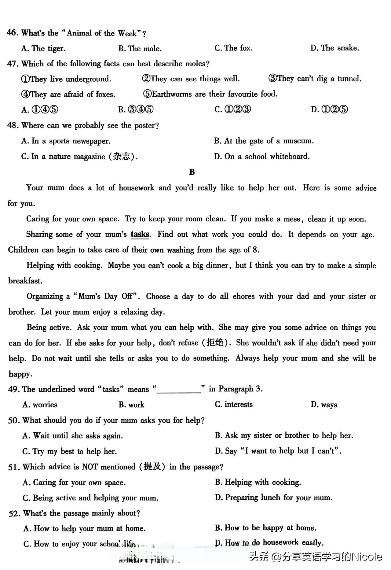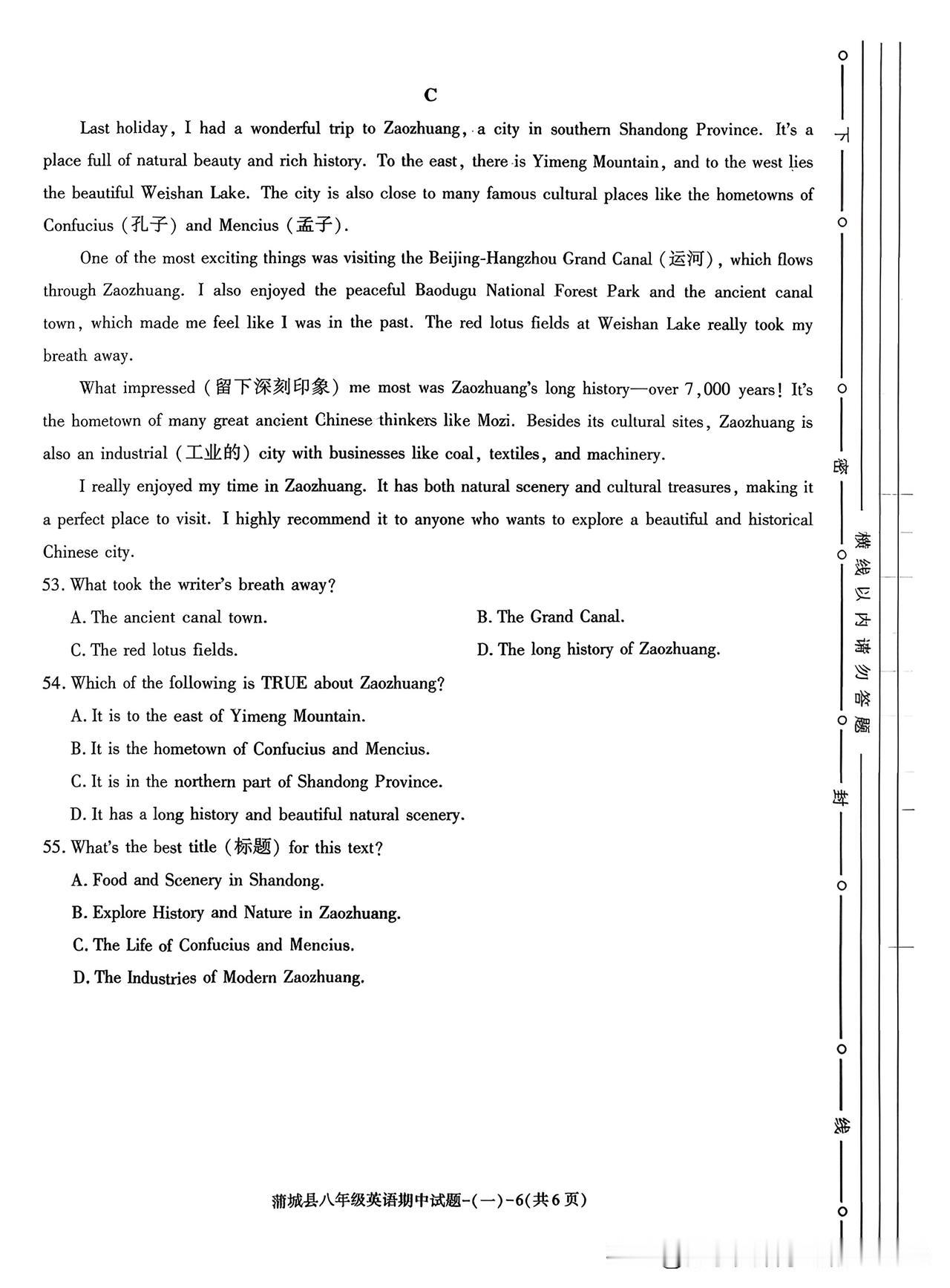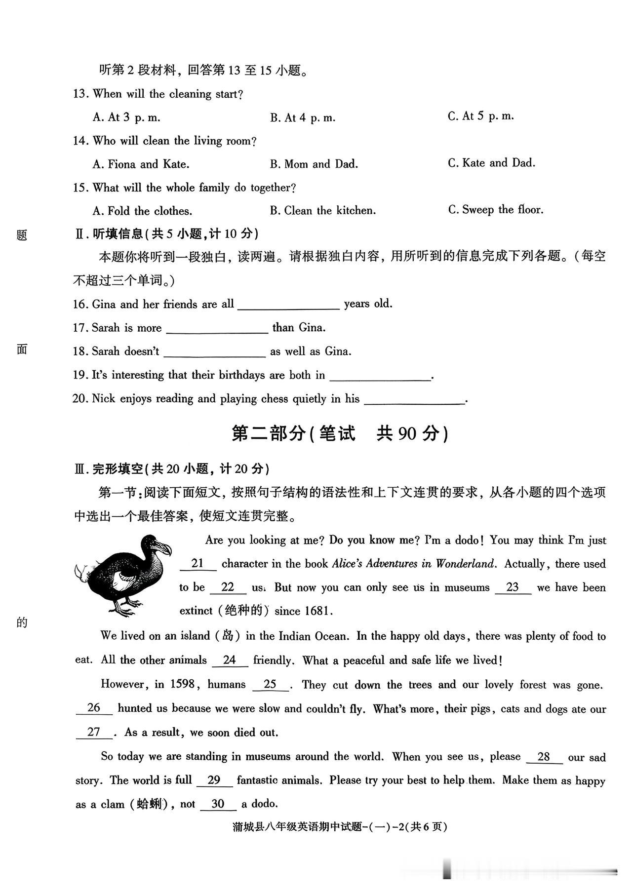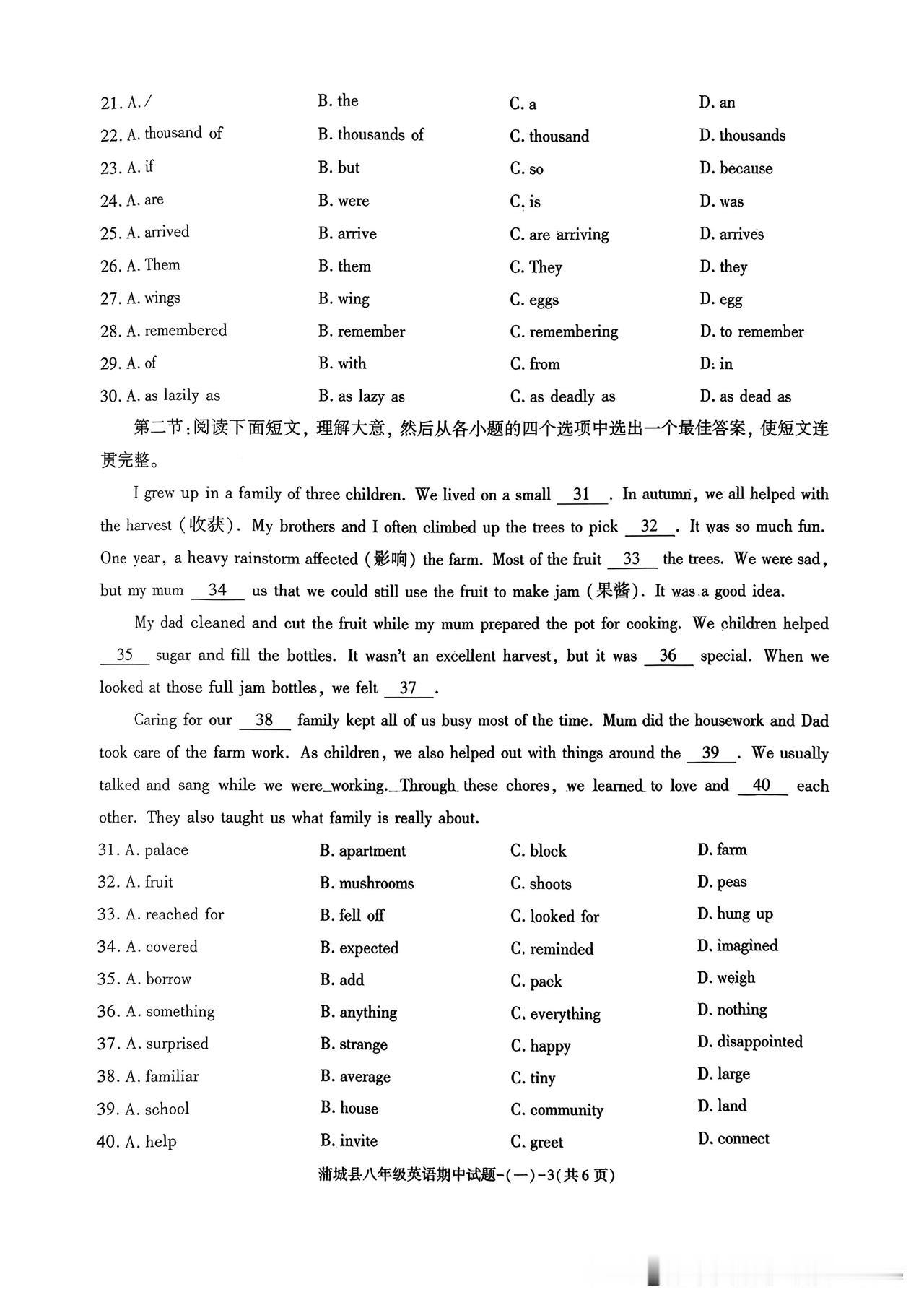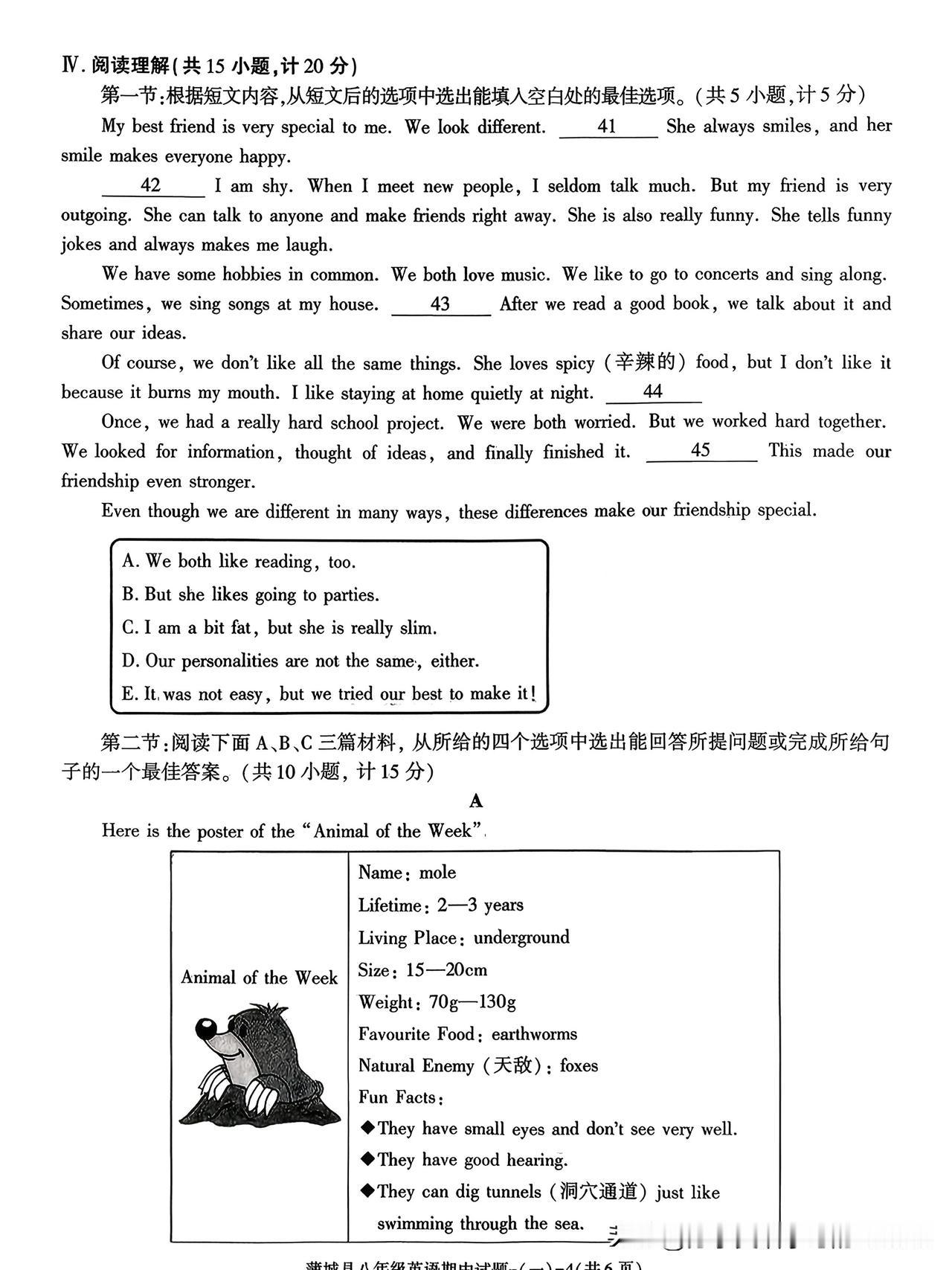 这份试卷主要考查基础语言知识运用、语篇理解与表达能力,符合八年级英语的学习重点,具体分析如下: 考查内容特点 1. 基础语言知识 - 完成句子(V):考查常用短语(如“相聚”“事实上”)、固定搭配(如“看电影”“解决问题”),侧重“汉译英”的实用性表达。 - 短文填空(VI):涉及词汇的词性转换(如 mother→mother's 、 one→First )、固定短语( try one's best )、语法(如 be动词 、动词时态),同时需要结合语篇逻辑(动作顺序、情感描述)。 2. 语篇理解与应用 - 任务型阅读(VII):通过“采访信息”的语篇形式,考查细节提取(兴趣、频率、性格、出行方式),以及主旨概括(补全标题),侧重“信息匹配”能力。 - 交流与表达(VIII):补全对话考查情景交际(询问地点、出行方式、请求展示物品),贴近日常交流场景。 难度与适配性 - 整体难度适中,以基础题为主,符合八年级期中阶段的学习目标(巩固词汇、短语,初步培养语篇理解能力)。 - 易错点:短文填空的“词性变形”(如 action→actions )、任务型阅读的“主旨概括”(补全标题),需要学生结合语境灵活运用知识。