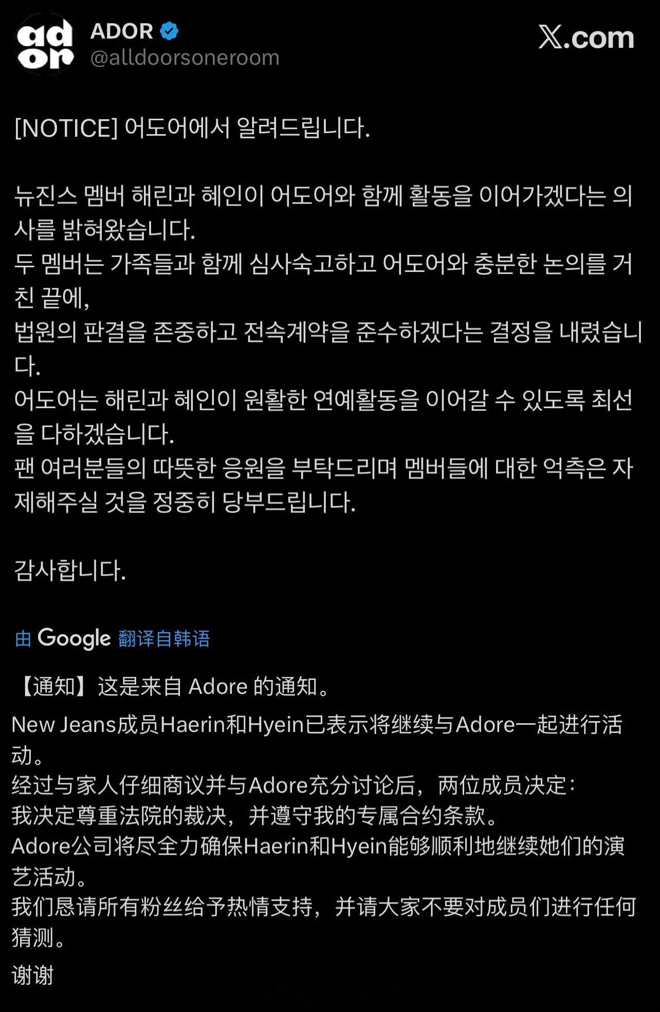 Ador发布公告表示:Haerin 李惠仁将回到Ador继续活动。