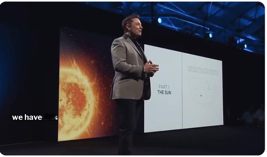 埃隆.马斯克:我们天空中已经有一个现成的聚变反应堆……它叫做太阳。 “我们天空中有一个现成的聚变反应堆,叫做太阳。” 你什么都不用做,它会自动生效。 大多数人认为,要取代化石燃料,甚至取代太空卫星,都需要大量的土地。 但实际上,美国只需要很少的土地就能彻底淘汰化石燃料发电。
