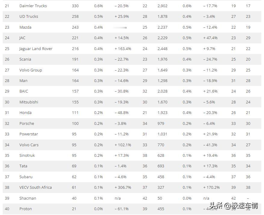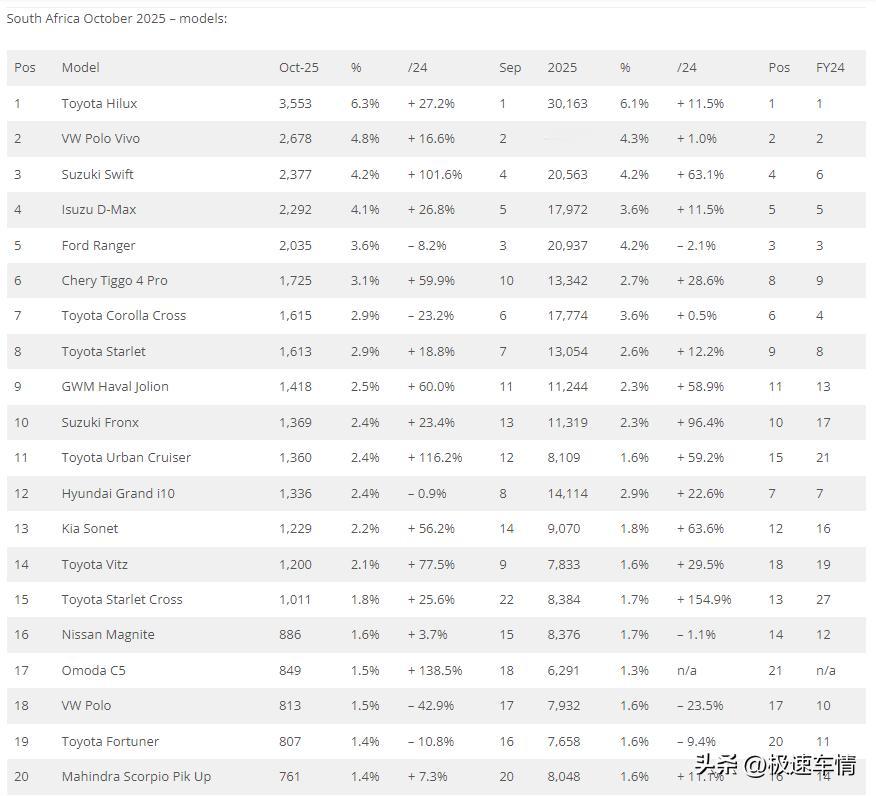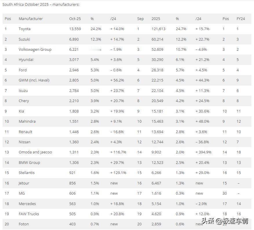 十月,南非车市延续强劲增长态势。丰田凭借全品类优势领跑,以奇瑞集团和长城集团为主的中国车企的高增长,代表中国汽车的竞争力还在持续提升。 2025年10月,南非新车销量同比增长16%至55,956辆,创十一年来最佳十月销量,连续8个月双位数同比增长、连续13个月同比增长。 2025年1-10月,南非累计同比增长15.7%至493,053辆。 中国品牌表现出色:长城(+56.2%)、奇瑞(+20.7%)、Omoda&Jaecoo(+116.7%)同比增幅超过市场,表现极具冲击力,成为十月亮点。奇瑞瑞虎4 Pro(+59.9%)环比 9 月上升 4 位至第6,追平历史最佳排名;长城哈弗 Jolion(+60%)增幅很大,表现亮眼。 长城:2805辆,第六名,市占率5%。 奇瑞集团:4377辆,市占率7.7%,可排第四! 1.奇瑞:2210辆,第八名,市占率3.9%。 2.奇瑞Omoda&Jaecoo:1311辆,市占率2.3%。 3.奇瑞捷途:856辆,市占率1.5%。 名爵:606辆,市占率1.1%。 一汽卡车:505辆,市占率0.9%。 福田:403辆,市场占有率0.7%。 江淮:221辆,市场占有率0.4%。 北汽:157辆,市场占有率0.3%。