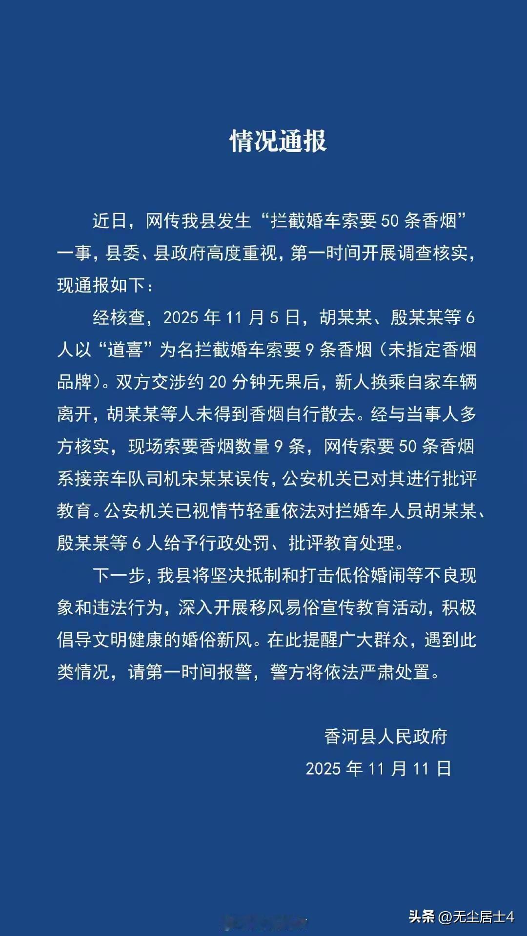 拦婚车,向新婚夫妇索要香烟的人已经被被处罚!该…… 山东省廊坊市香河县公安局经调查,核实,2025年11月5号拦婚车,向新婚夫妇索要香烟属实,但不是网传中的50条,而是9条,公安机关已对婚礼拦婚车的6名肇事者进行批评教育,并行政处罚。 香河县公安局对此事件处理效率还是很高的。 类似拦婚车索要财物不是香河县一个地区,这种恶习明面上说是沾点喜气,可是钱款巨大,背离了闹婚的初衷,有点拦路抢劫的味道。有的老人躺在车前面不让婚车走,有的老人还掰断劳斯莱斯的小金人,等等…… 其他地区也要效仿香河县公安局, 坚决抵制和打击低俗婚闹等不良现象和违法行为,居委会或村委会也要深入开展移风易俗宣传教育活动,让新婚不再“头昏”! 婚礼拦车要红包 拦婚车陋习 马路上拦婚车