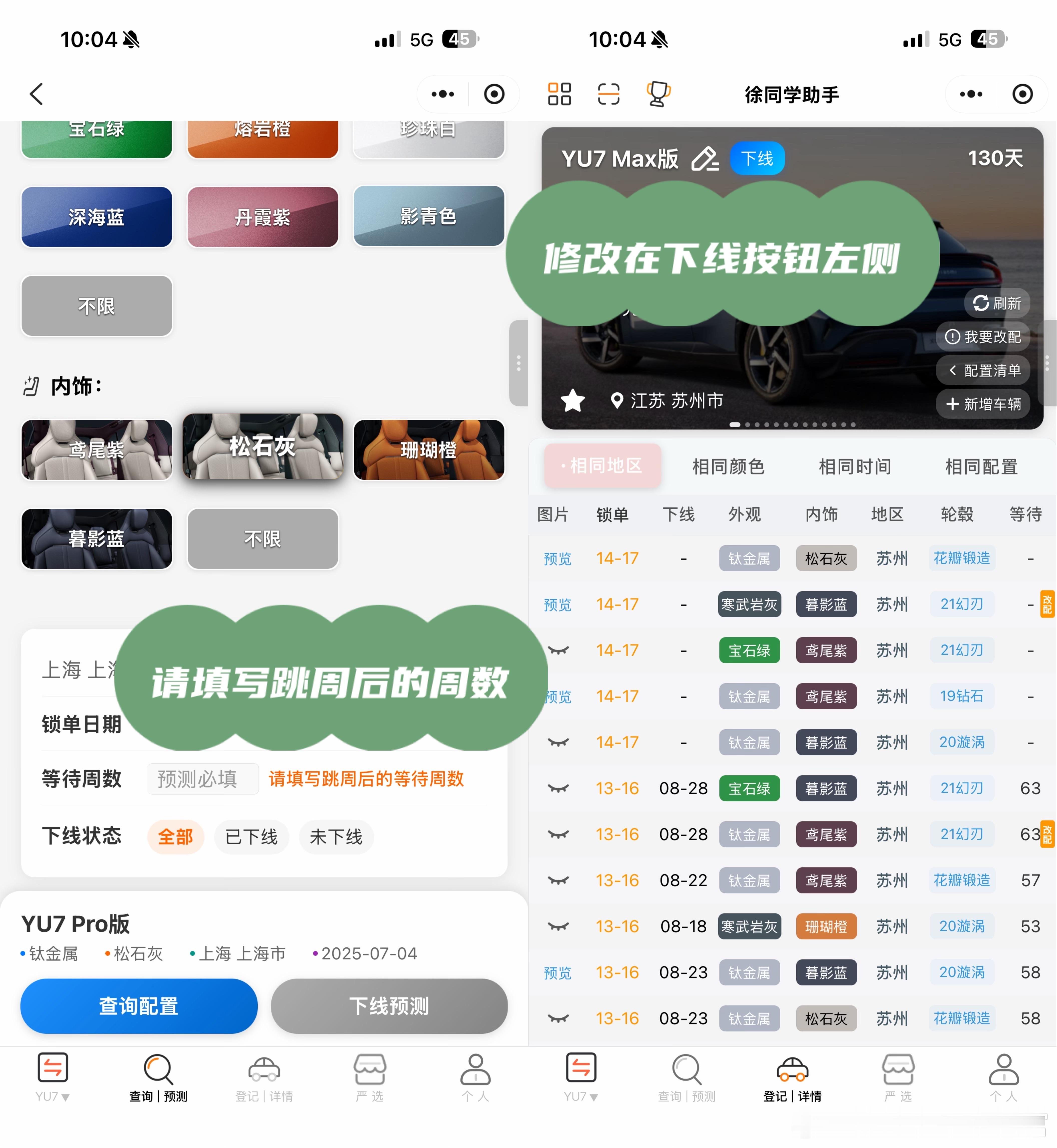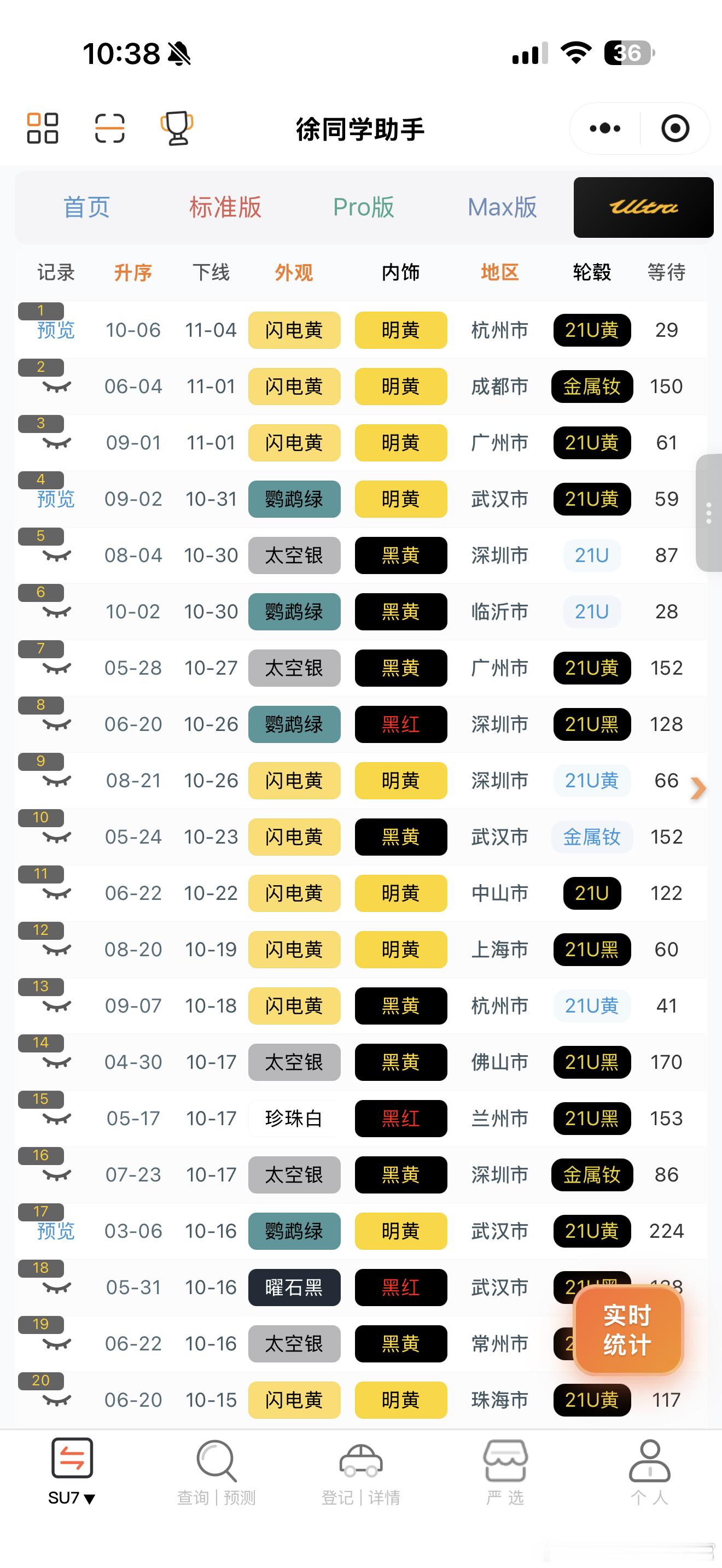 小米汽车(11月4日)下线实况小米SU7+YU7两个车型(含ultra)上周交付量14000+台,又一次破纪录了!雷总的目标是35万台,而今年已累计交付31.56万台,这样看40万台今年也问题不大~(数据源: )‼️跳周后记得修改周数,修改方法见图二🌀YU7(据不完全统计)合计235台1️⃣标准:下线98台,大部队22-23周,进度回撤结束,按照正常顺序继续生产2️⃣Pro:下线89台,大部队21-22周,车下的不少,进度却有点停滞,不过这个版本确实性价比最高3️⃣Max:下线48台,大部队26周左右,下线不算太多,但是进度很快,稀有色来了一大批🌀SU7(据不完全统计)合计103台1️⃣标准:下线49台,一大半停留在4月份,5月之后的稀有配置也随时会下线2️⃣Pro:下线27台,数量不多,等待时间基本都是160天左右3️⃣Max:下线27台,昨天开始大部队到7月了,进度太夸张了,甚至10.7的都下了,28天极速下线,恭喜这位幸运鹅 @ OPENITY 4️⃣ultra:新锁单的一个月左右下线现在YU7的存量订单也远远大于SU7,所以下线量才会分布不均