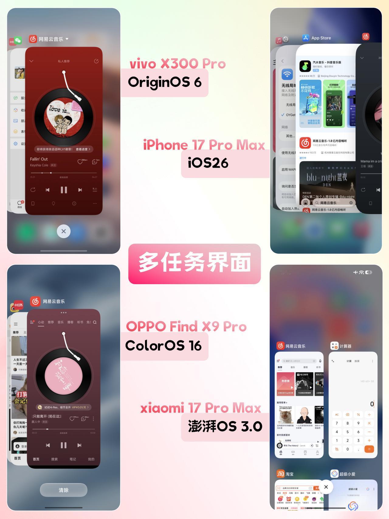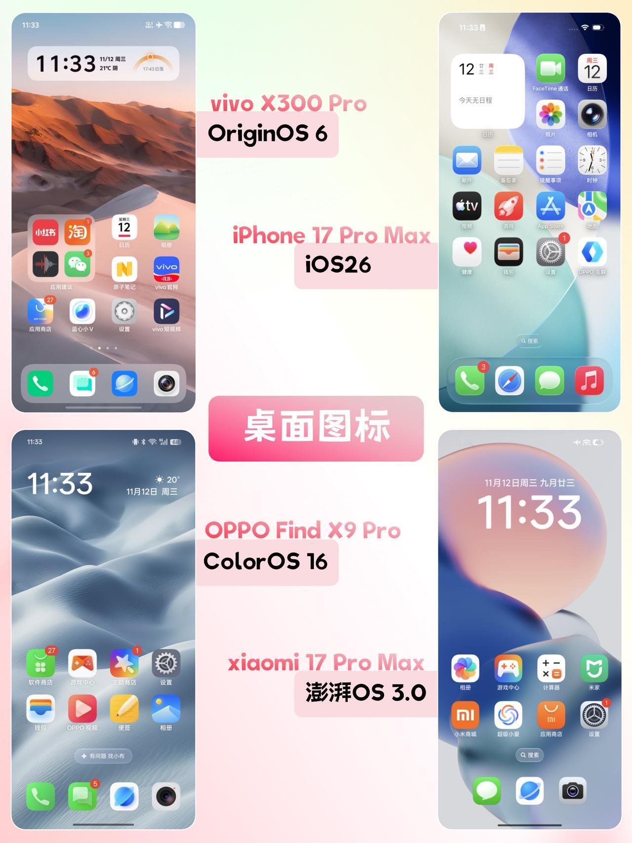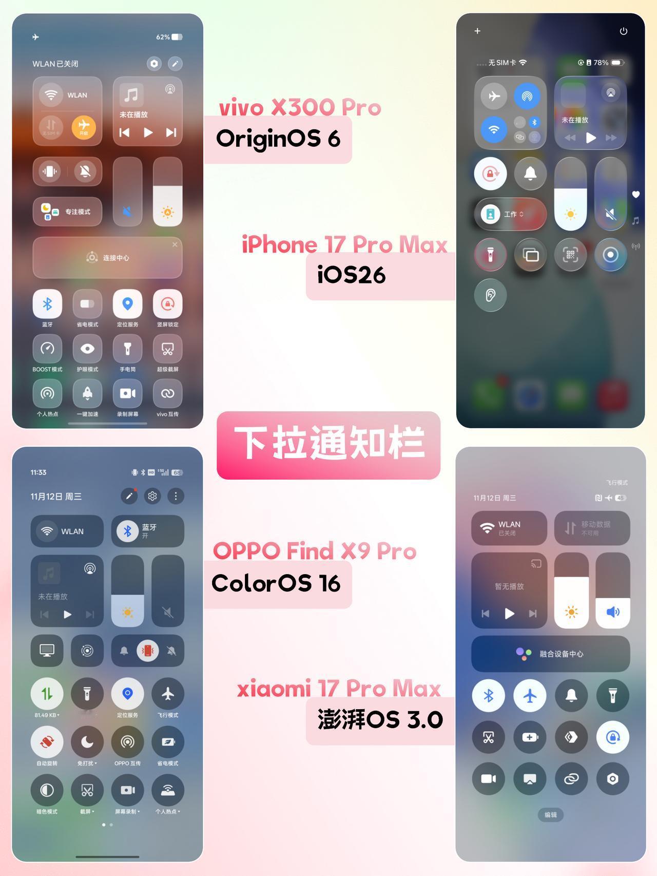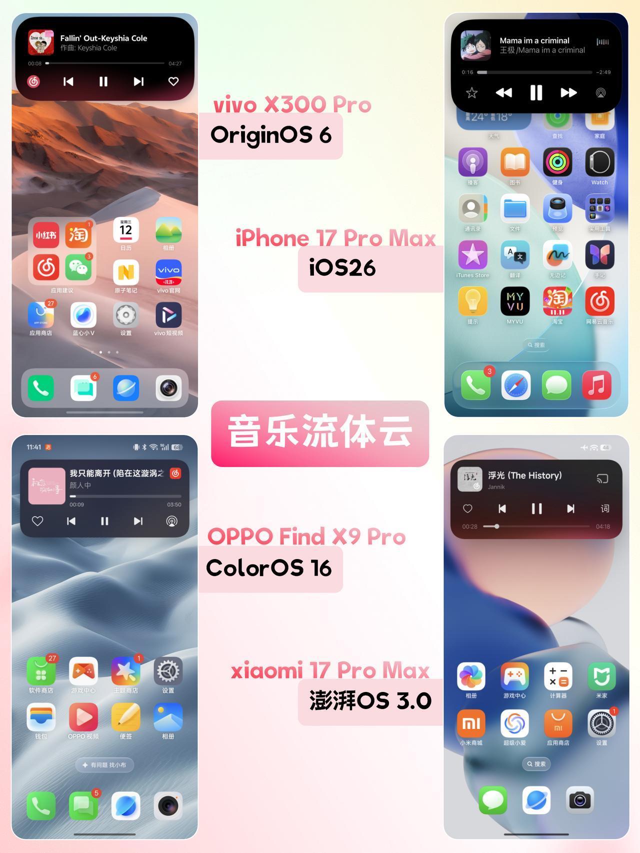 四大手机系统,不看品牌你觉得哪个更好看? 现在的手机不能光看硬件,系统体验也是很重要的一部分,直接对比vivo X300 Pro、OPPO Find X9 Pro、小米17 Pro Max以及iPhone 17 Pro Max,大家觉得哪家系统更好看? 苹果今年的iOS 26改动很大,液态玻璃我个人觉得挺好看的,实用体验也不用多说,系统生态独一份的。vivo的OriginOS 6外观也有点液态那感觉,流畅度也很到位👁 小米的澎湃OS3风格比较年轻化,大版本也上岛了,体验整体更全面了。OPPO的ColorOS 16升级了光场设计,质感高级了许多,机圈德芙的丝滑体验懂得都懂,还有AI一键闪记、AI人像补光等实用AI功能,优化还很好,配上Find X9 Pro的7500mAh电池续航是相当给力了。 要我选的话,我会更喜欢Find X9 Pro的ColorOS 16,丝滑节能,加上7500mAh🔋续航还很强,大家会选谁呢?