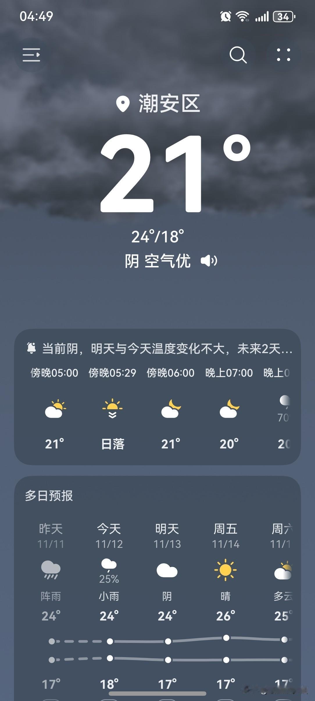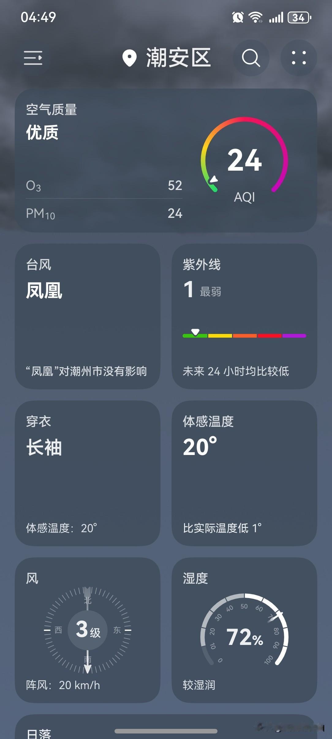 台风靠近浙江已进入风雨影响最强阶段, 随着台风“凤凰”趋近台湾岛, 其外围环流对浙江的影响愈发明显。 冷空气+台风“凤凰”外围气流双重暴击, 广东降温又降雨! 暂时告别“短袖+短裤+拖鞋”夏日三件套, “长袖+长裤+外套”秋季三件套齐登场! 今天还穿短袖的小伙伴们! 敬你们是条汉子! 反正我是挨不了一点冻的, 穿少一点出门就瞬间觉得自己变年轻了, 因为被冻得跟孙子似的! 今天(12日), 潮州阴天有雨, 气温18~24℃, 此刻气温21℃, 体感温度20℃。 一整天都阴阴沉沉的, 没有阳光的日子, 心情有点压抑啊! 五点不到, 天色已经开始暗下来了。 因为天气的缘故, 最近几天下班回到家都要比平时晚一些。 天色渐暗, 路况又不好, 视线范围被限制, 车速自然就慢下来了, 回家的路也觉得漫长了……