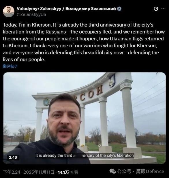 昨天是赫尔松光复三周年,泽连斯基亲自前往赫尔松纪念,此举对目前的乌克兰来说极具意义,毕竟,乌克兰已经很久没有在战场上取得重大胜利或收复重要城市、地区了。赫尔松是自2022年开战后,俄军占领的乌克兰最大城市和唯一的中心城市,目前位于俄军火力打击范围内,城市遭到严重破坏,泽连斯基前往赫尔松,虽然或许不像前往波克罗夫斯克等正在激战的乌克兰城市那样,但依然冒着巨大风险,仅仅从这一点来说,作为战时总统,泽连斯基绝对合格,极为勇敢。泽连斯基誓言要收复所有被俄罗斯军队占领的乌克兰城镇,回忆了三年前乌克兰国旗重新在赫尔松升起时的喜悦、泪水和感激之情。“此刻我正在赫尔松,这座城市从俄军手中光复已满三周年——当年占领者仓皇溃逃的场景历历在目,我们始终铭记是同胞们的无畏壮举让这一切成为现实,让乌克兰国旗重新飘扬在赫尔松市区上空。我谨向每一位曾为收复赫尔松而战的勇士致敬,也向所有正在守护这座美丽城市的守卫者致谢——你们捍卫着同胞们的生命之光。”"我们从未忘记赫尔松(左岸),也不会忘记任何一片被占领土。我们将让所有失地重归家园。"