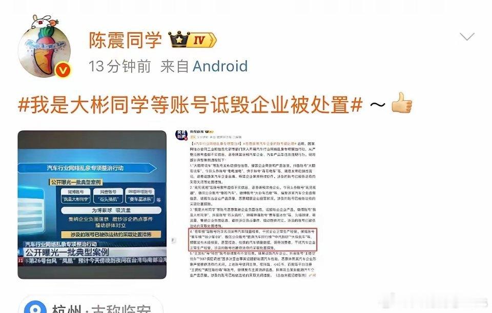 陈震: 我是大彬同学等账号诋毁企业被处置
