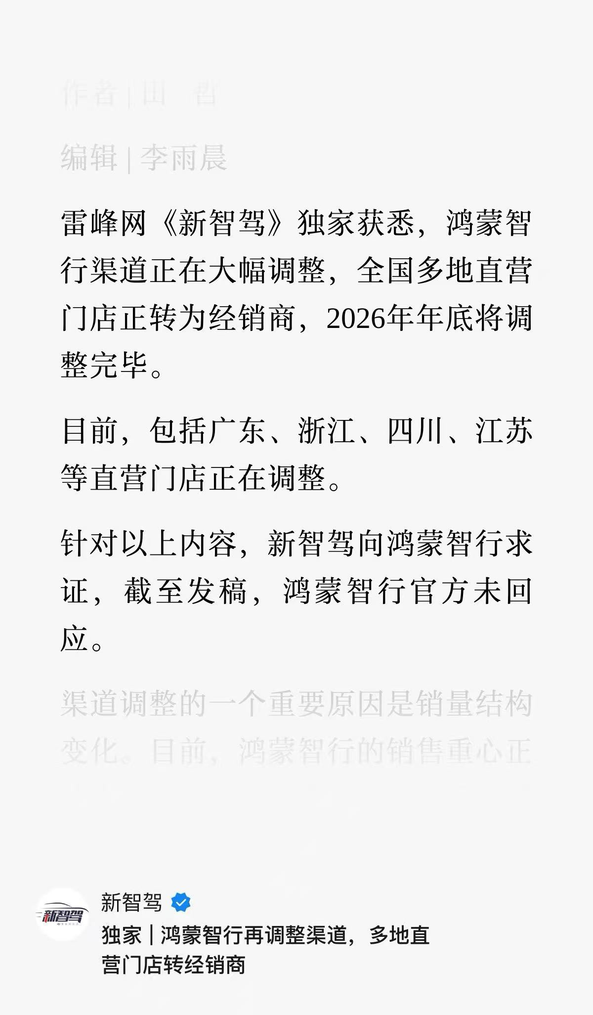 雷峰网《新智驾》独家获悉,鸿蒙智行渠道正在大幅调整,全国多地直营门店正转为经销商,2026年年底将调整完毕。现在鸿蒙智行渠道以经销商为主,直营门店转为经销商是必然趋势。